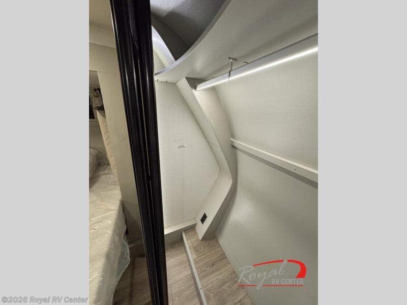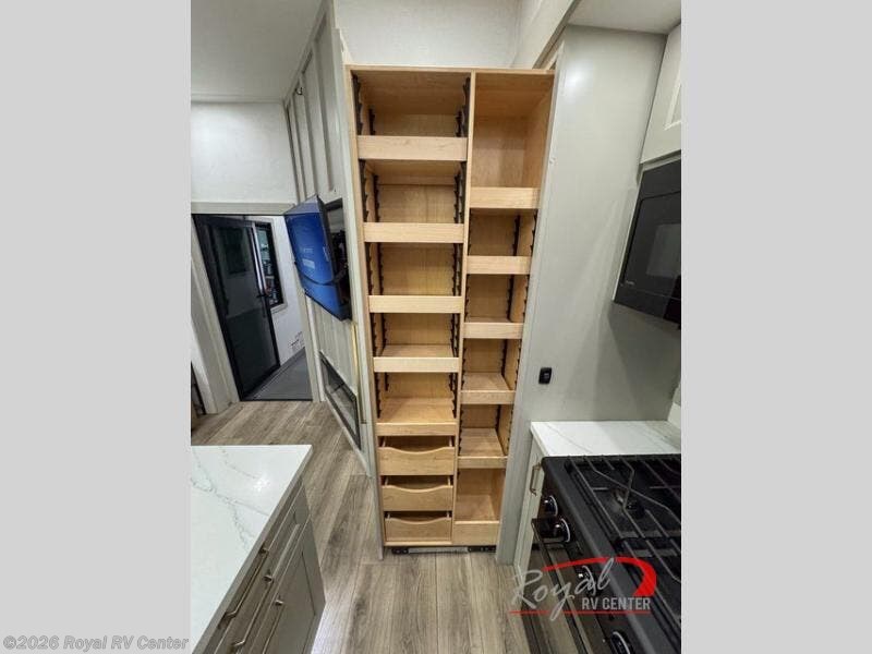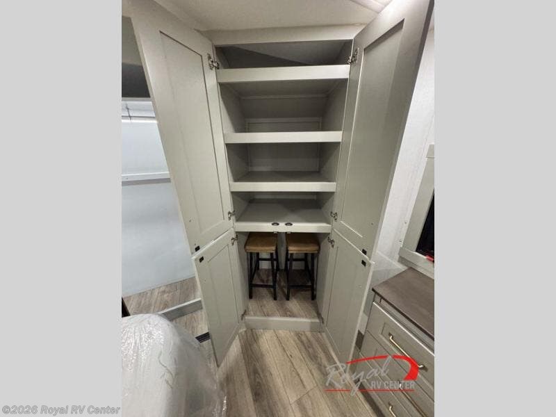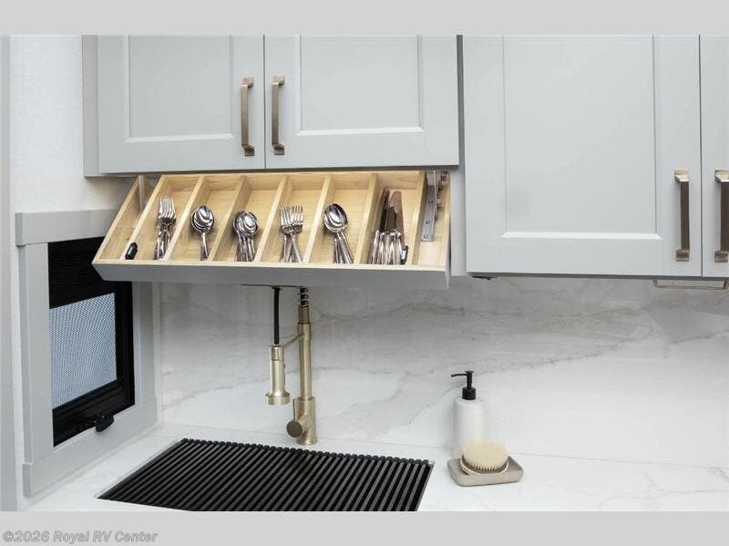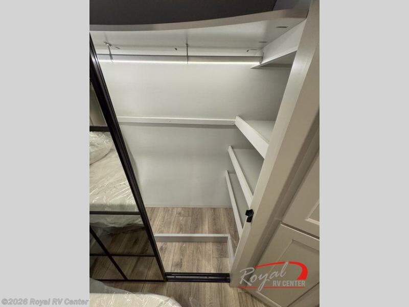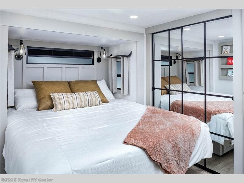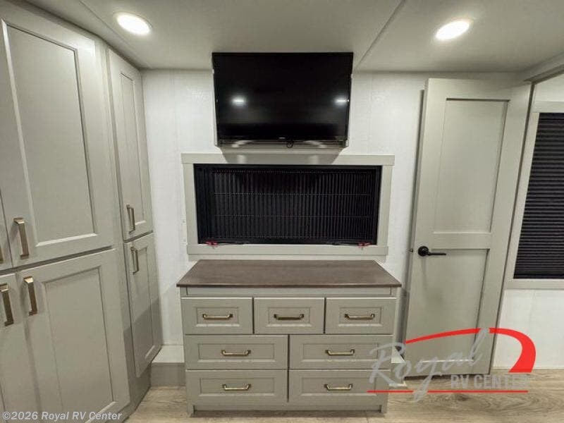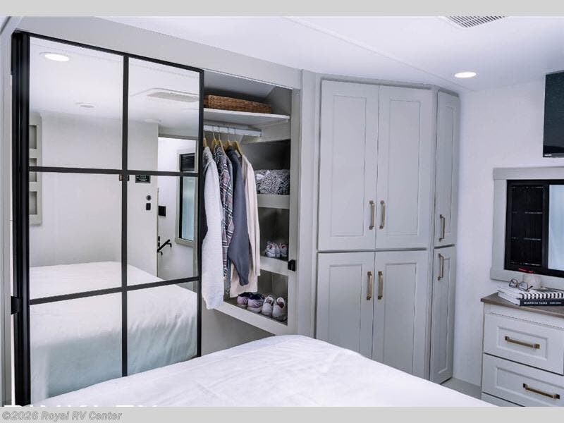 The private front bedroom features a king bed slide-out, walk-in closet, under-bed storage, and a sliding dresser with hidden compartments—perfect for extended stays.