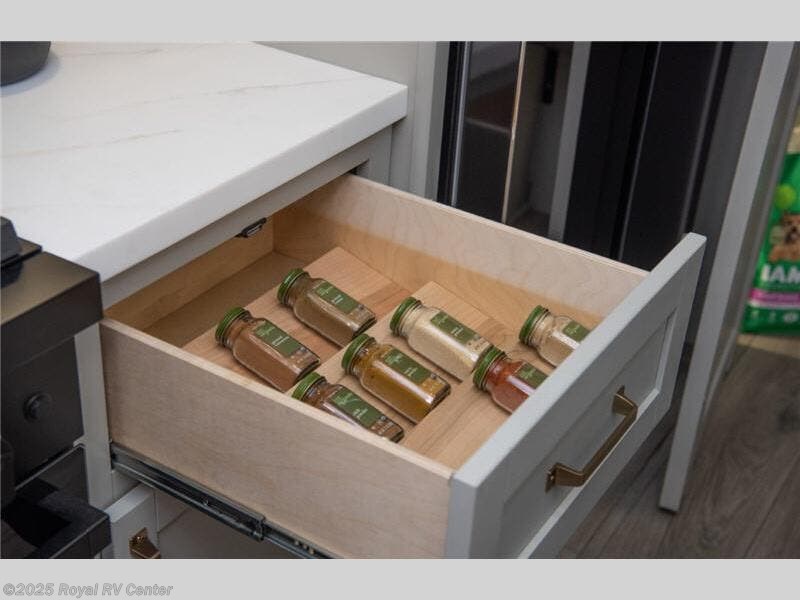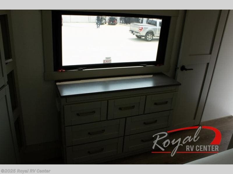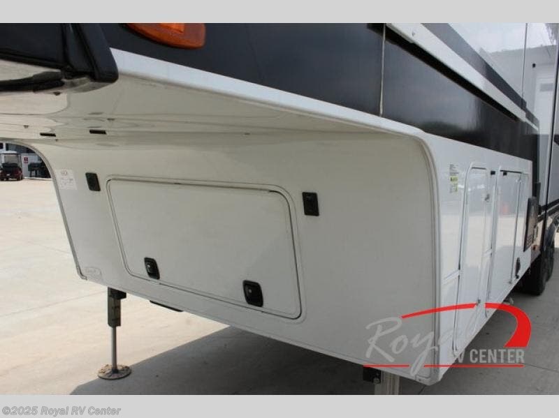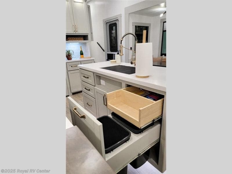 When you want travel accommodations to feel just like home! This Model Z luxury fifth wheel is bright and modern on the inside, with loads of amenities that will have you dreaming of your next trip! Enter and find a spacious combined living/kitchen space thanks to dual opposing slides. There is ample seating with a free standing dinette that includes a built-in utensil drawer, 62" theater seating, and a 72" tri-fold sofa along the rear wall. You can easily relax and enjoy the 50" Smart telescoping TV with a cozy fireplace below. The kitchen offers all that you need to prepare and cook meals just like home with a 16 cu. ft. refrigerator for your perishables, a 30" microwave oven, and three burner range top and oven. You will love the integrated spice rack, and the kitchen island all outfitted with dog bowls and double pull out trash bins with an integrated Stow & Go paper towel holder. There is also an 84" pantry with adjustable shelves for all of your canned and dry goods. Head up the steps to a private master suite with king bed slide. You can opt for the queen bed if you like. A sliding dresser top features hidden storage which is perfect for jewelry and other personal belongings. The front wardrobe features mirrored doors and the corner closet has been prepped for a stackable washer and dryer if you choose to add that option. Relax and enjoy a large bath featuring a linen cabinet, a 30" x 42" shower, and vanity with sink, plus medicine cabinet. You will also appreciate having dual showers on the outside of this unit, and a rear baggage door and mid-coach pass-through storage.