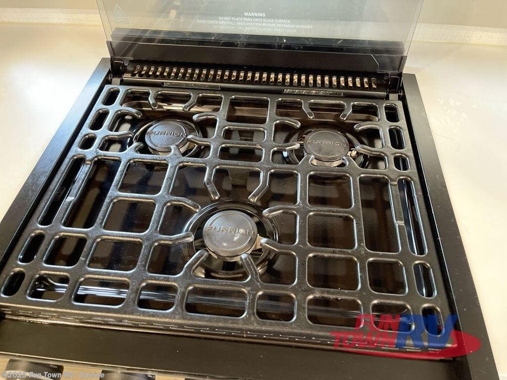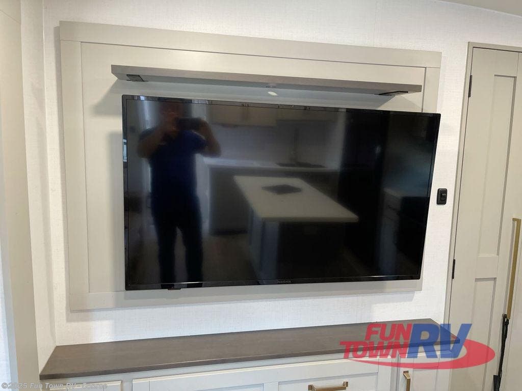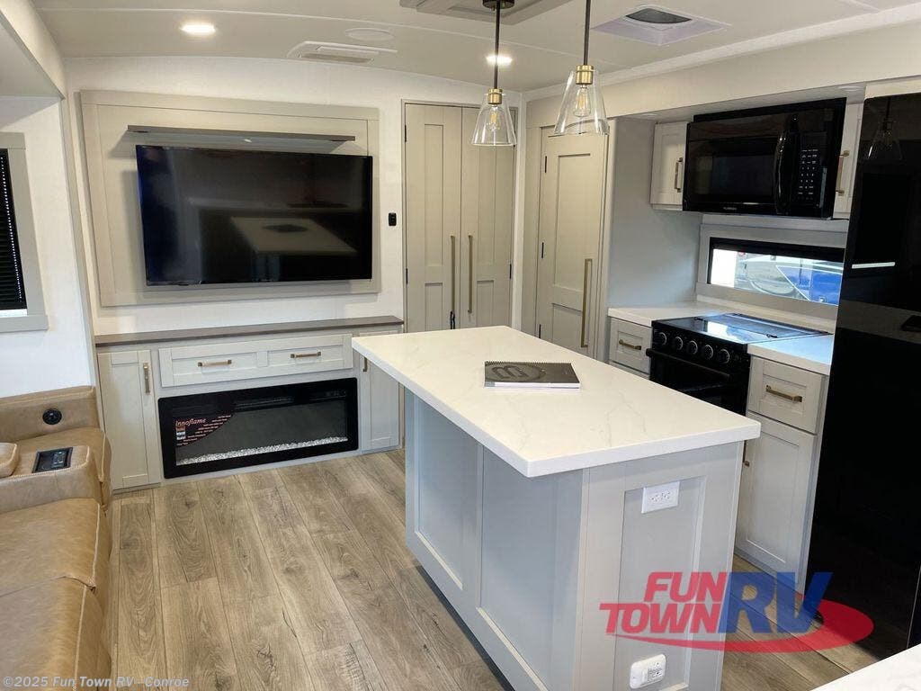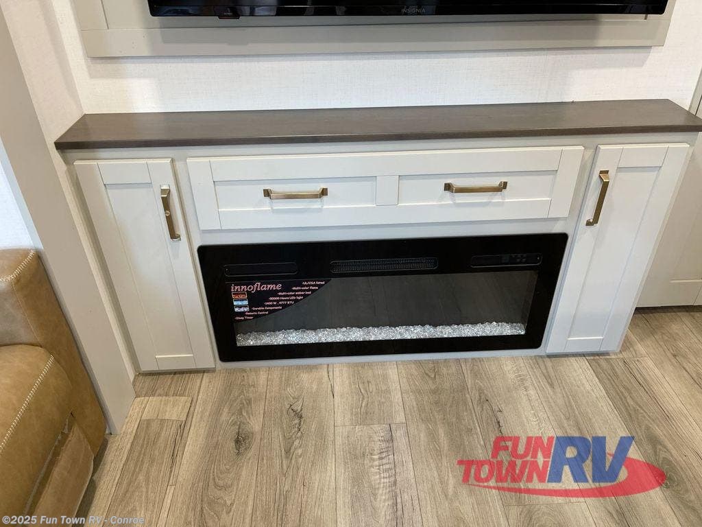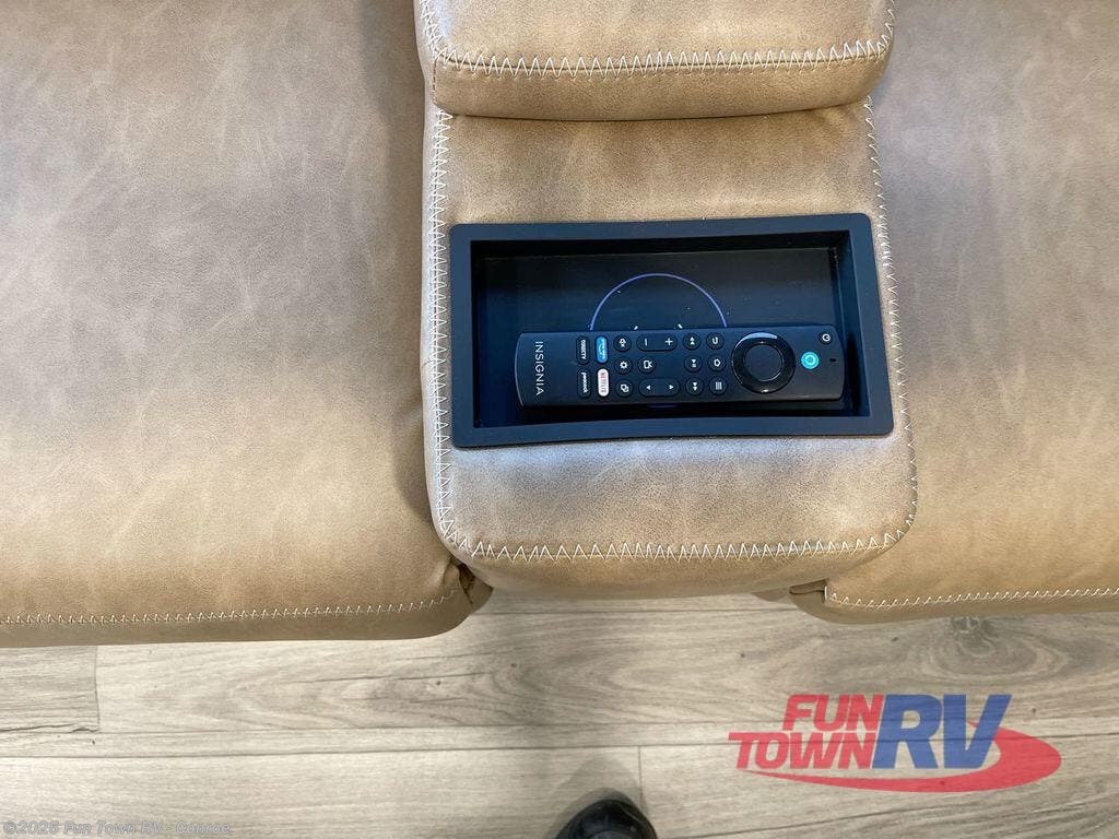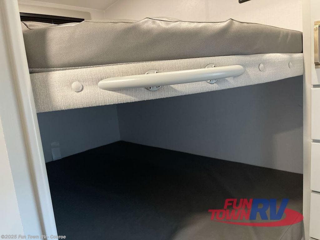 Camping with family or friends just got easier in this spacious travel trailer. There is a rear private bunkhouse with double-size bunks and storage space for your guests' things. You will appreciate your own space in the front private bedroom that includes a queen bed and built-in bedside storage with outlets and USB ports. And the full bath includes a 30" x 42" one-piece fiberglass shower so everyone can stay clean throughout your trip. The combined kitchen and living area will be a favorite place to visit together since there is theater seating with two recliners and a removable table, a TV with swivel, plus a fireplace! You will also enjoy the kitchen island with bar stools, along with additional kitchen counter space, a pantry with adjustable shelves, and a spacious 16 cu. ft. refrigerator that can still open when the slide out is in. Head outside to find drop-frame pass-thru storage and rear storage, two patio awnings, LED chassis lighting, quad step entry, and more!