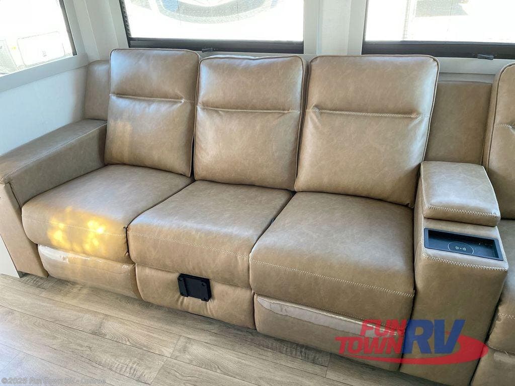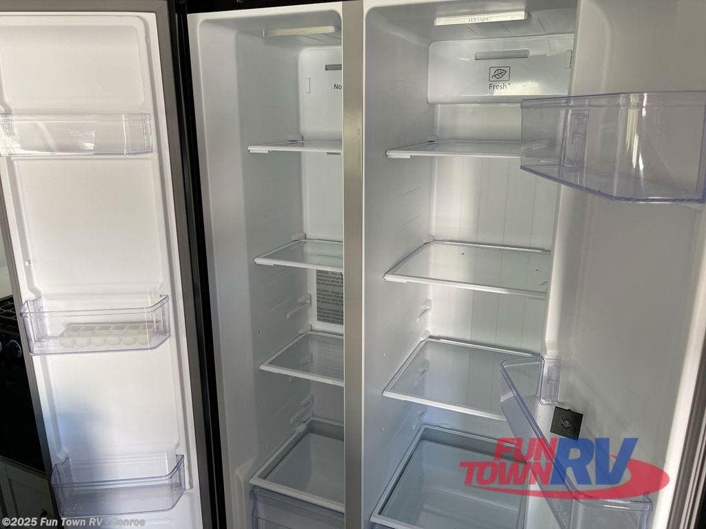 Camping with family or friends just got easier in this spacious travel trailer. There is a rear private bunkhouse with double-size bunks and storage space for your guests' things. You will appreciate your own space in the front private bedroom that includes a queen bed and built-in bedside storage with outlets and USB ports. And the full bath includes a 30" x 42" one-piece fiberglass shower so everyone can stay clean throughout your trip. The combined kitchen and living area will be a favorite place to visit together since there is theater seating with two recliners and a removable table, a TV with swivel, plus a fireplace! You will also enjoy the kitchen island with bar stools, along with additional kitchen counter space, a pantry with adjustable shelves, and a spacious 16 cu. ft. refrigerator that can still open when the slide out is in. Head outside to find drop-frame pass-thru storage and rear storage, two patio awnings, LED chassis lighting, quad step entry, and more!
