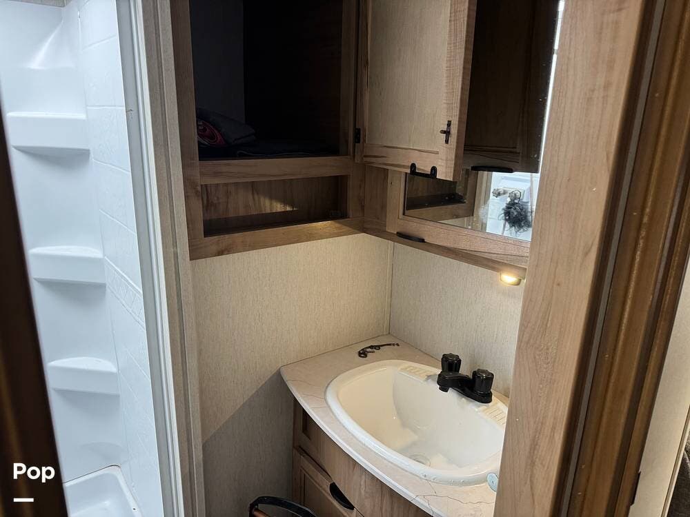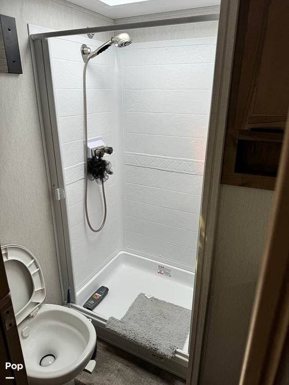 The bathroom is well-appointed with a shower, toilet, and vanity, offering comfort and convenience on the road.