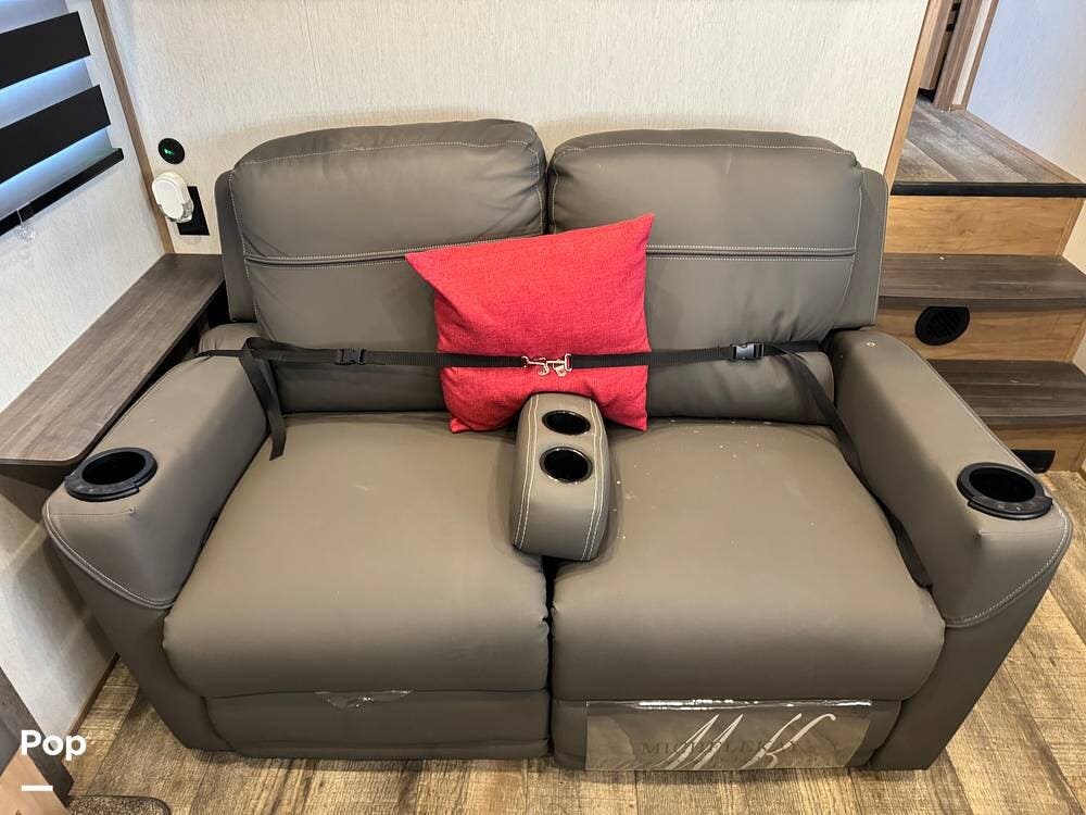 The living area includes plush seating, a comfortable dinette sleeper, and recliners, perfect for relaxing after a day of adventure.