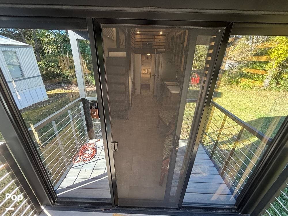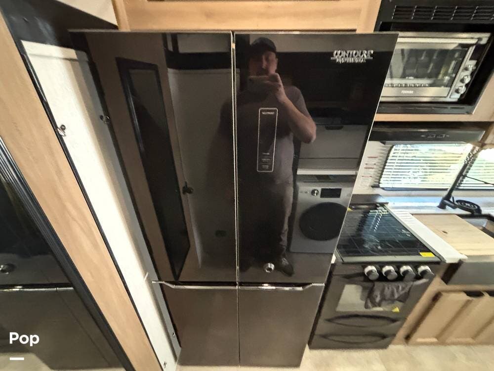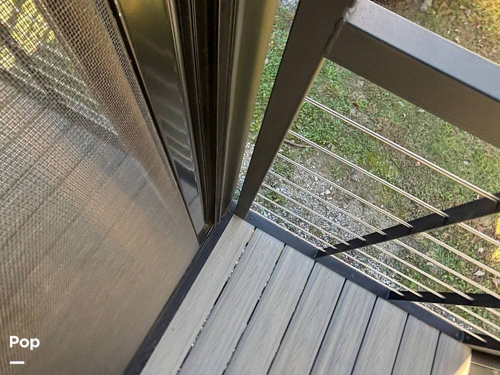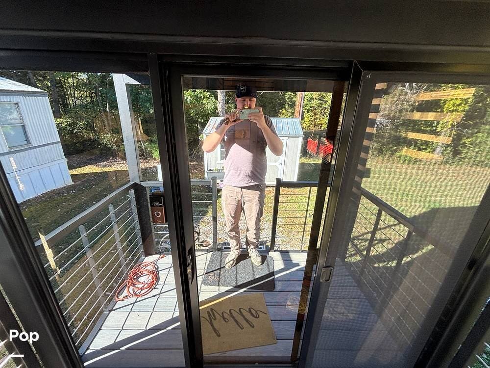 Its exterior is built for durability and ease of use, featuring a solid frame construction, attractive metal sidewalls, and residential-style windows that let in abundant natural light. The front patio doors enhance the residential feel and allow a seamless transition between indoor and outdoor living. Stabilizer jacks provide a solid foundation once parked, while exterior lighting and large storage compartments add practicality and convenience.
