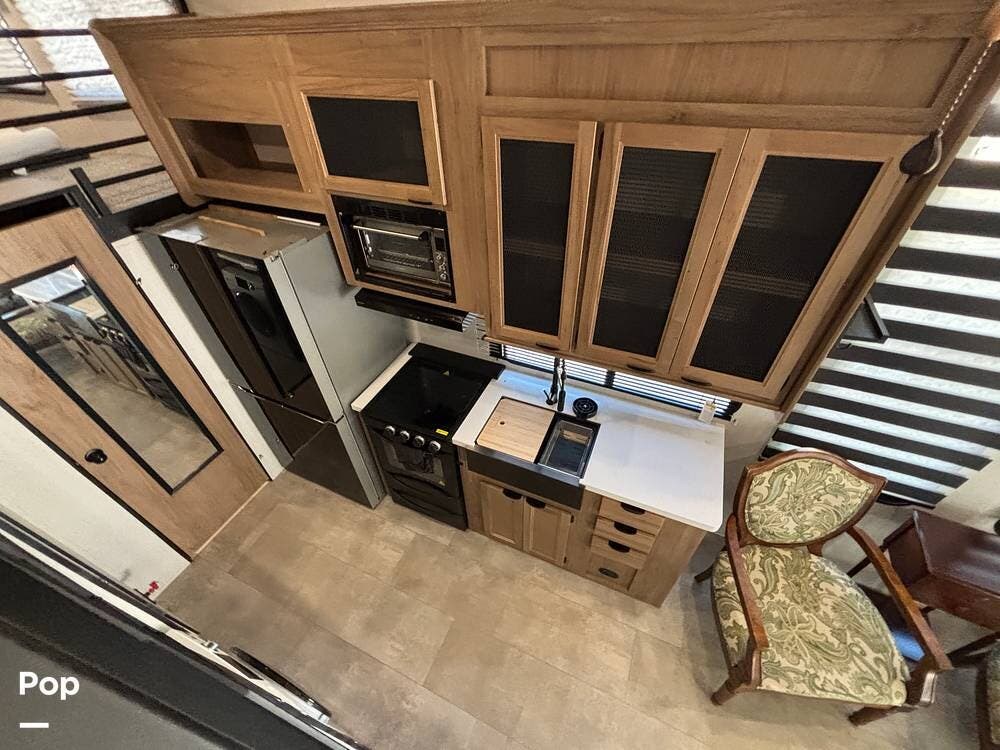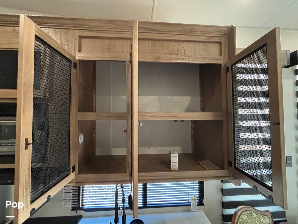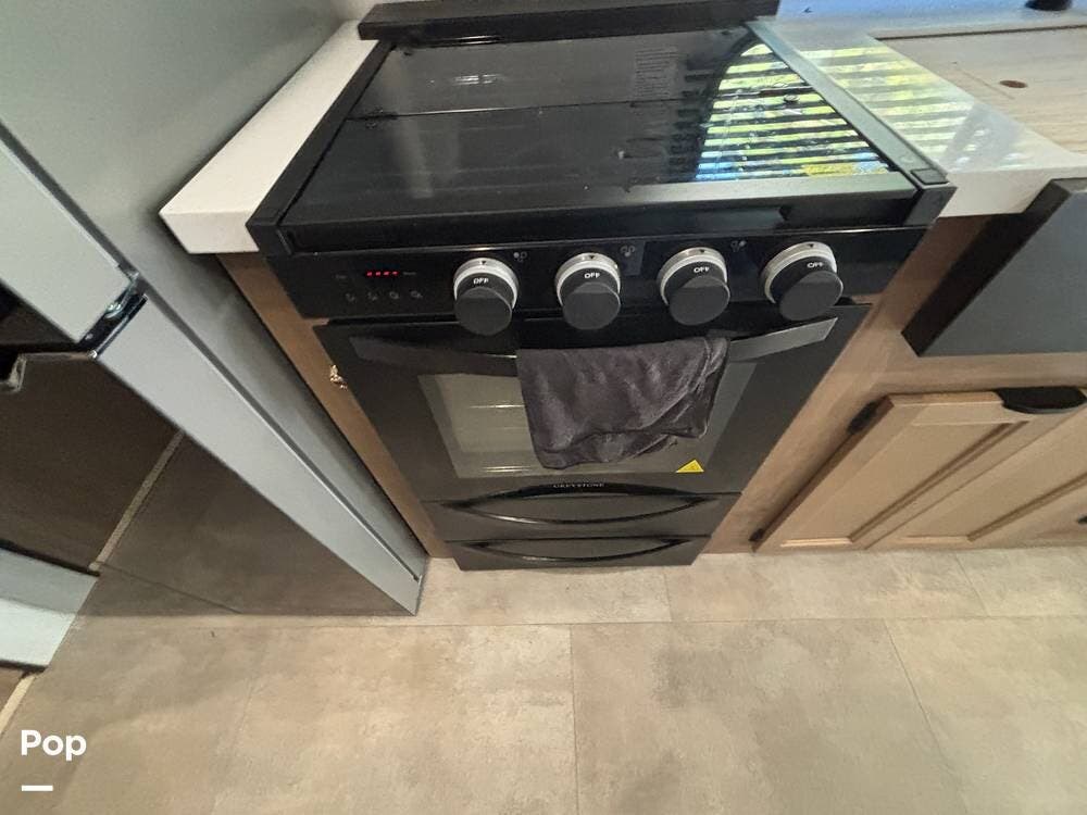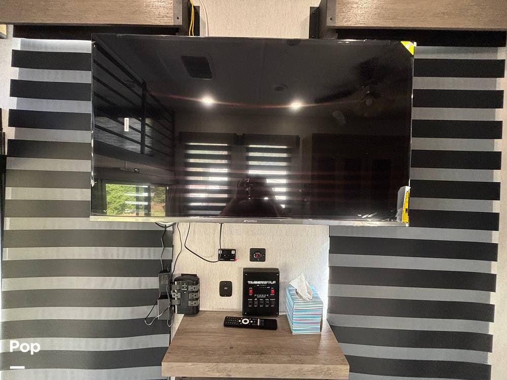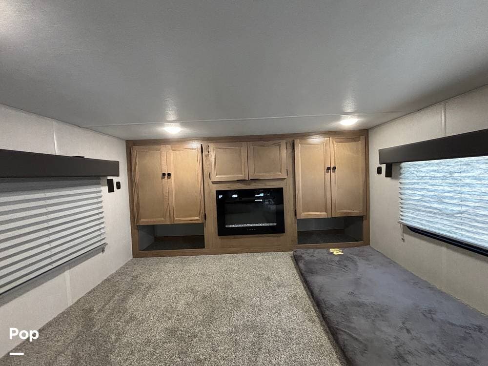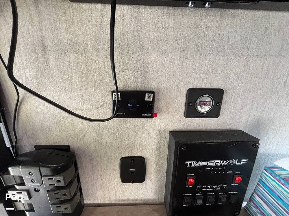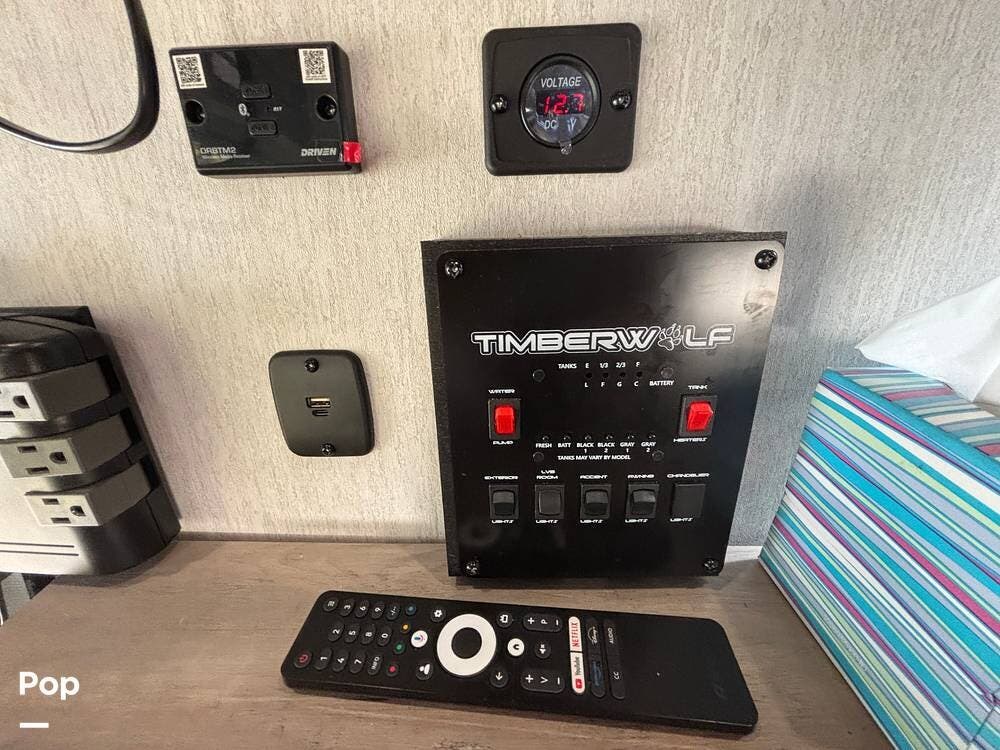Inside, the Timberwolf 20OG welcomes you with a bright, open living area that feels like home. The large windows and sliding glass patio doors create a spacious atmosphere, complemented by residential wood accents and durable flooring. A comfortable sofa and dinette provide plenty of seating for relaxing or entertaining guests, and the entertainment center is positioned for easy viewing. LED lighting and efficient climate control ensure year-round comfort, whether you're using the unit for weekend getaways or full-time living.
