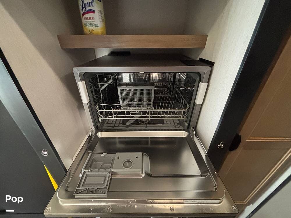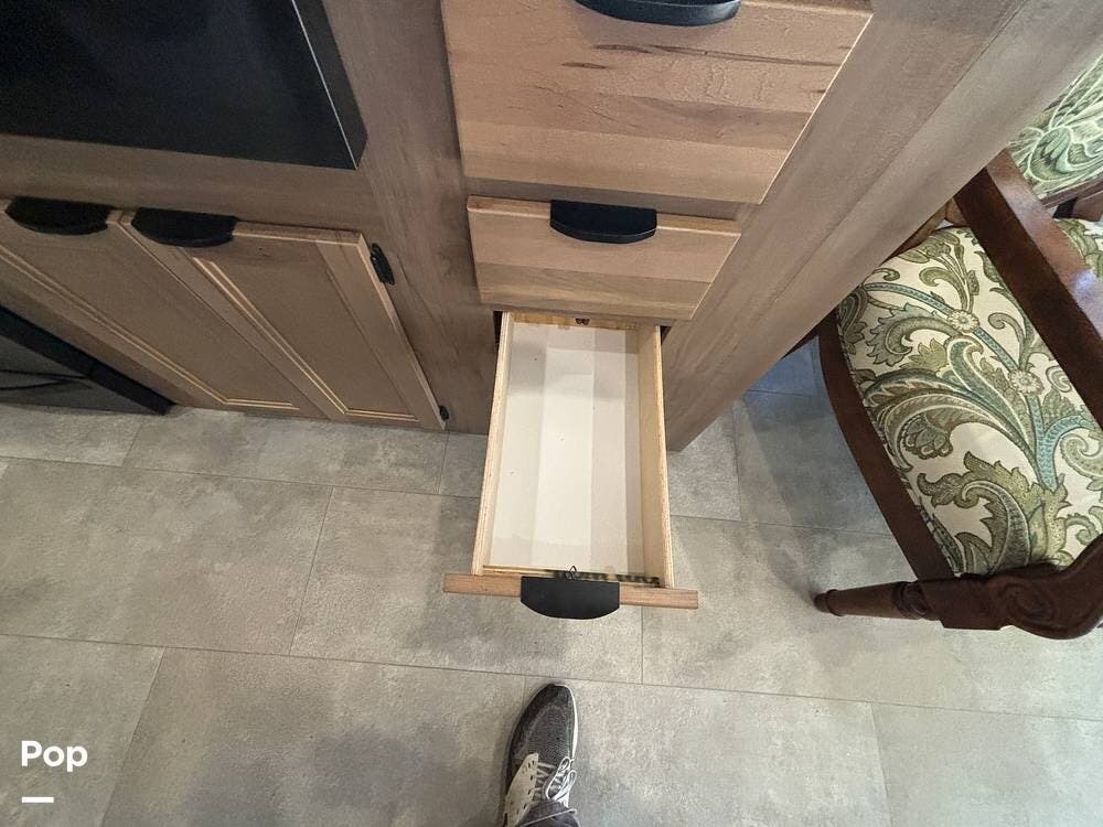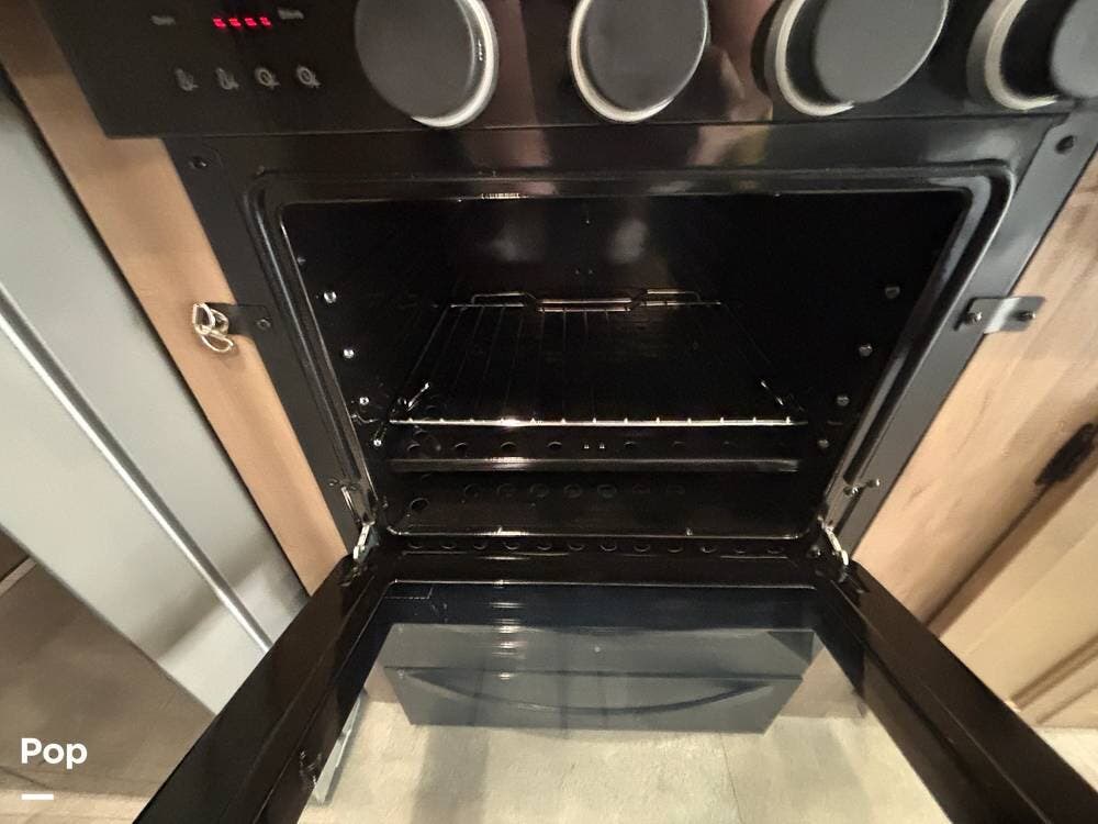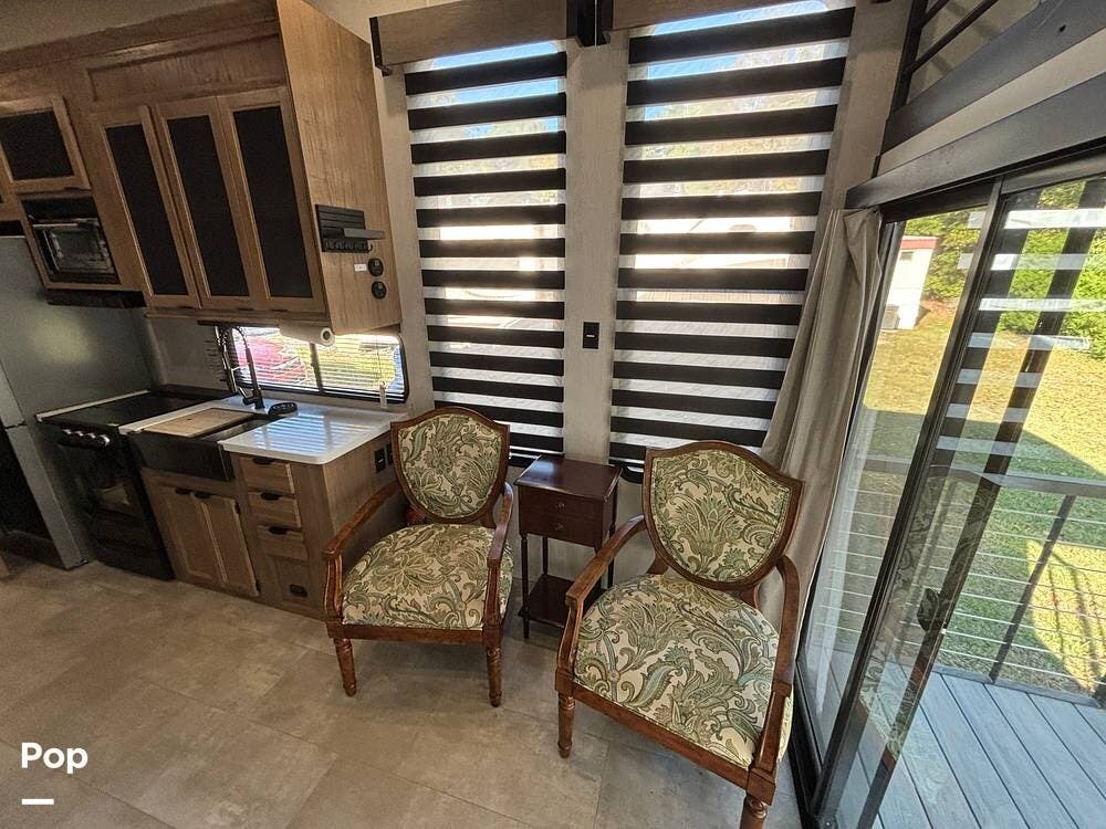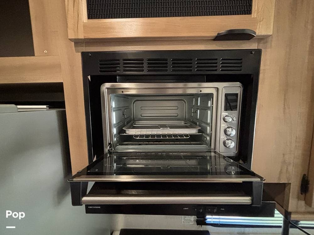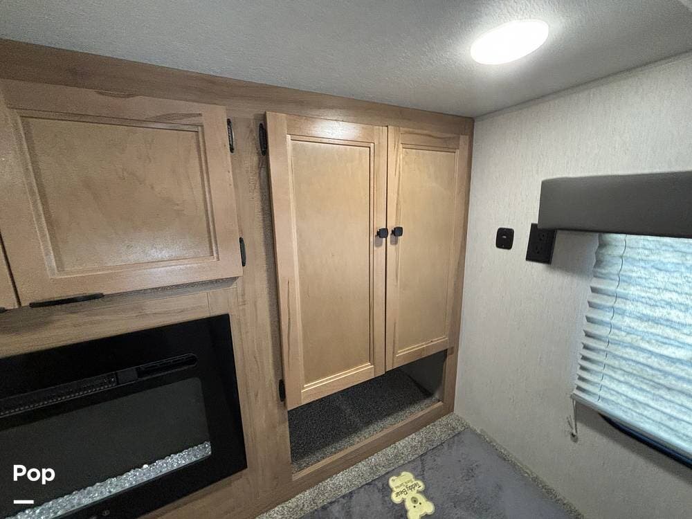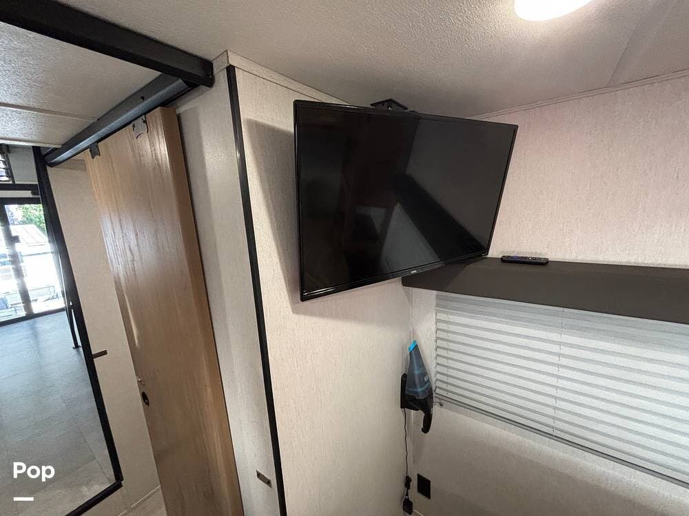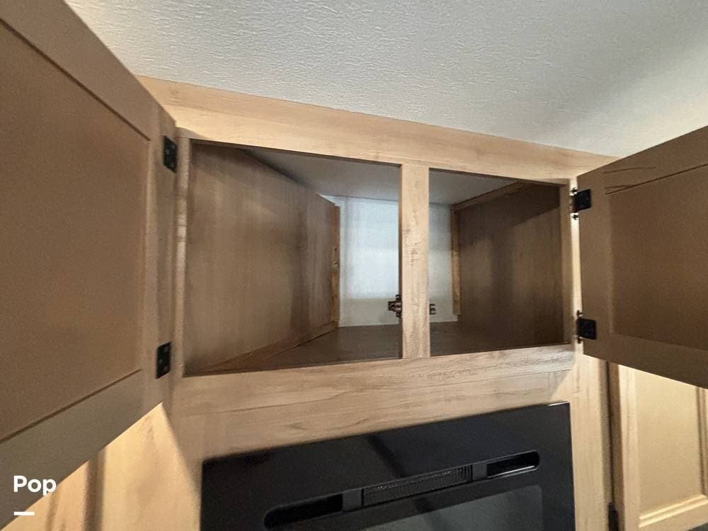 Inside, the Timberwolf 20OG welcomes you with a bright, open living area that feels like home. The large windows and sliding glass patio doors create a spacious atmosphere, complemented by residential wood accents and durable flooring. A comfortable sofa and dinette provide plenty of seating for relaxing or entertaining guests, and the entertainment center is positioned for easy viewing. LED lighting and efficient climate control ensure year-round comfort, whether you're using the unit for weekend getaways or full-time living.