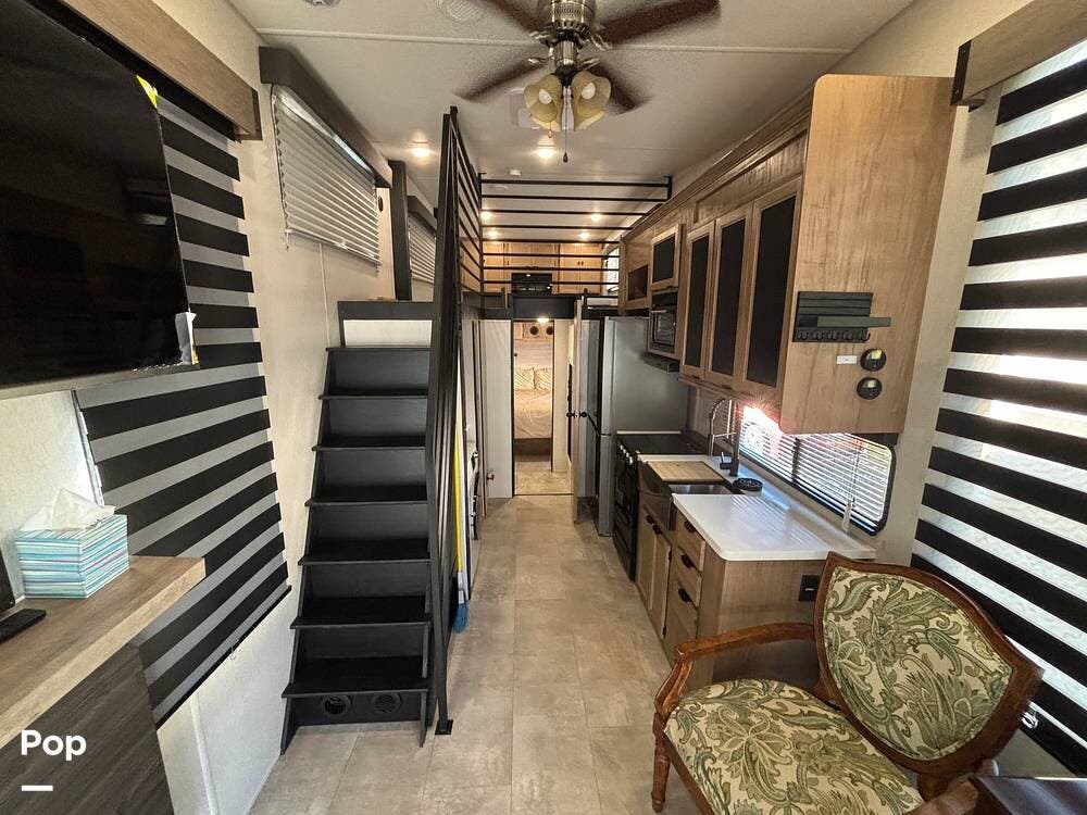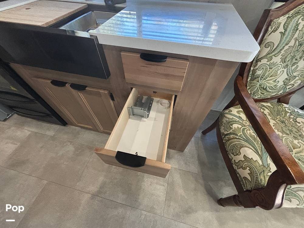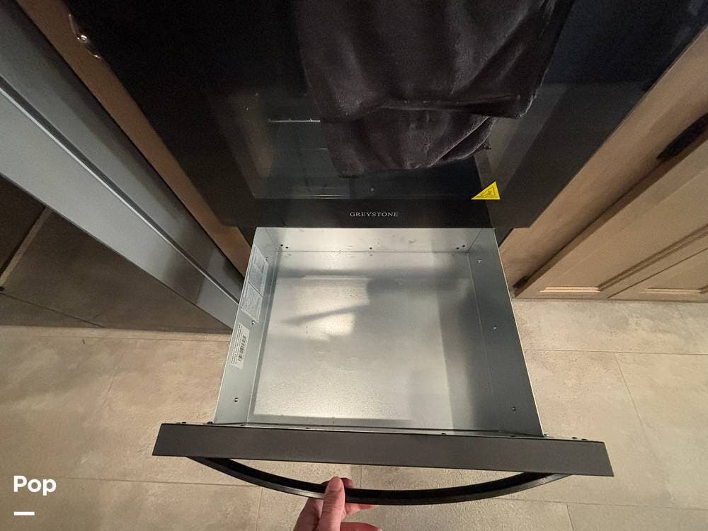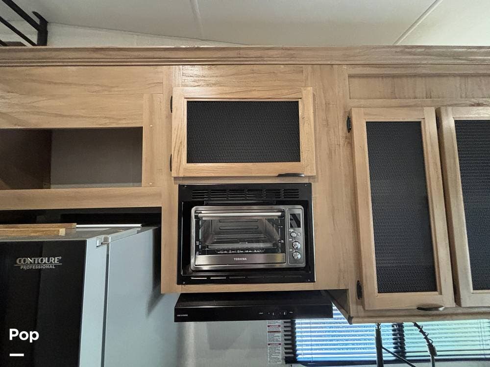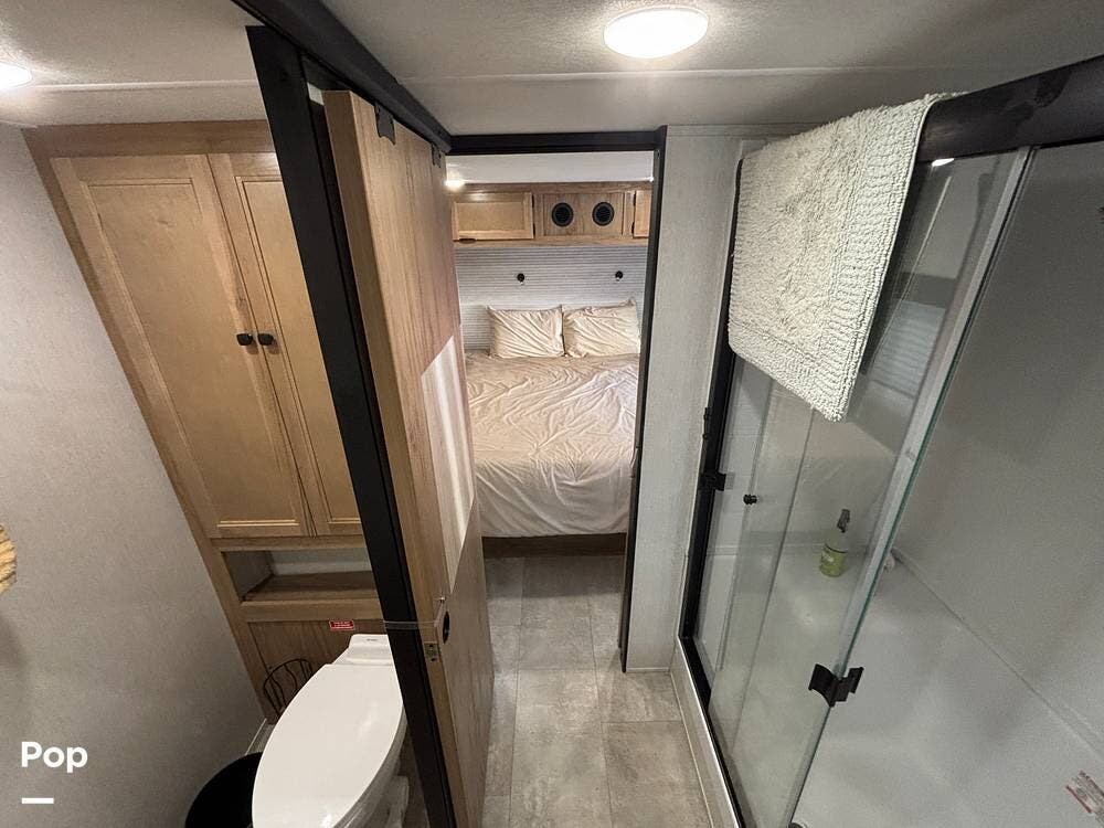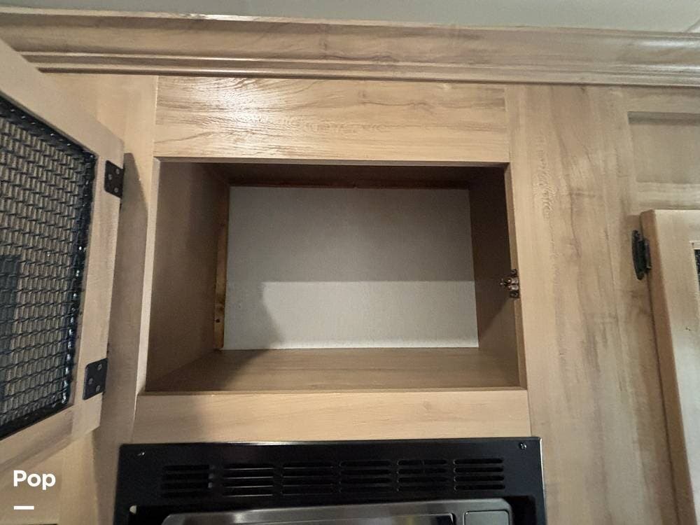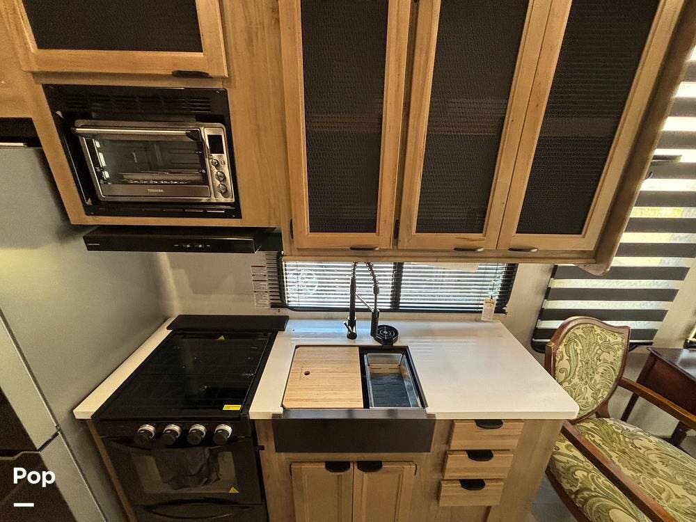 Inside, the Timberwolf 20OG welcomes you with a bright, open living area that feels like home. The large windows and sliding glass patio doors create a spacious atmosphere, complemented by residential wood accents and durable flooring. A comfortable sofa and dinette provide plenty of seating for relaxing or entertaining guests, and the entertainment center is positioned for easy viewing. LED lighting and efficient climate control ensure year-round comfort, whether you're using the unit for weekend getaways or full-time living.