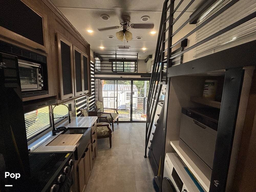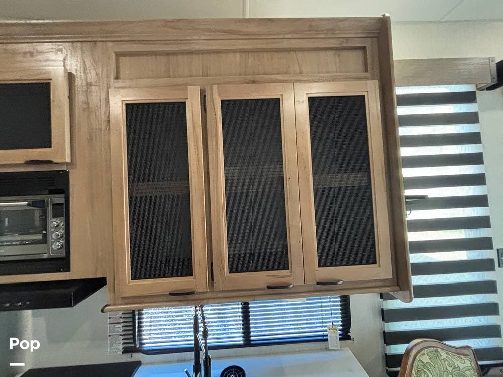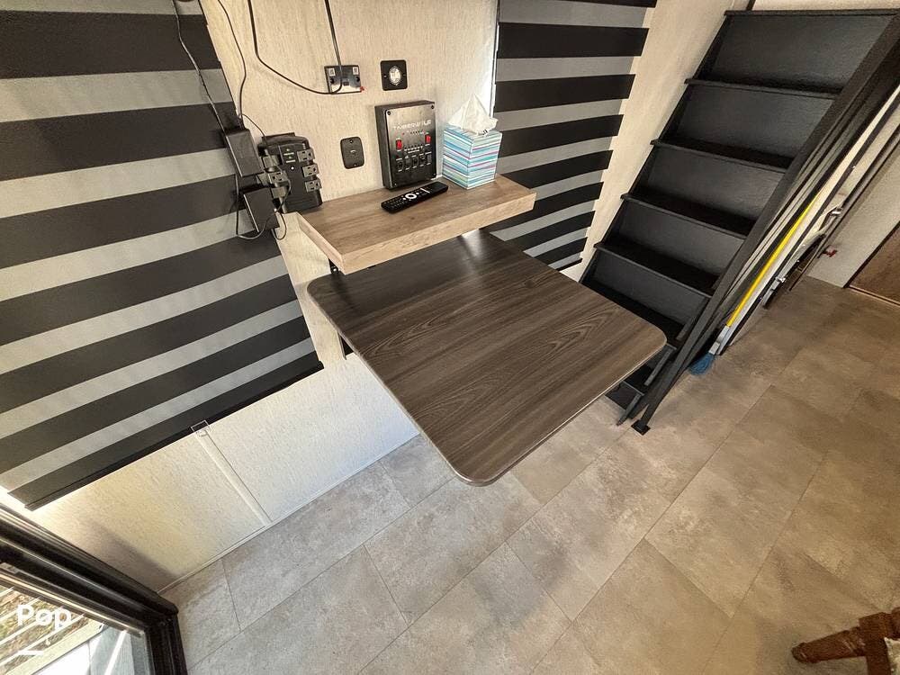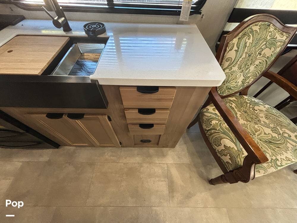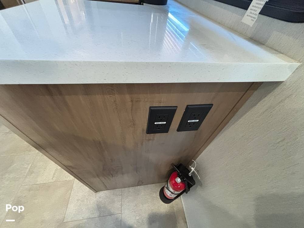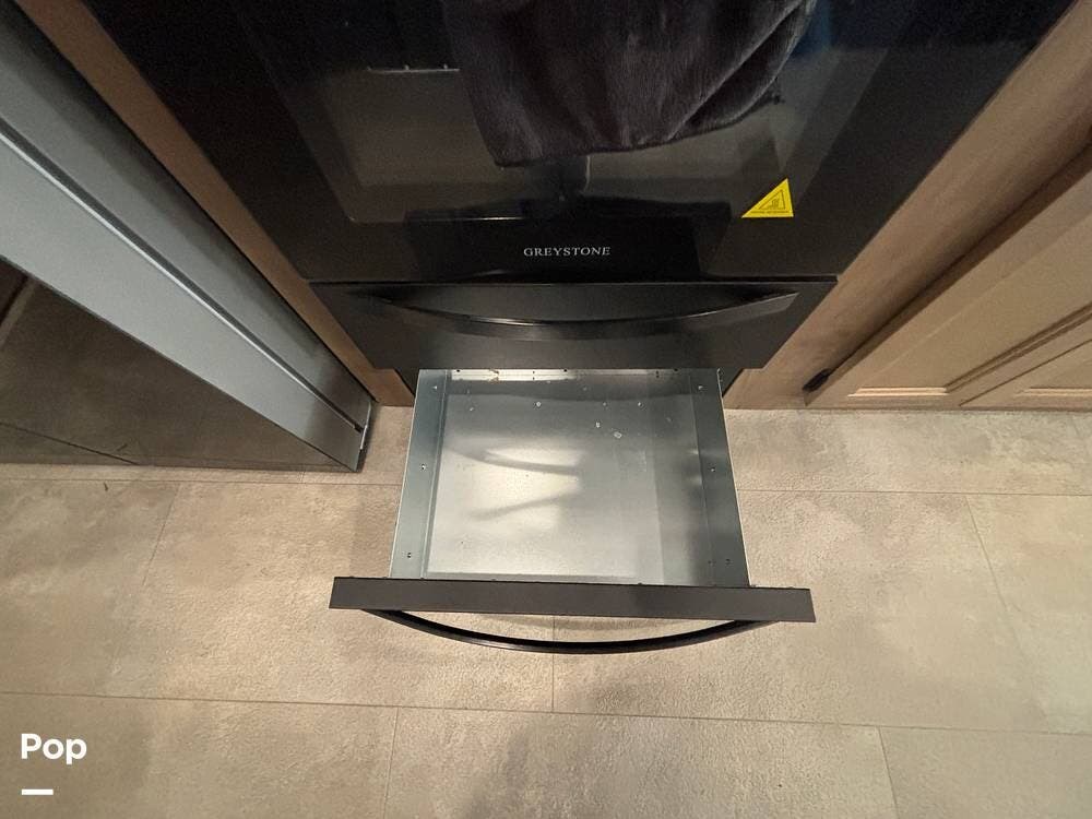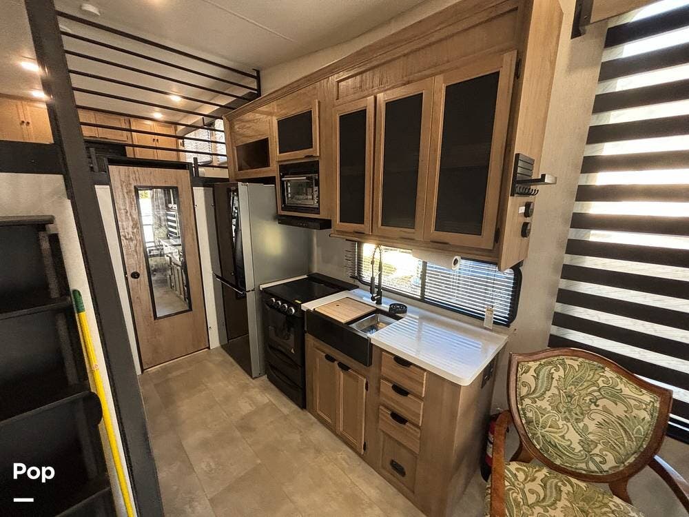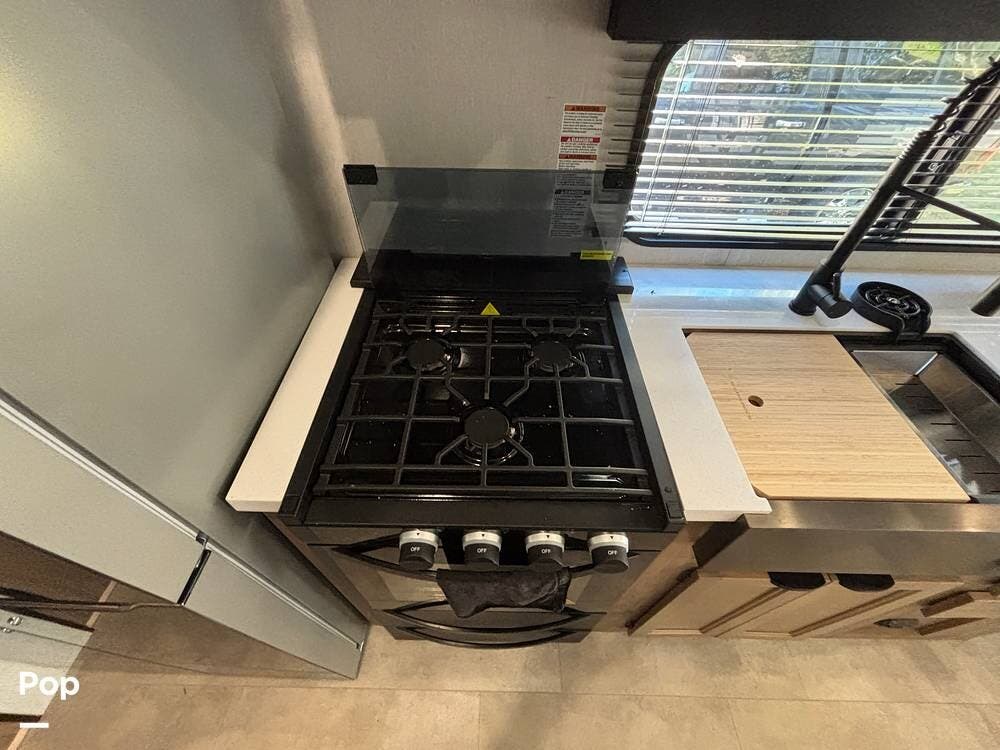 Inside, the Timberwolf 20OG welcomes you with a bright, open living area that feels like home. The large windows and sliding glass patio doors create a spacious atmosphere, complemented by residential wood accents and durable flooring. A comfortable sofa and dinette provide plenty of seating for relaxing or entertaining guests, and the entertainment center is positioned for easy viewing. LED lighting and efficient climate control ensure year-round comfort, whether you're using the unit for weekend getaways or full-time living.