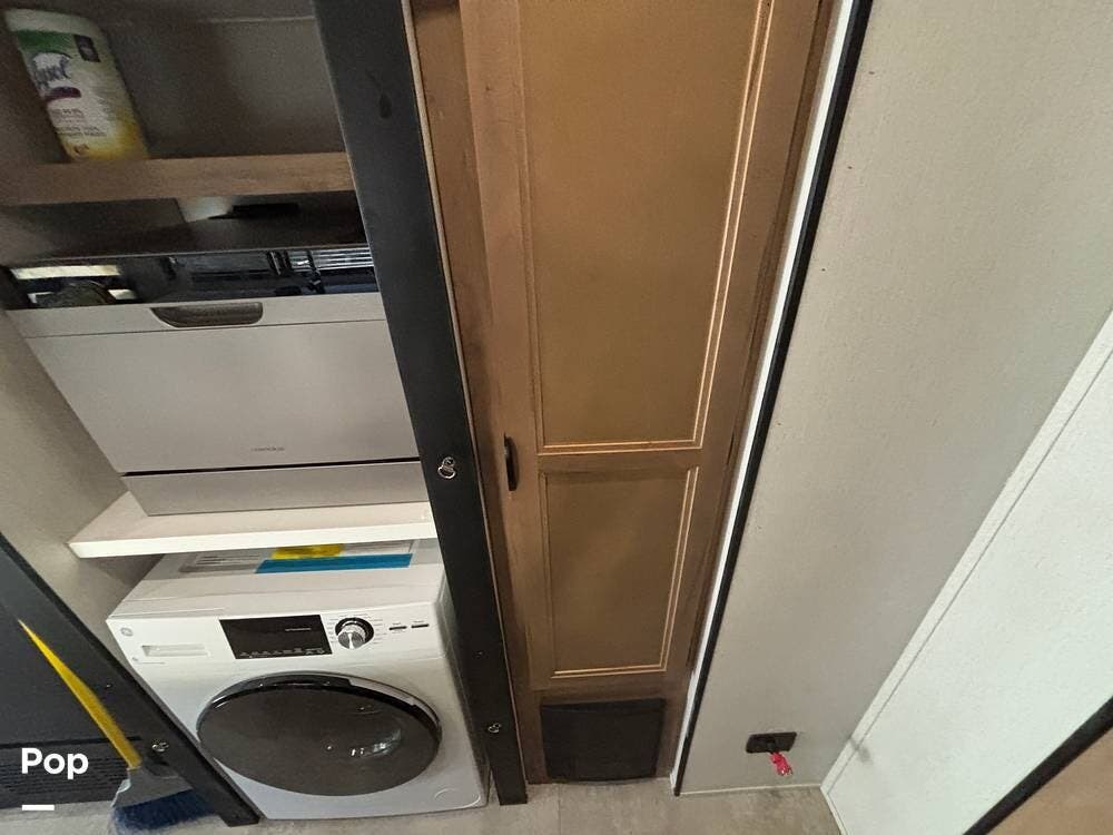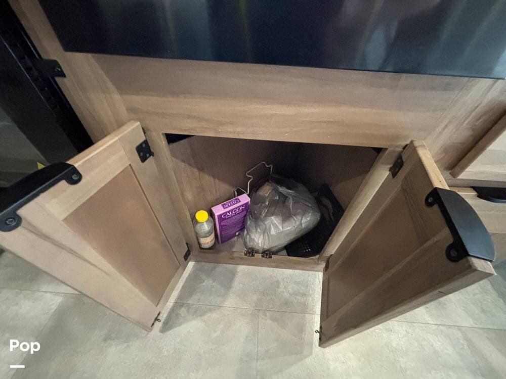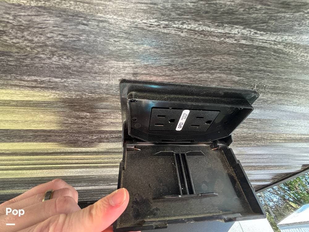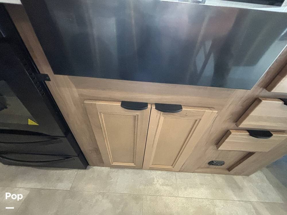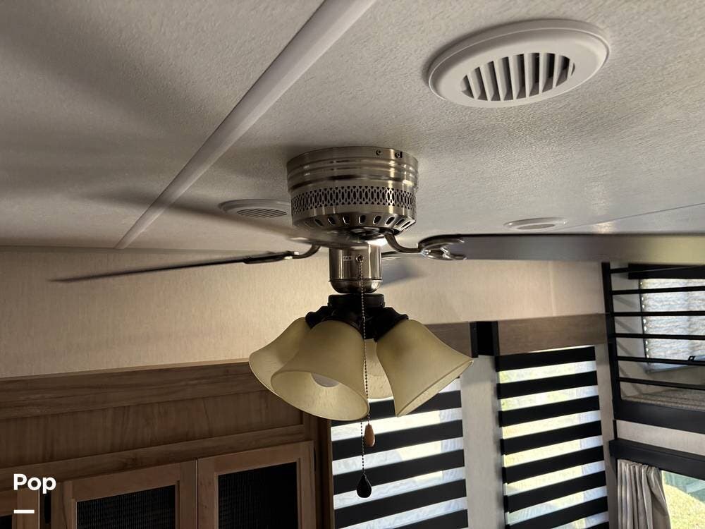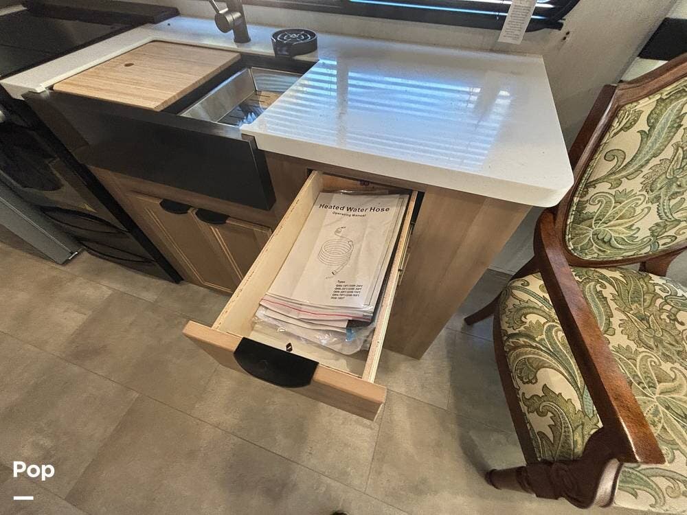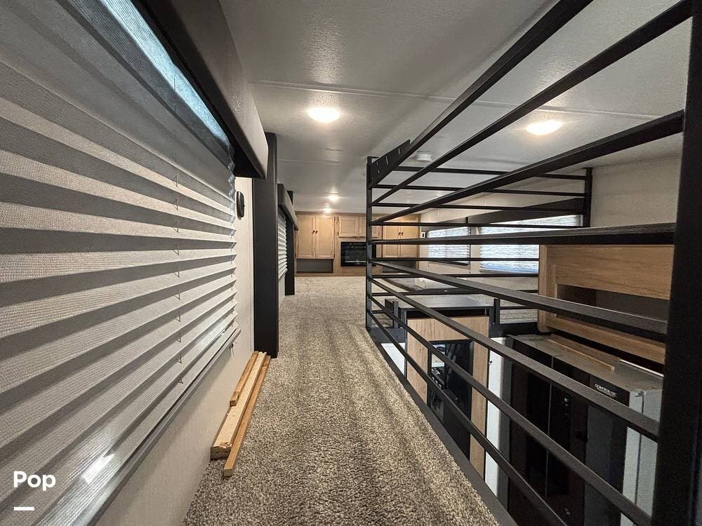 Inside, the Timberwolf 20OG welcomes you with a bright, open living area that feels like home. The large windows and sliding glass patio doors create a spacious atmosphere, complemented by residential wood accents and durable flooring. A comfortable sofa and dinette provide plenty of seating for relaxing or entertaining guests, and the entertainment center is positioned for easy viewing. LED lighting and efficient climate control ensure year-round comfort, whether you're using the unit for weekend getaways or full-time living.