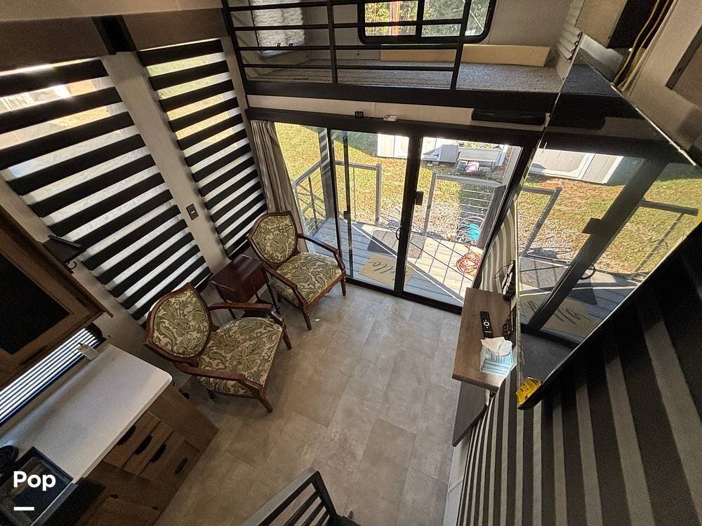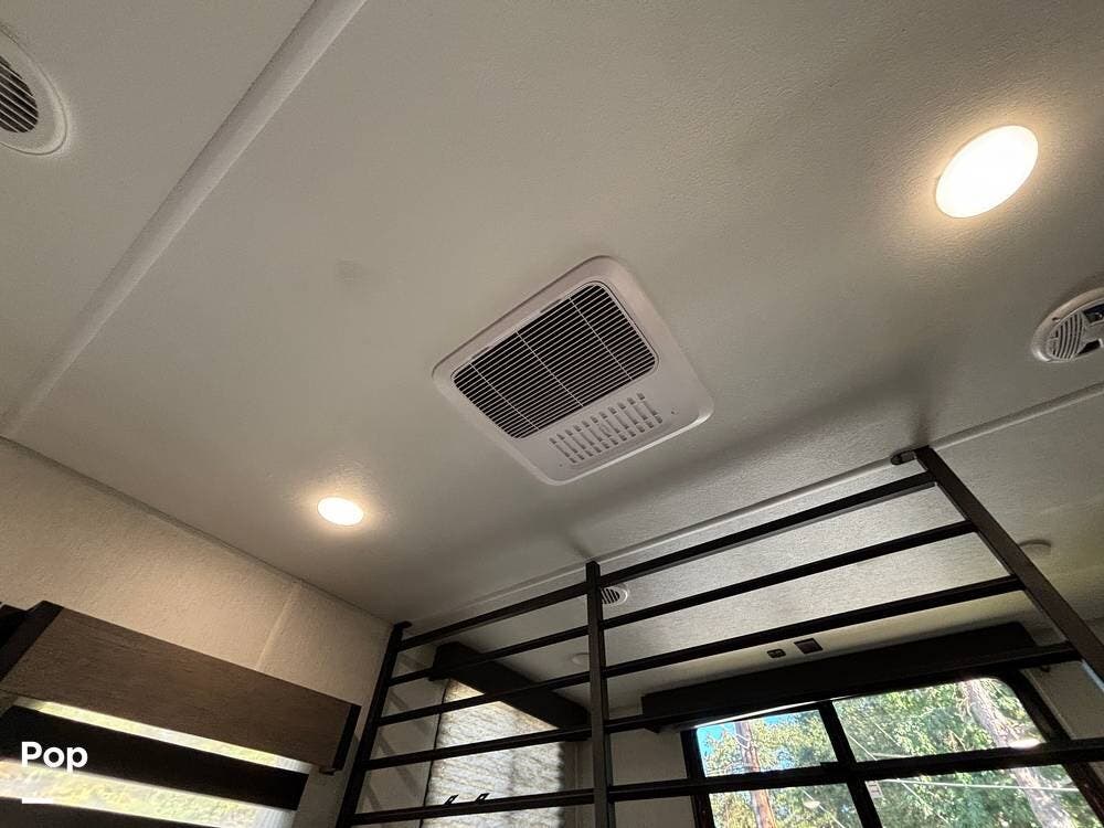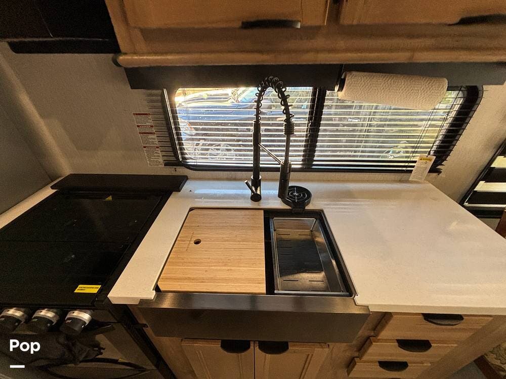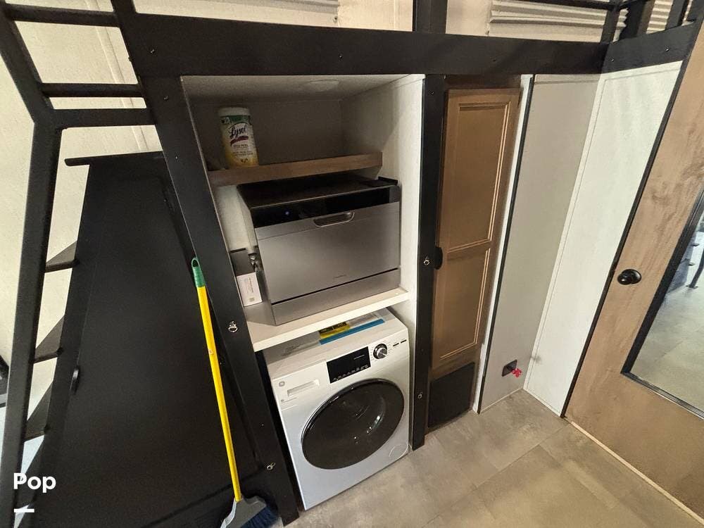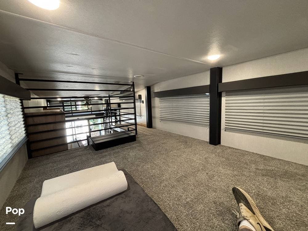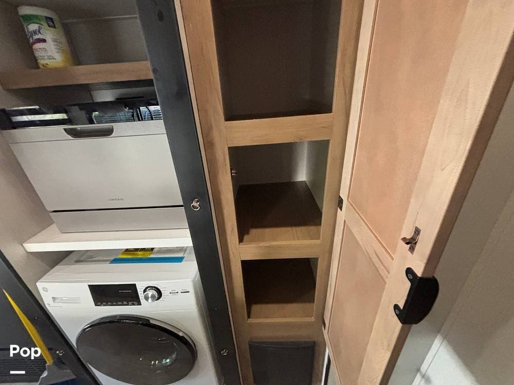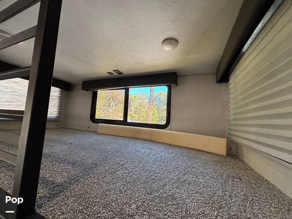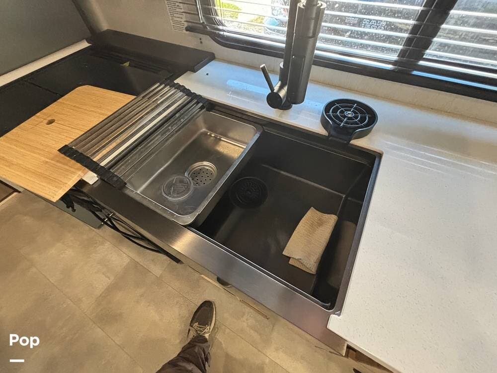 Inside, the Timberwolf 20OG welcomes you with a bright, open living area that feels like home. The large windows and sliding glass patio doors create a spacious atmosphere, complemented by residential wood accents and durable flooring. A comfortable sofa and dinette provide plenty of seating for relaxing or entertaining guests, and the entertainment center is positioned for easy viewing. LED lighting and efficient climate control ensure year-round comfort, whether you're using the unit for weekend getaways or full-time living.