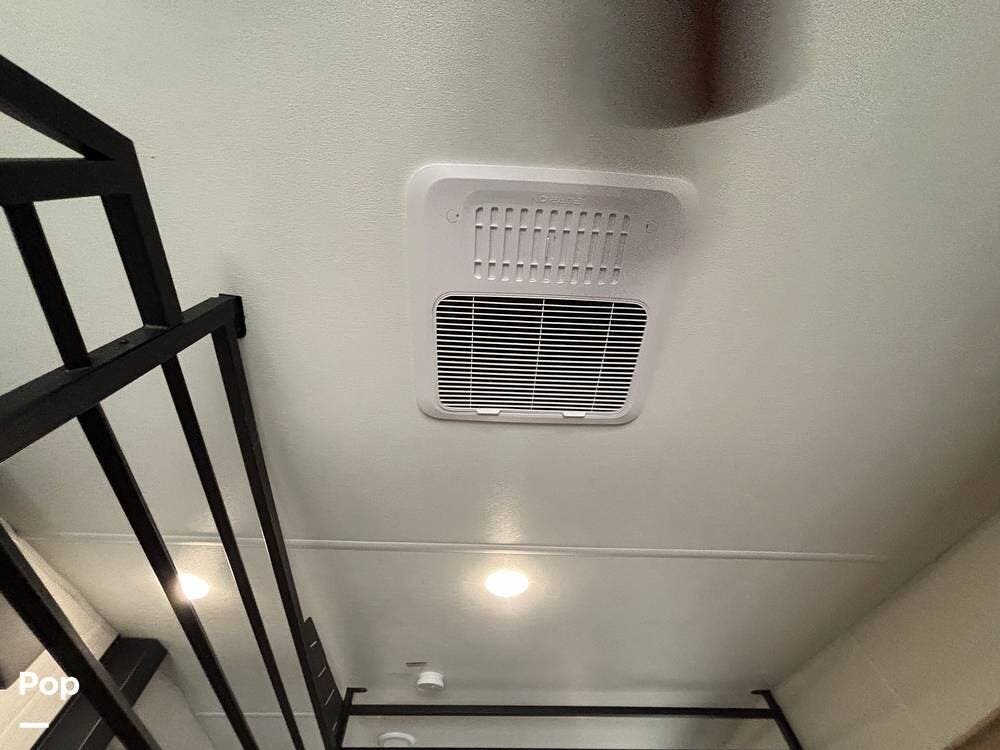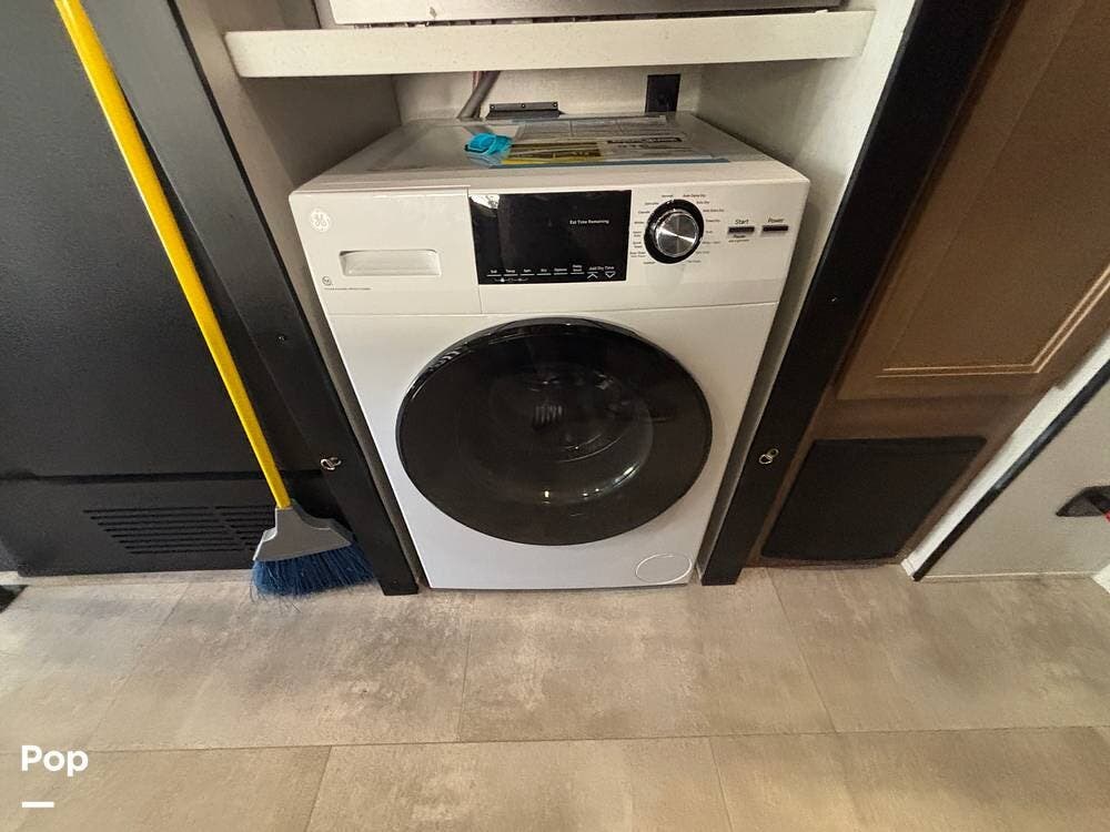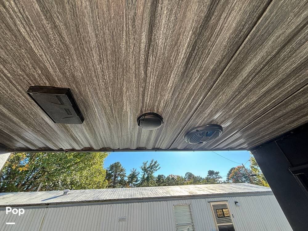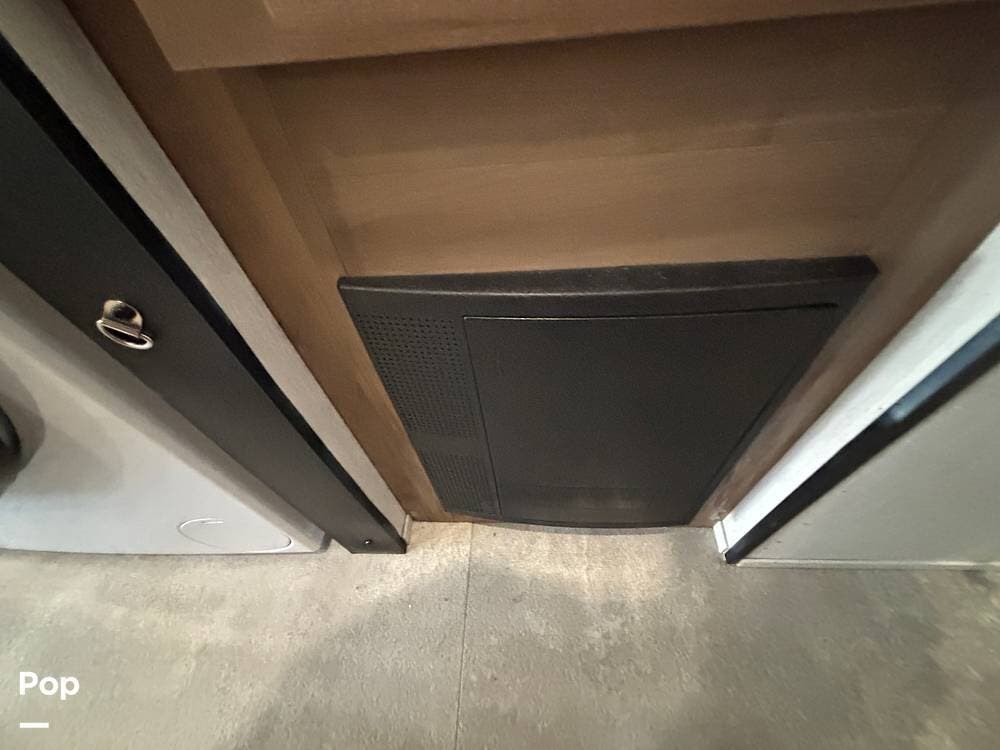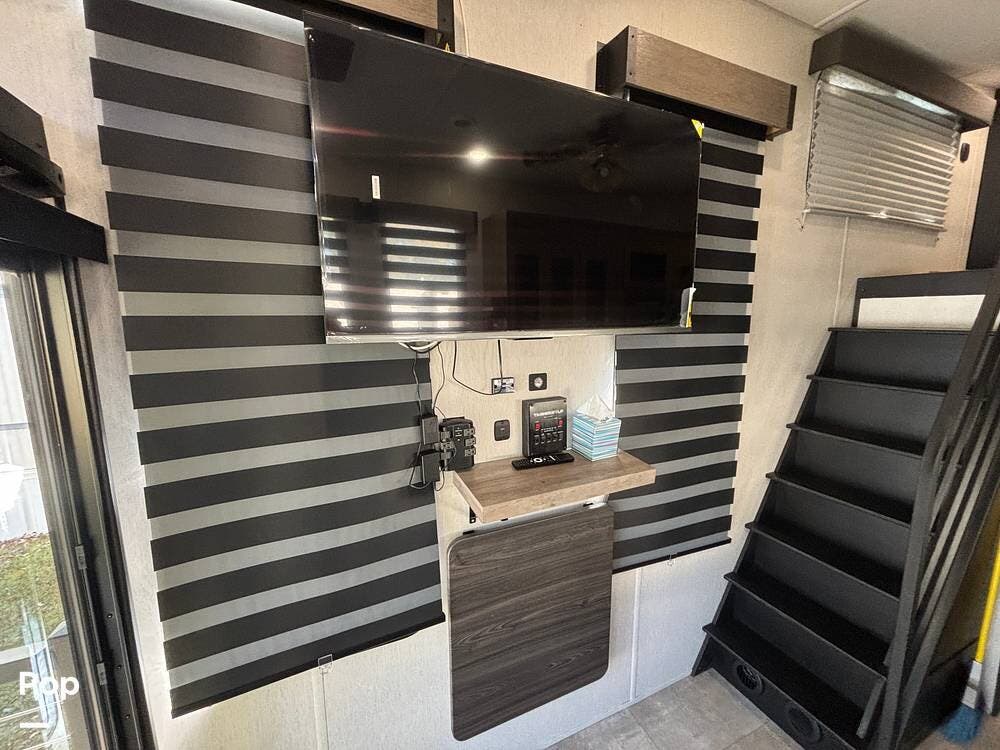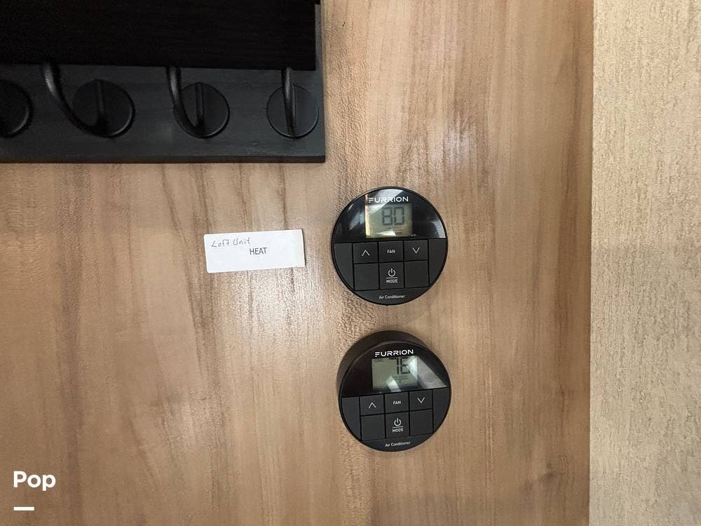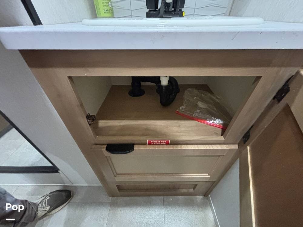 Inside, the Timberwolf 20OG welcomes you with a bright, open living area that feels like home. The large windows and sliding glass patio doors create a spacious atmosphere, complemented by residential wood accents and durable flooring. A comfortable sofa and dinette provide plenty of seating for relaxing or entertaining guests, and the entertainment center is positioned for easy viewing. LED lighting and efficient climate control ensure year-round comfort, whether you're using the unit for weekend getaways or full-time living.
