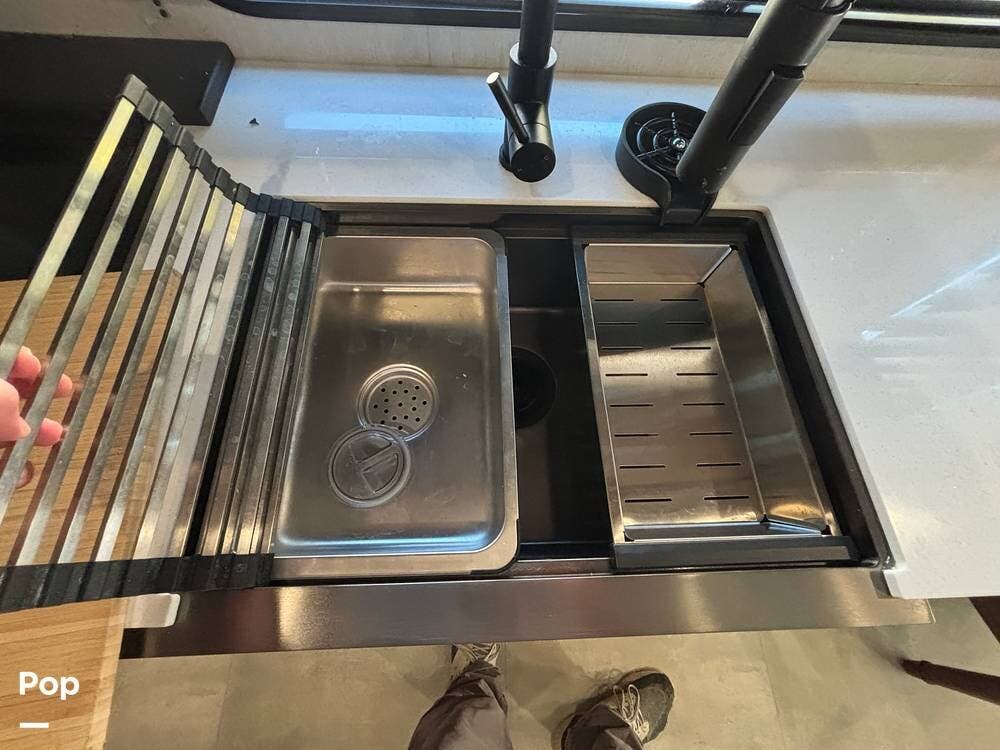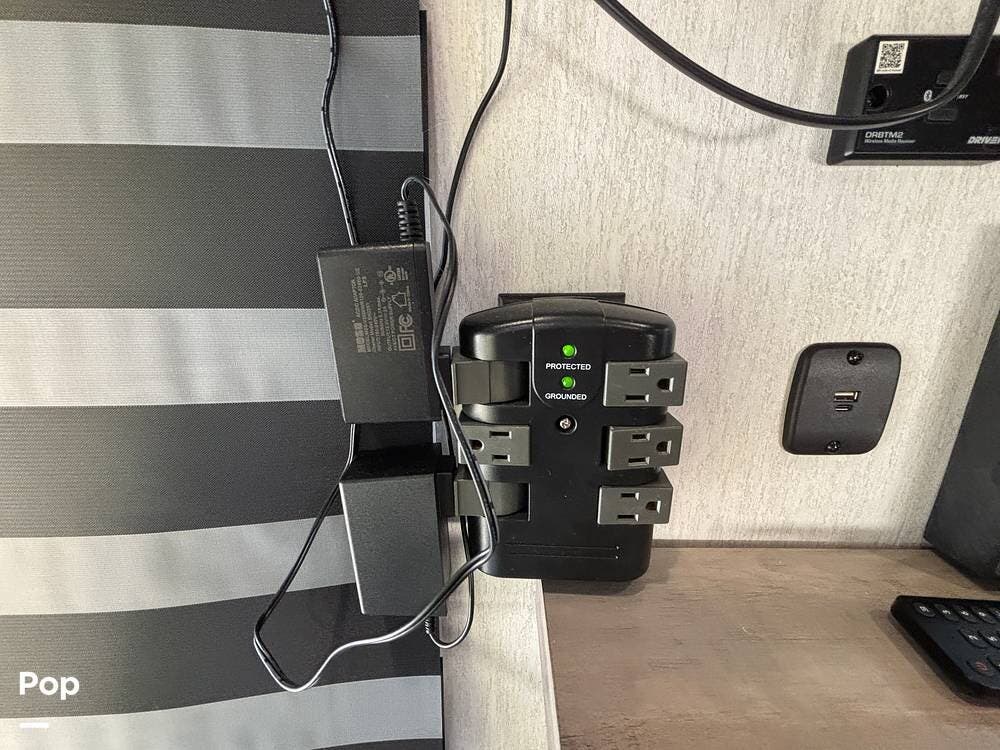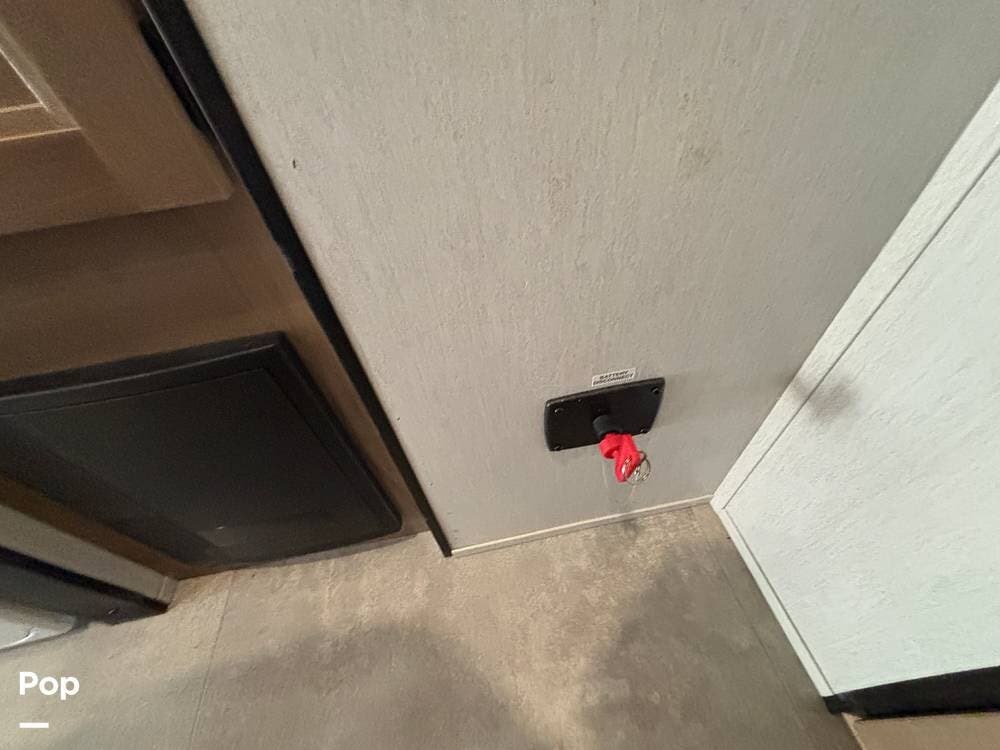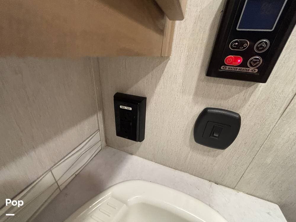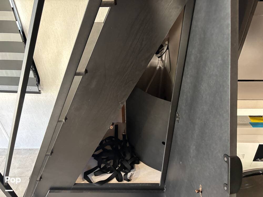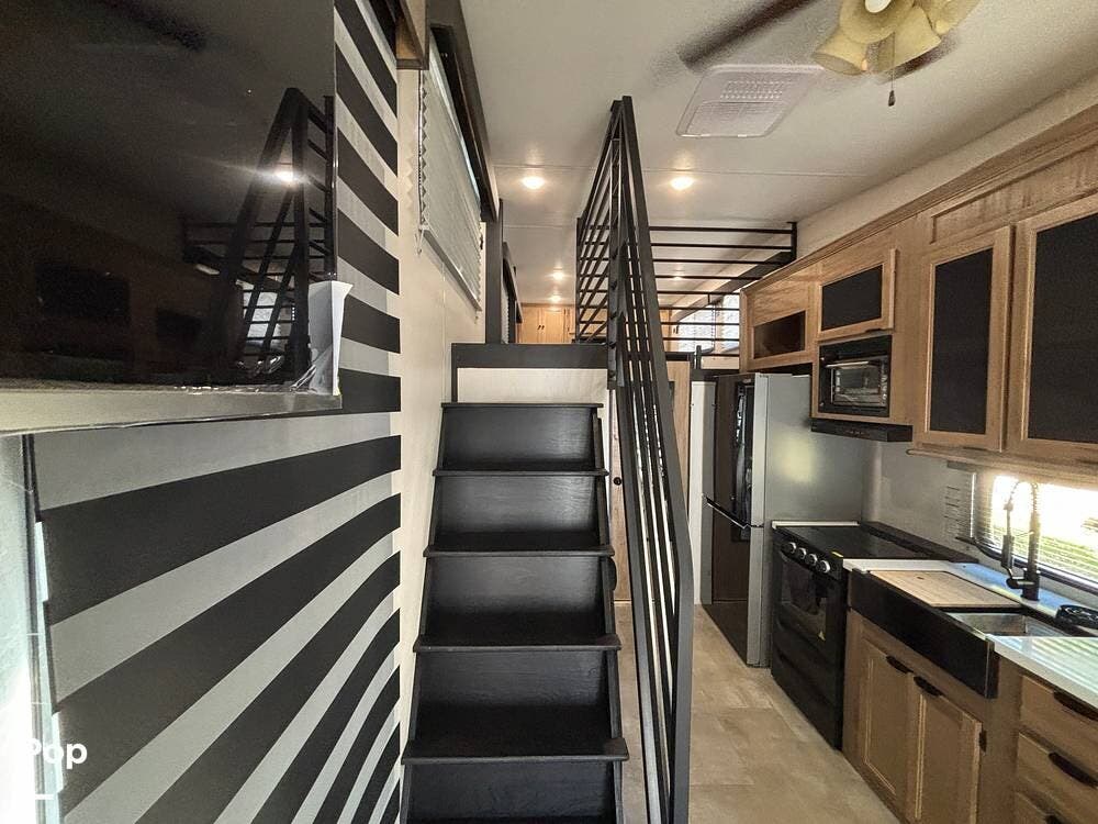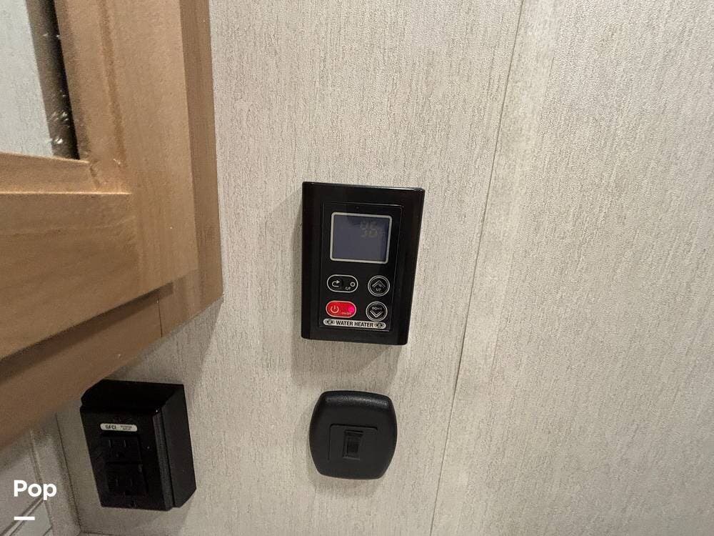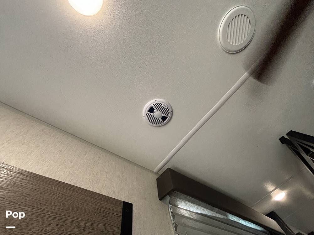 Inside, the Timberwolf 20OG welcomes you with a bright, open living area that feels like home. The large windows and sliding glass patio doors create a spacious atmosphere, complemented by residential wood accents and durable flooring. A comfortable sofa and dinette provide plenty of seating for relaxing or entertaining guests, and the entertainment center is positioned for easy viewing. LED lighting and efficient climate control ensure year-round comfort, whether you're using the unit for weekend getaways or full-time living.