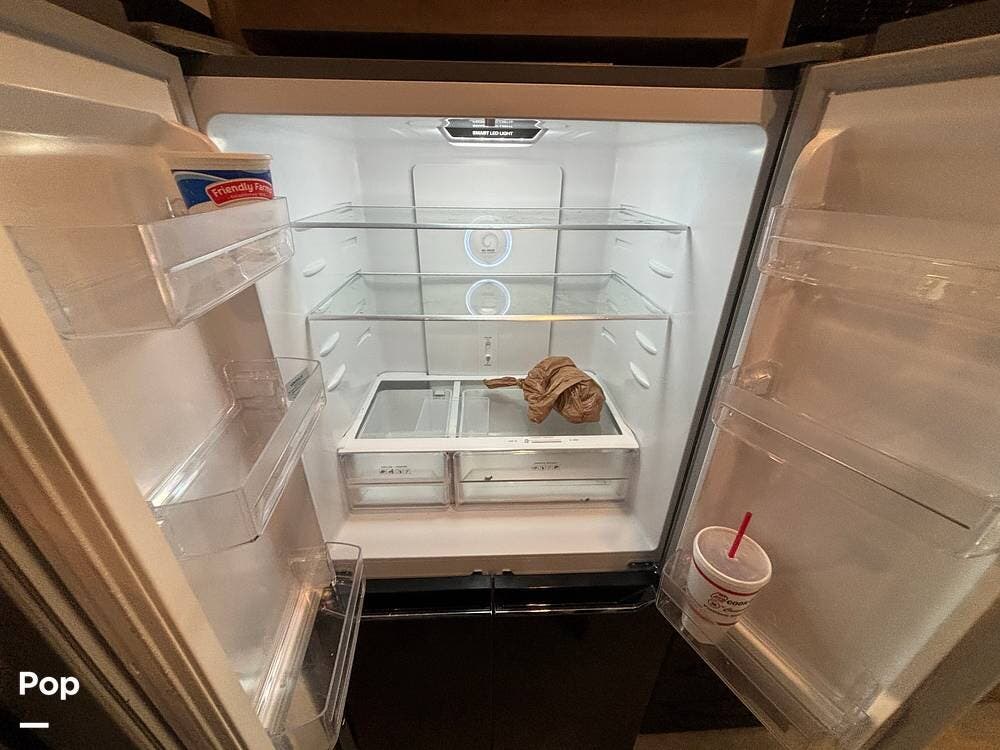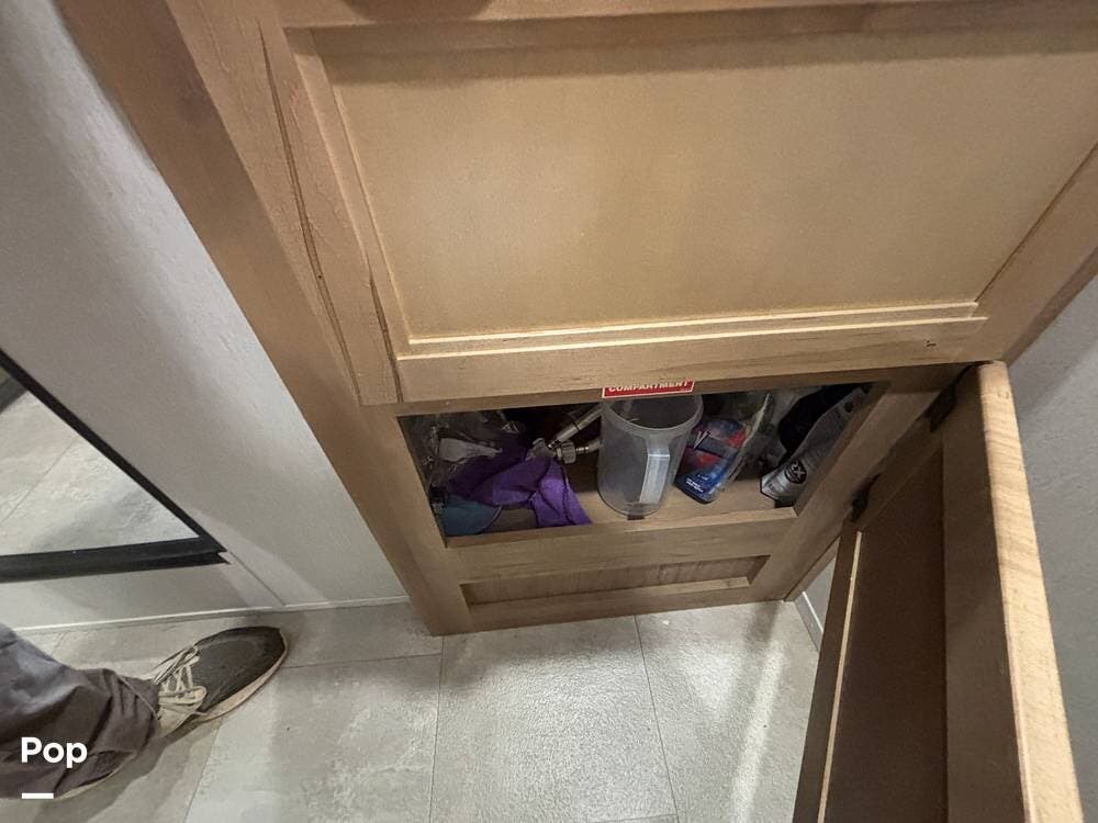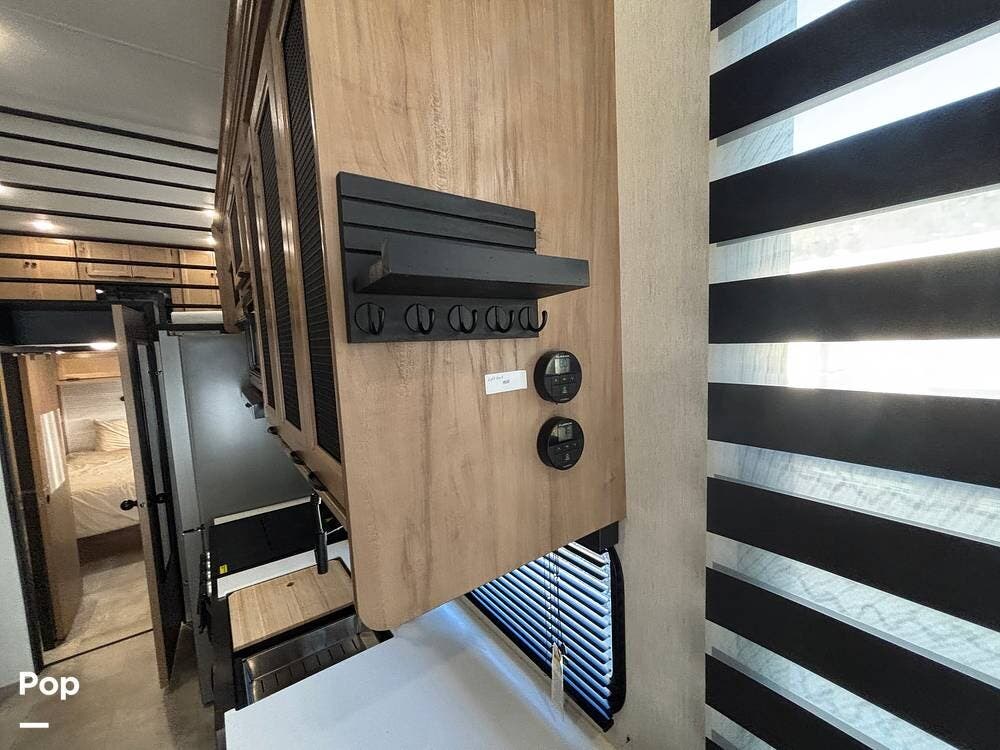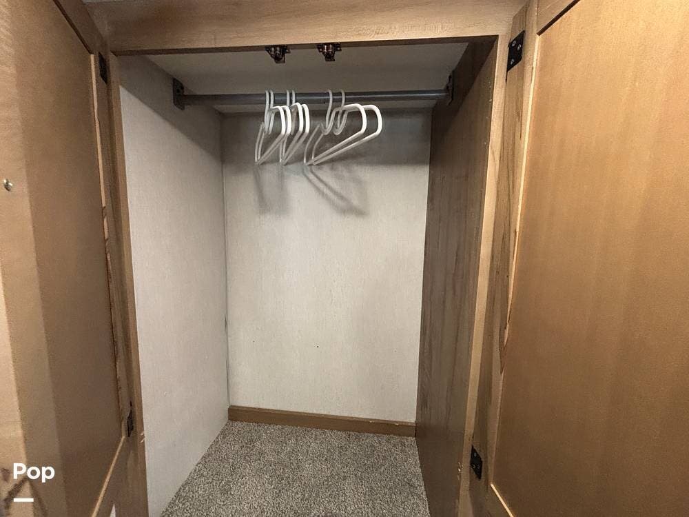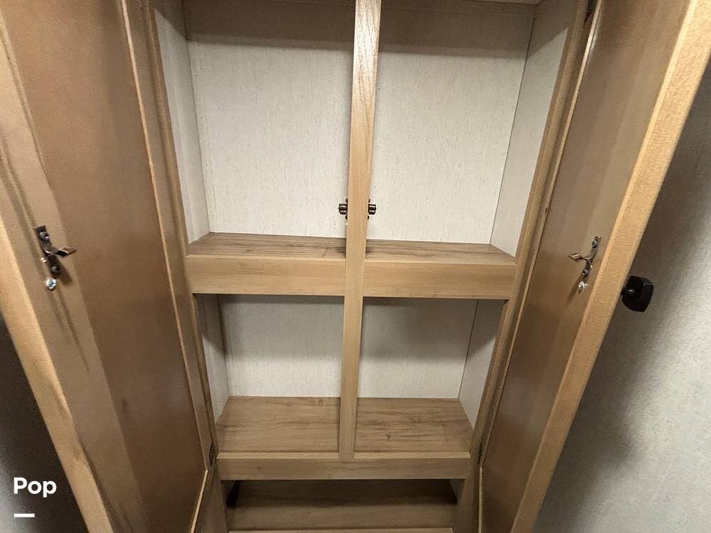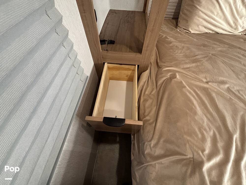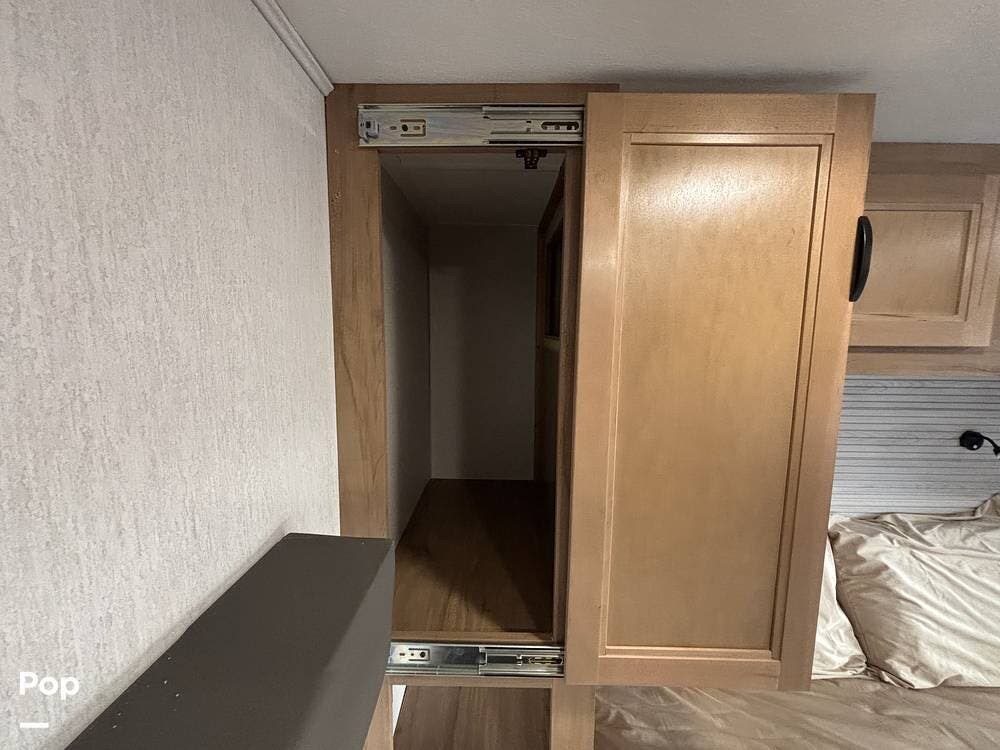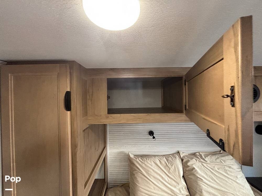 Toward the rear, the bedroom offers a peaceful and private retreat. The RV King bed provides comfort and support, surrounded by overhead storage cabinets and side wardrobes for clothing and personal items. There's additional under-bed storage for bulkier belongings, and windows on both sides let in natural light and provide ventilation. The design keeps the room quiet and secluded from the main living area, providing a true home-away-from-home feel.