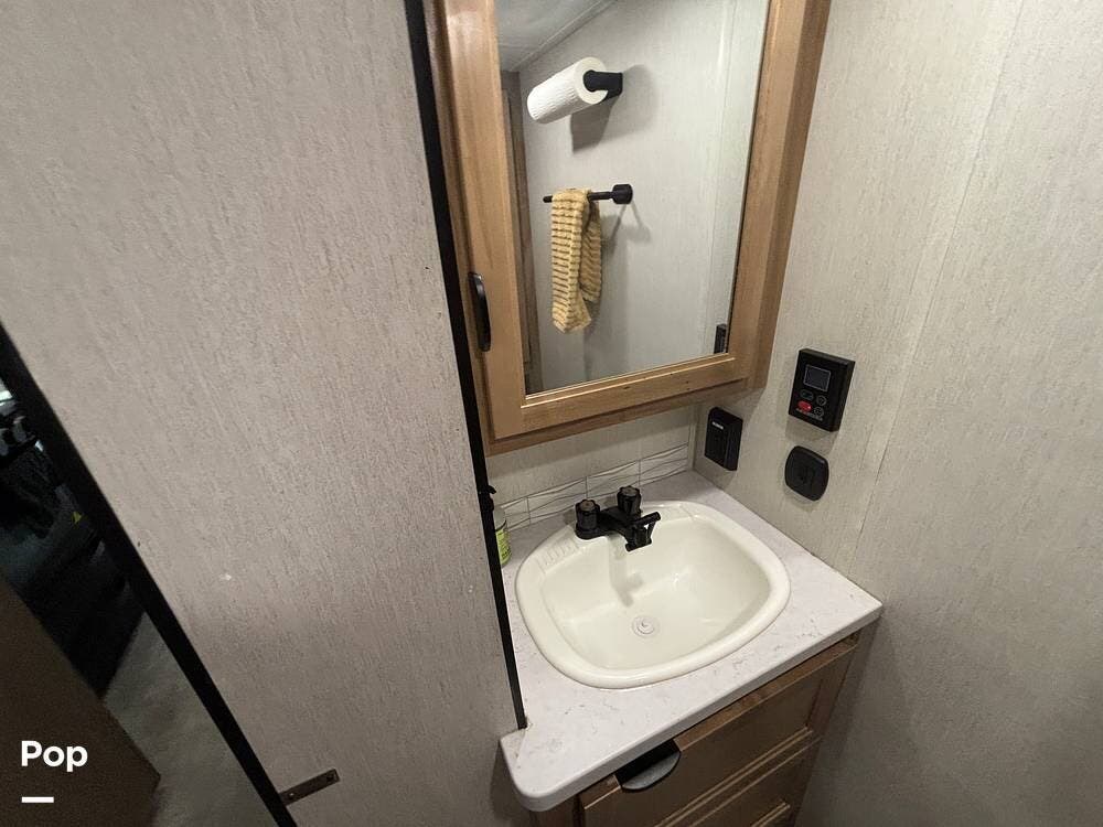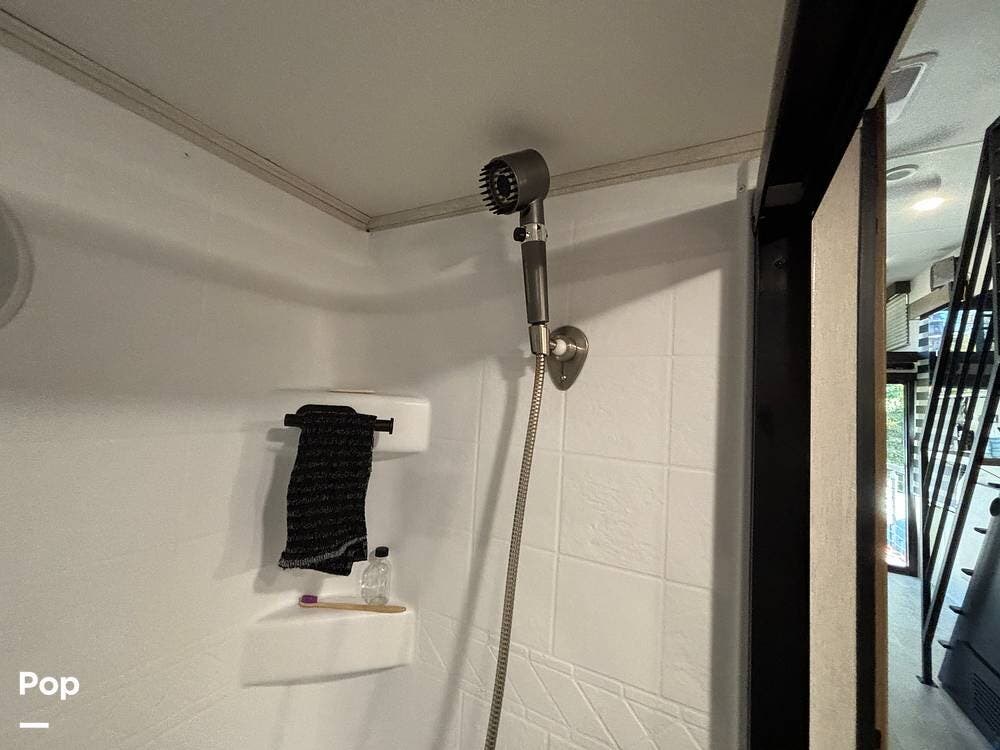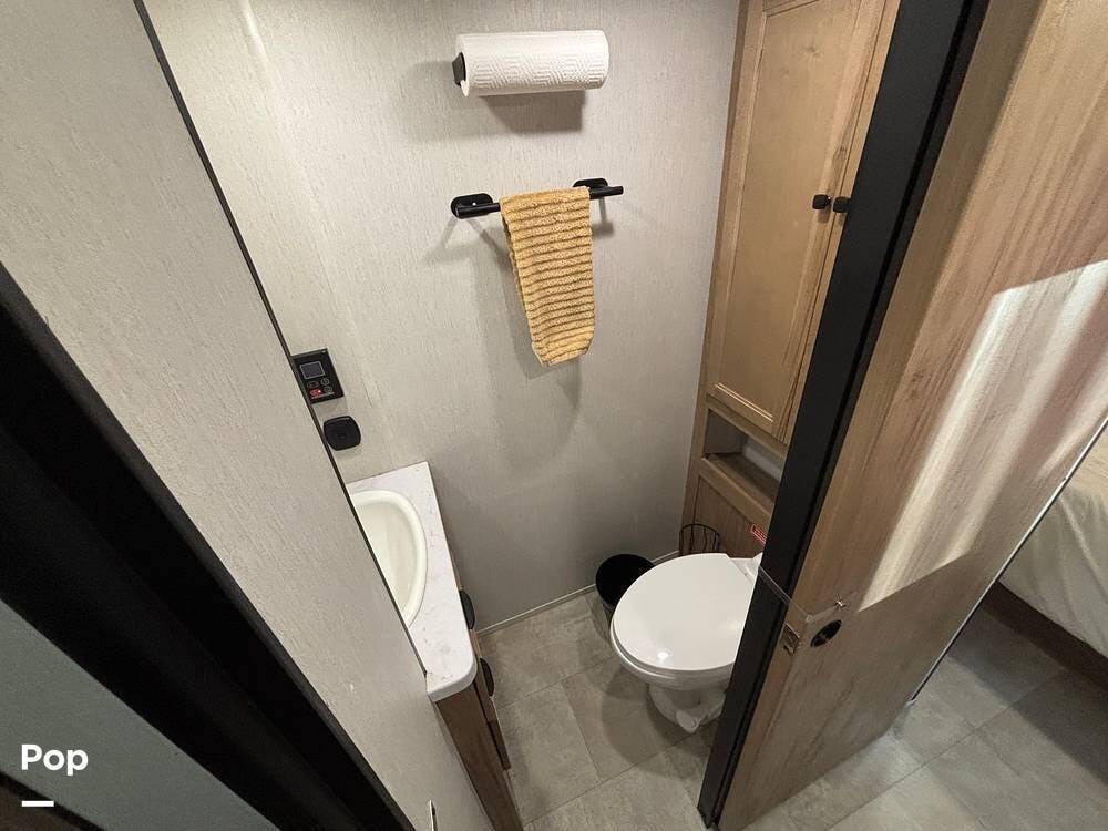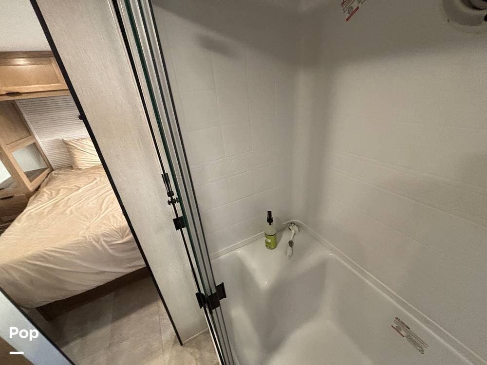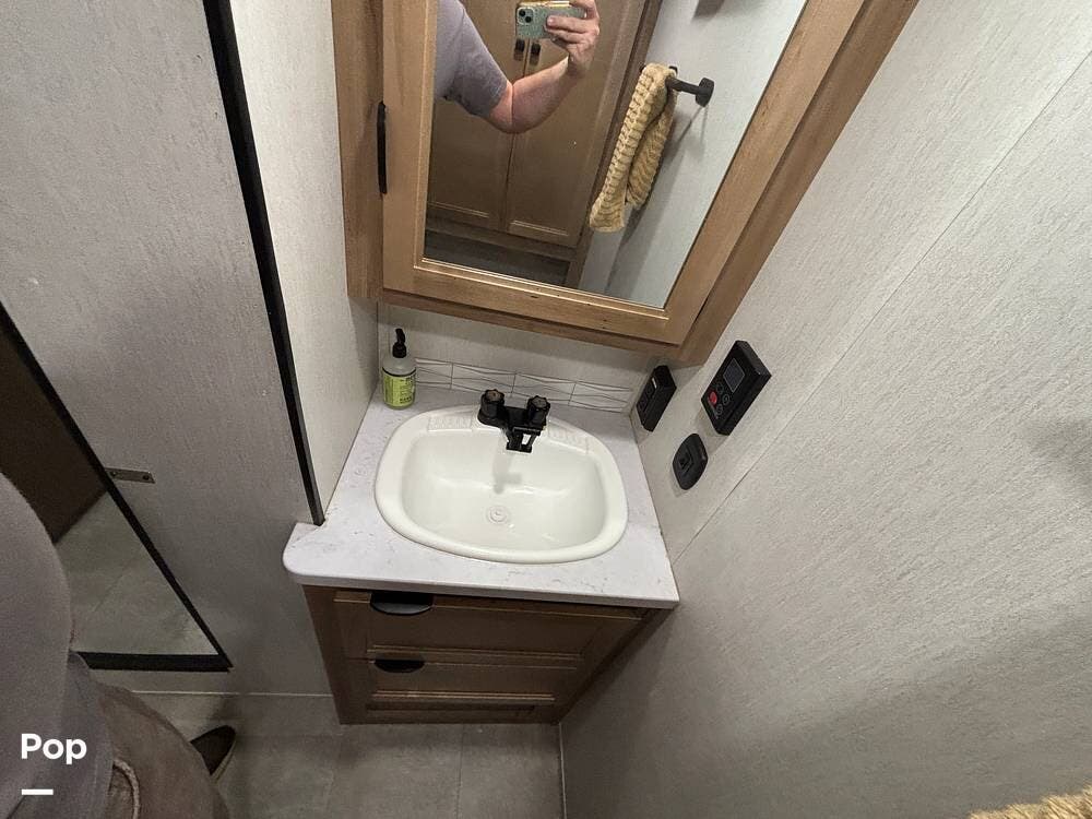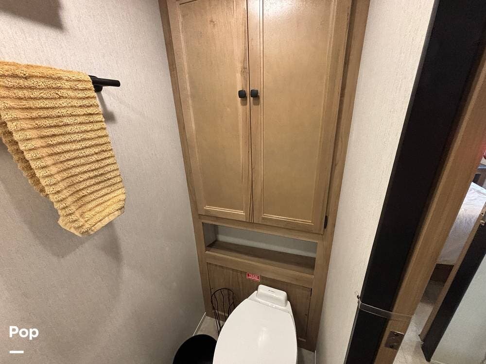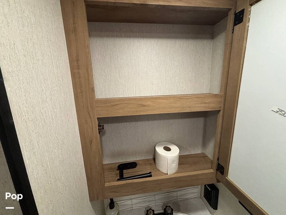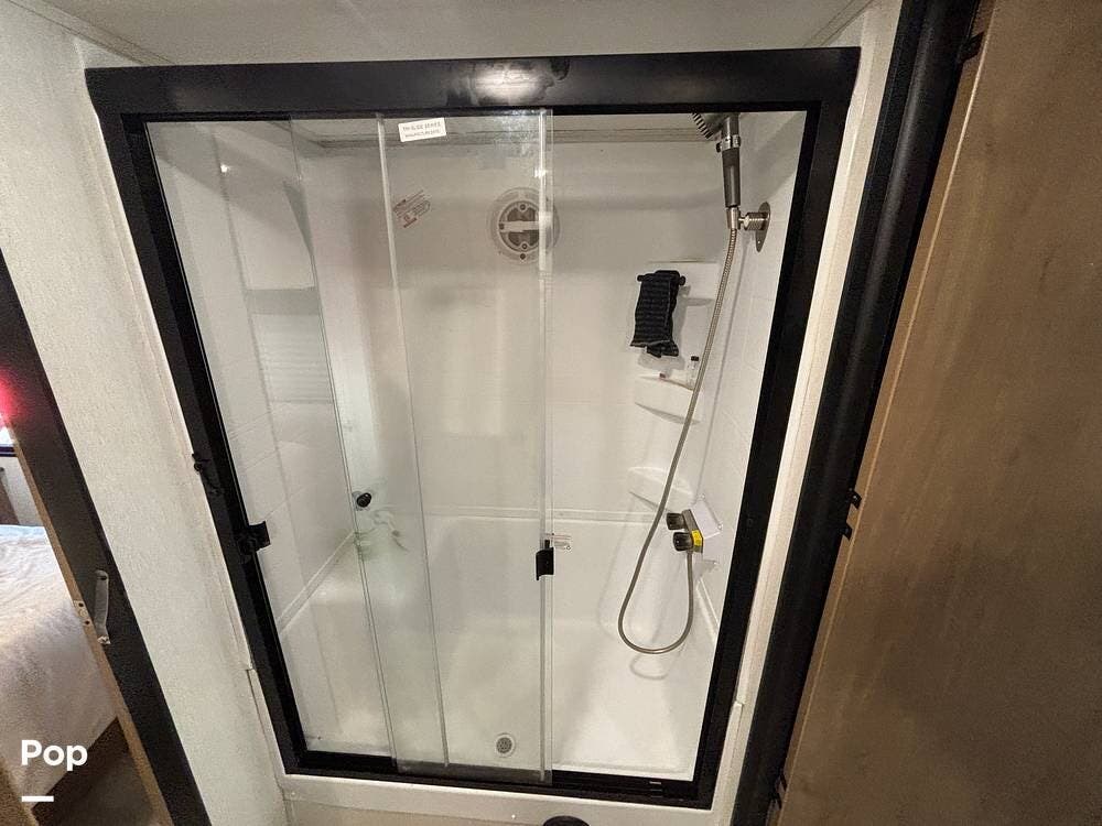 The bathroom completes the Timberwolf 20OG's thoughtful layout, featuring a residential shower with a glass enclosure, a foot-flush toilet, and a vanity with sink and a mirrored medicine cabinet. The space is well-lit and ventilated, and storage shelves provide room for towels and toiletries. Every detail is designed for comfort and convenience, giving you the same usability you'd expect in a permanent home.