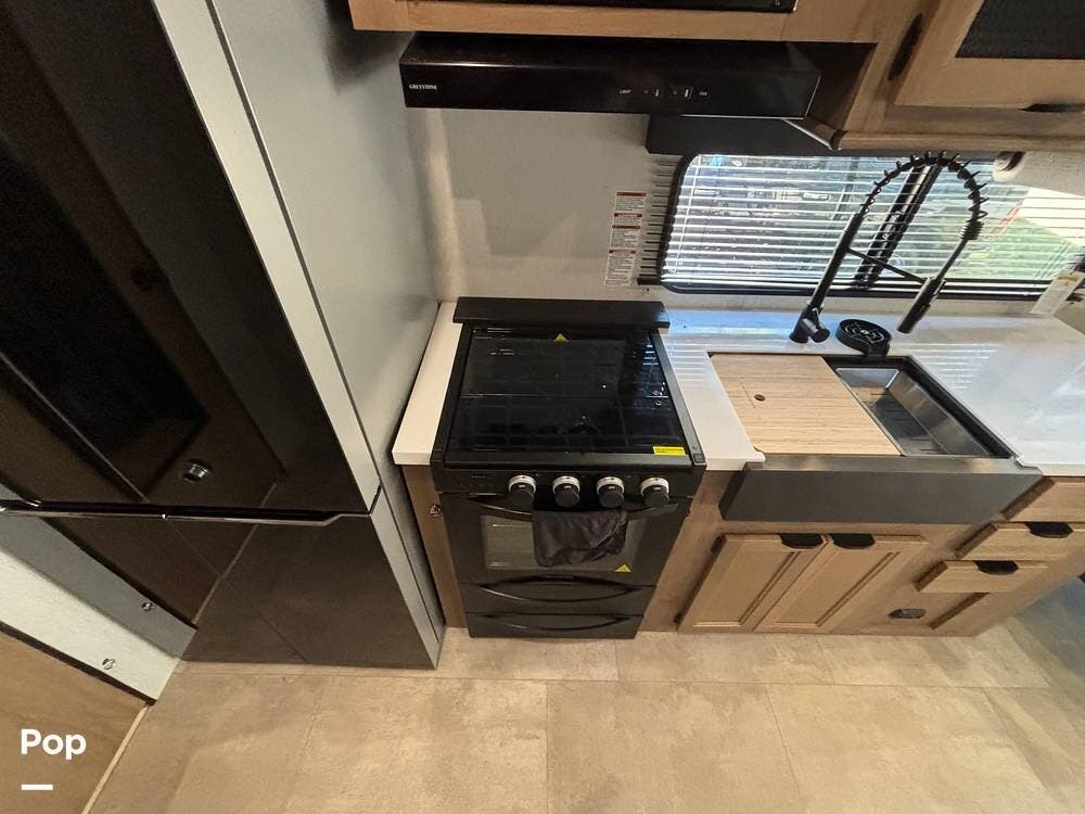 The kitchen is thoughtfully arranged with residential-grade amenities that make meal preparation enjoyable. It includes a full-size refrigerator, a three-burner range with oven, microwave, and a deep stainless-steel sink. Ample counter space and cabinetry offer plenty of room for cookware, dishes, and pantry items. The finishes are modern yet practical, creating a functional workspace that maintains a cozy, home-like appeal. It's the kind of kitchen that allows you to settle in and cook without compromise.