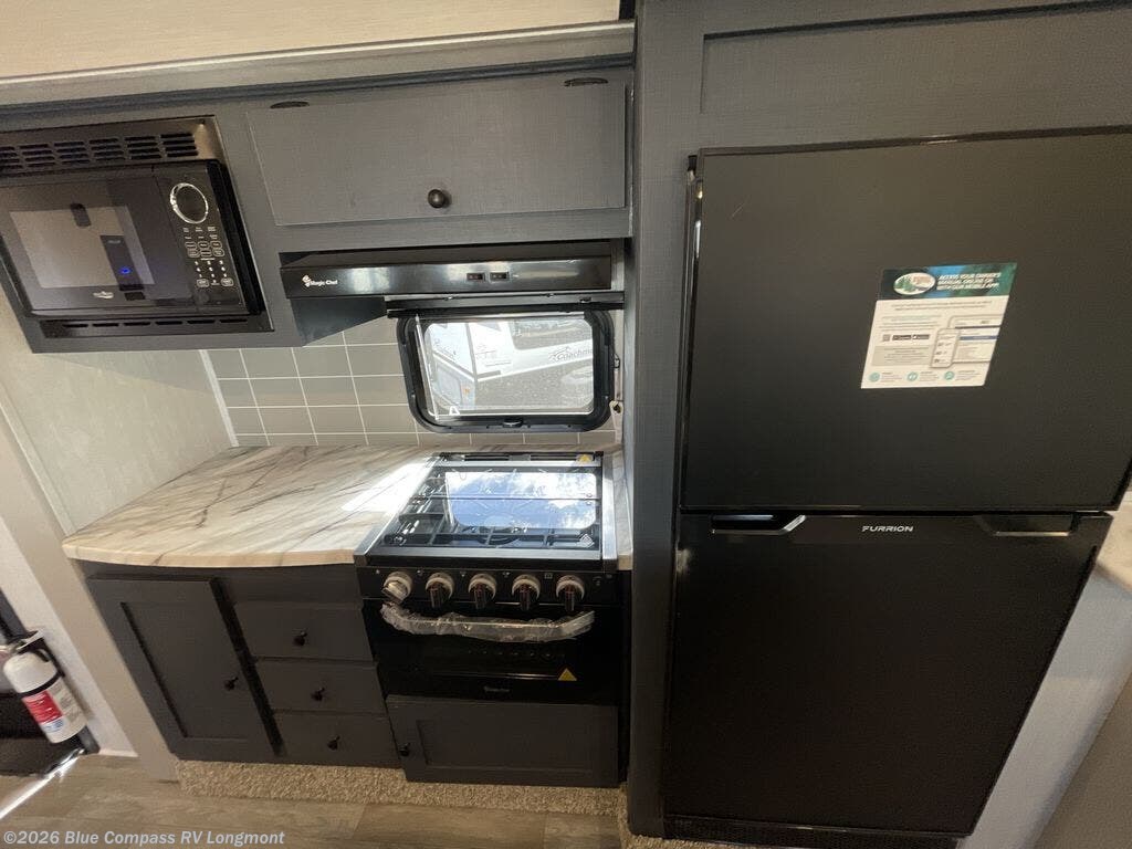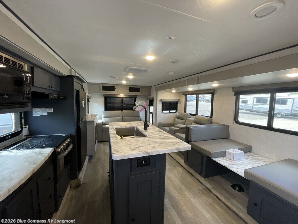 If you like to camp with a more at-home feel then you're going to love this travel trailer. There are dual opposing slides in the living area/kitchen for more interior space, and you can relax on the theater seating across from the entertainment center and fireplace. The kitchen includes an island the chef is sure to love, along with a three burner cooktop, a hutch, and an 8 cu. ft. 12V refrigerator. You will feel right at home in the front private bedroom with a queen bed and dual wardrobes for your clothes. This model also includes an outdoor camp kitchen with an outdoor TV; you can't beat that!