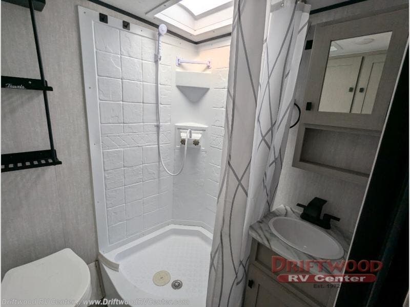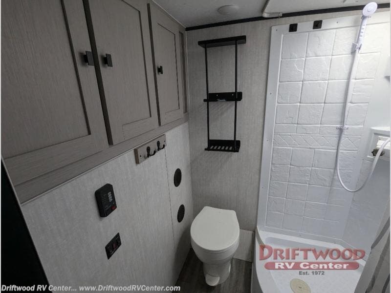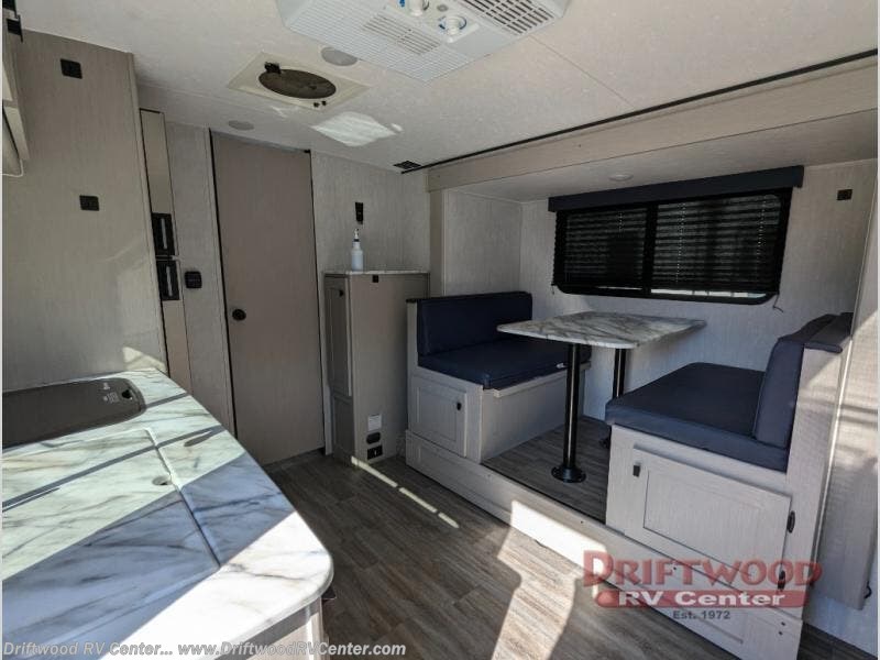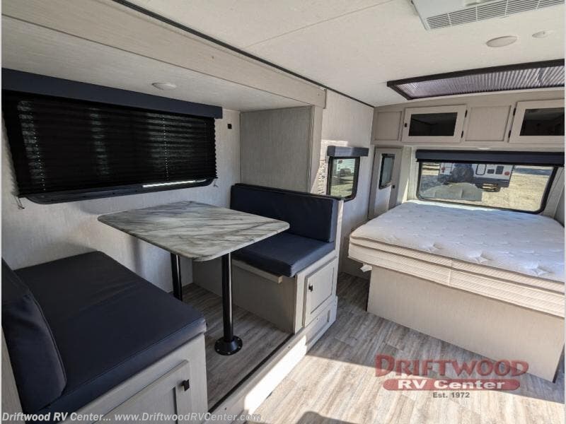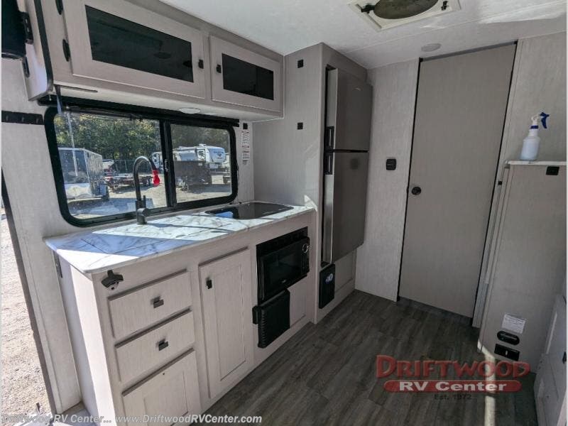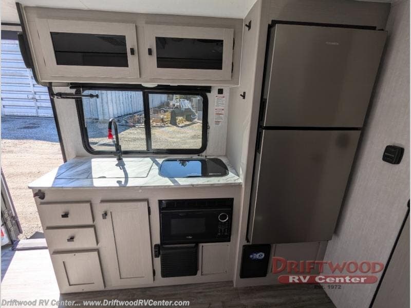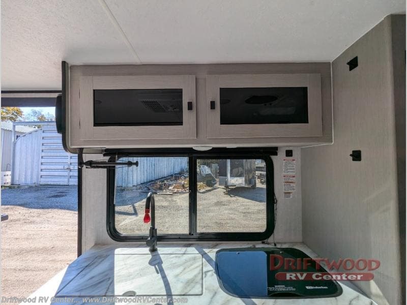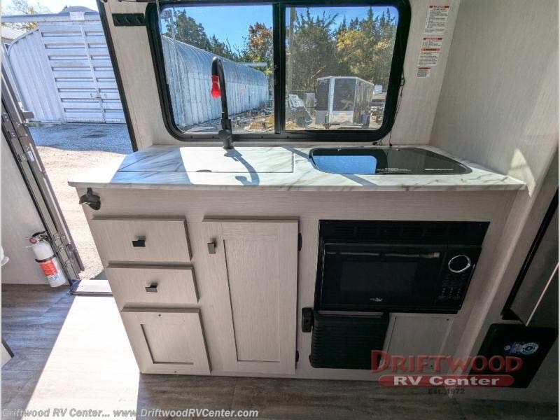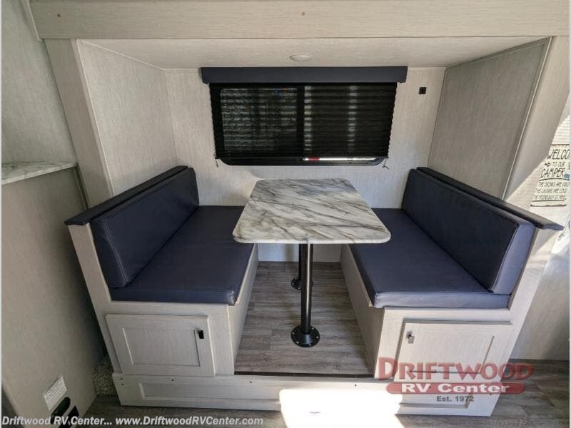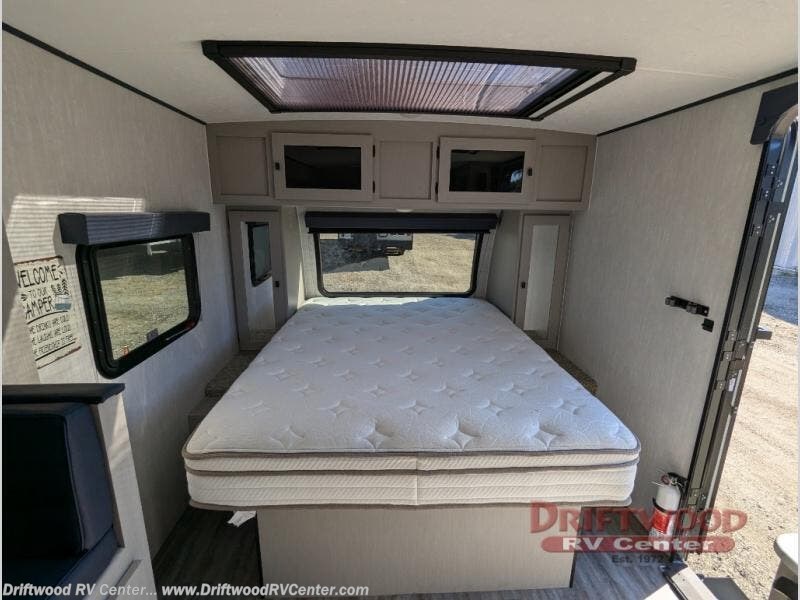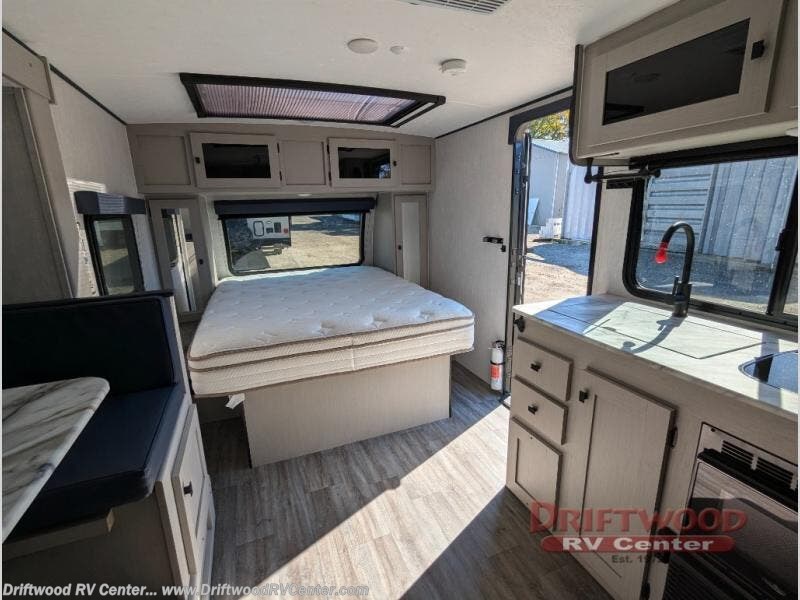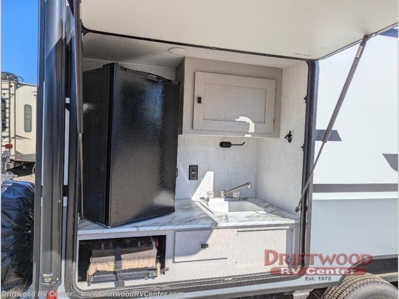 When you camp at RV parks, state parks or local campgrounds, you will love the easy setup after towing the trailer to your destination! The booth dinette slide and the power awning can quickly be set up so you can relax and unwind with your favorite person or people. You will have the choice of cooking inside with full amenities or outdoors on the outside kitchen, and inside you will have a pantry to store all your dry goods and a microwave to heat up items. The rear bathroom includes a wardrobe and allows you privacy when inside, and the front walk-around queen-size bed or the Murphy bed option, allows you to sleep comfortably after hiking, walking or fishing. And you will find more storage throughout for your clothing, plates, games and such, plus outside in the pass-through compartment.