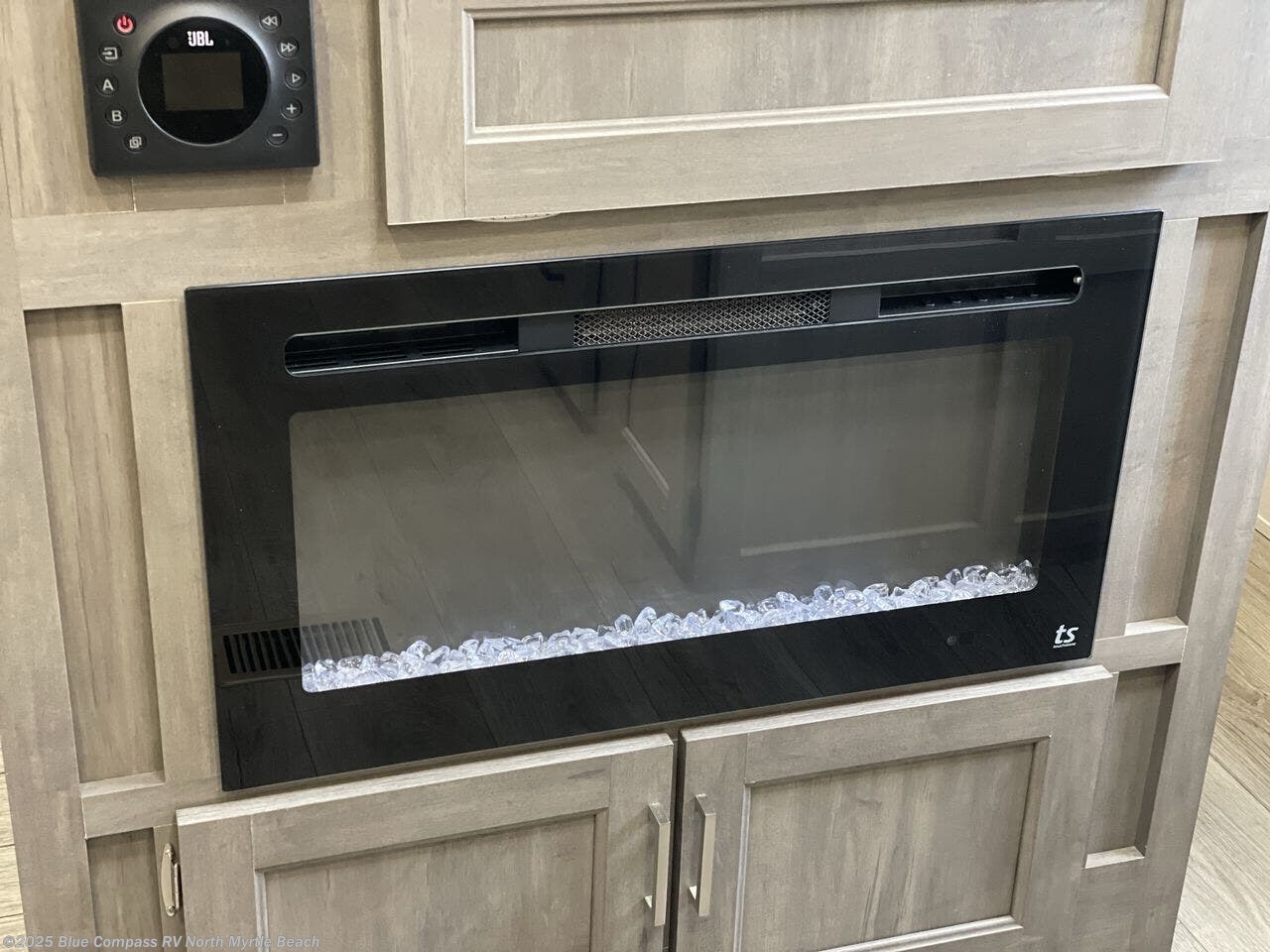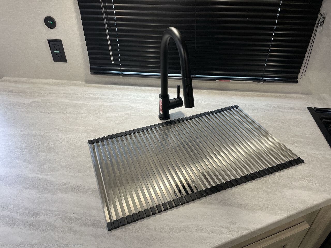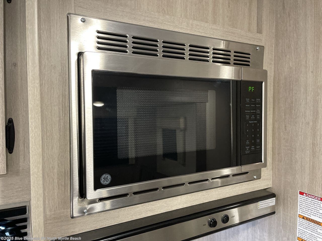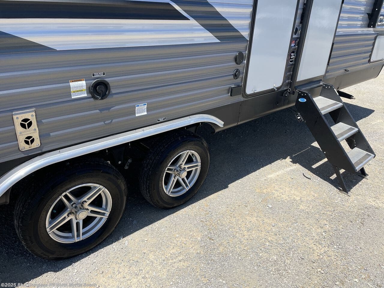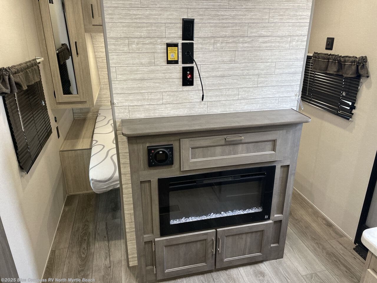 This half-ton friendly trailer is easy to pull and park, and is spacious thanks to the large slide out in the main living and kitchen area! You can dine at the booth dinette or choose the free standing dinette option, and the sofa offers drink holders for when you are watching the entertainment center with the optional fireplace below. The rear corner offers a full bathroom, and a large wardrobe/pantry for the storage you need. The galley kitchen offers full amenities plus a breakfast bar where you can set out fresh fruit and cereal. And the 15' awning provides protection from the elements plus has the choice of multiple LED colors with the use of the remote.