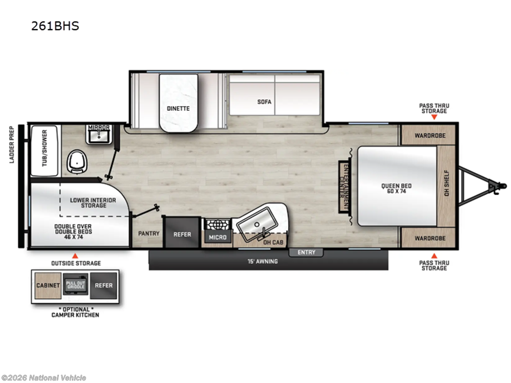 Step inside and you?ll immediately appreciate the smart, spacious layout tailored for families and groups. The rear bunkhouse features 46" x 74" double-size bunk beds with convenient lower storage, giving kids or guests a comfortable and functional retreat. Up front, the private bedroom offers a relaxing escape with a 60" x 74" queen bed, creating the perfect place to unwind after a day of adventure.