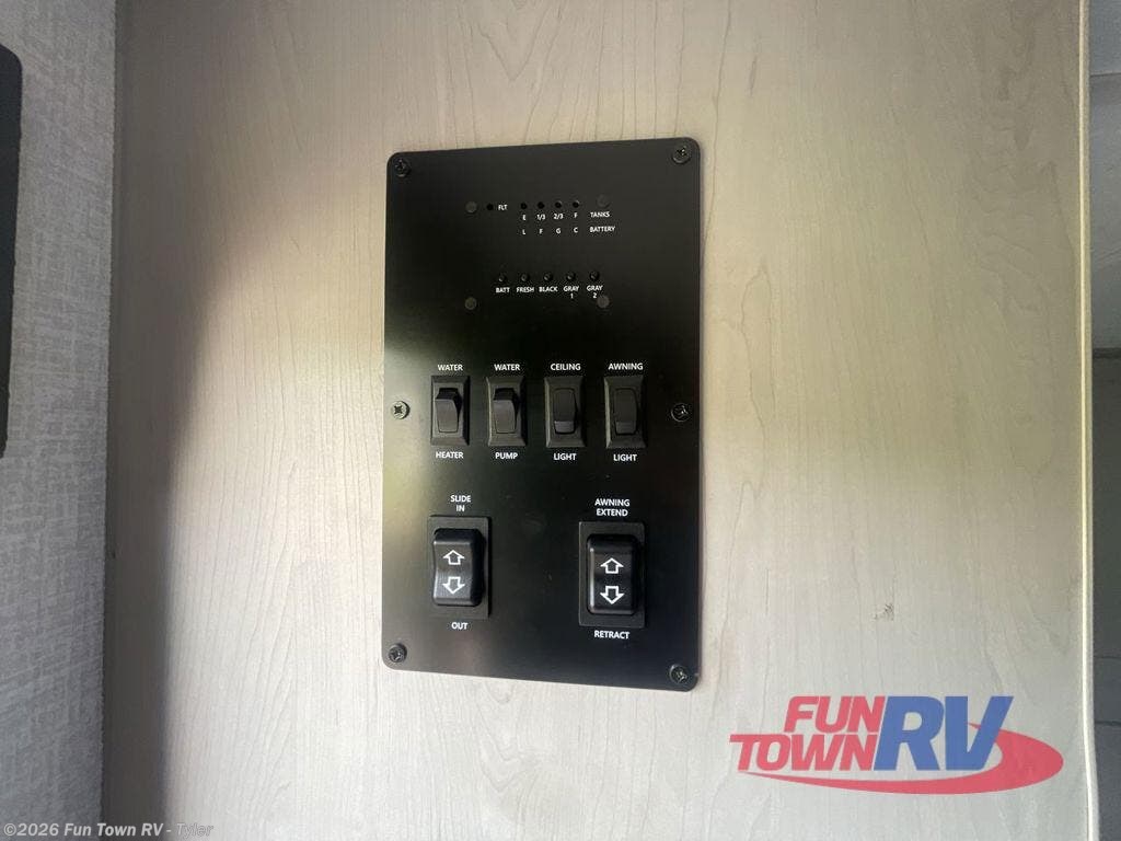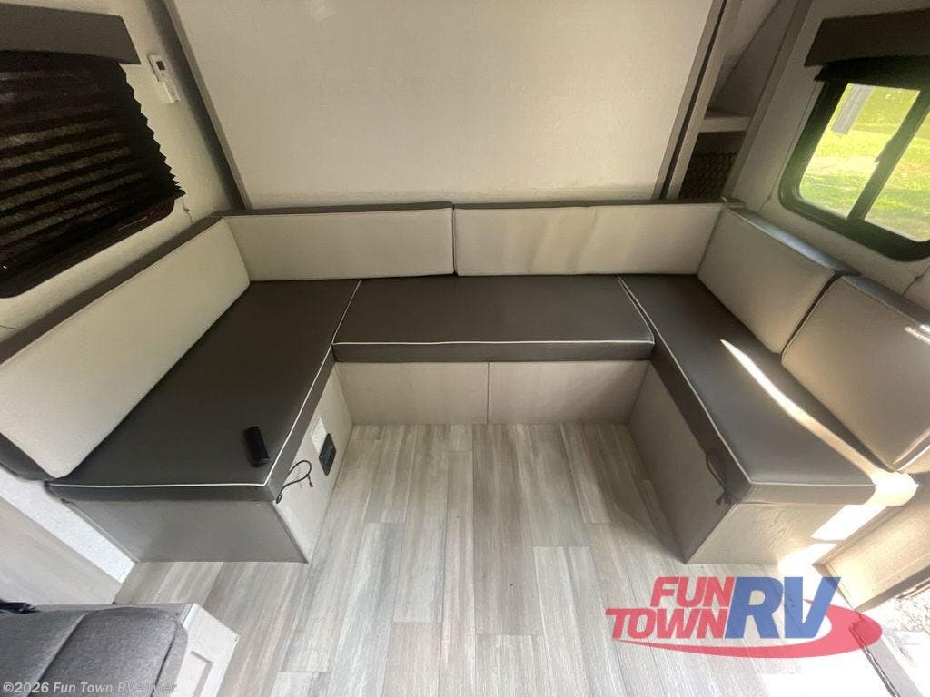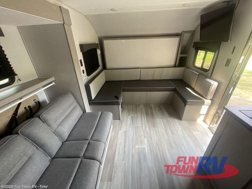 If you are looking for a cozy travel trailer for two with a bit more space without having a long tow length, then this Viking travel trailer is for you! A front Murphy bed that when stored in the closed position reveals a spacious u-shaped dinette that is perfect for entertaining your campground neighbors or friends. An optional fireplace creates a warm and inviting space, and the large rear bath features a spacious shower with skylight, toilet and vanity with sink, as well as space to accommodate your towels and toiletries. The jack knife sofa sofa slide has a place for you to store your suitcases behind it. A two burner cooktop and sink opposite, plus microwave oven overhead, allows you to easily make meals while you camp and there is ample storage in the pantry cabinet above the optional fireplace for your things as well.