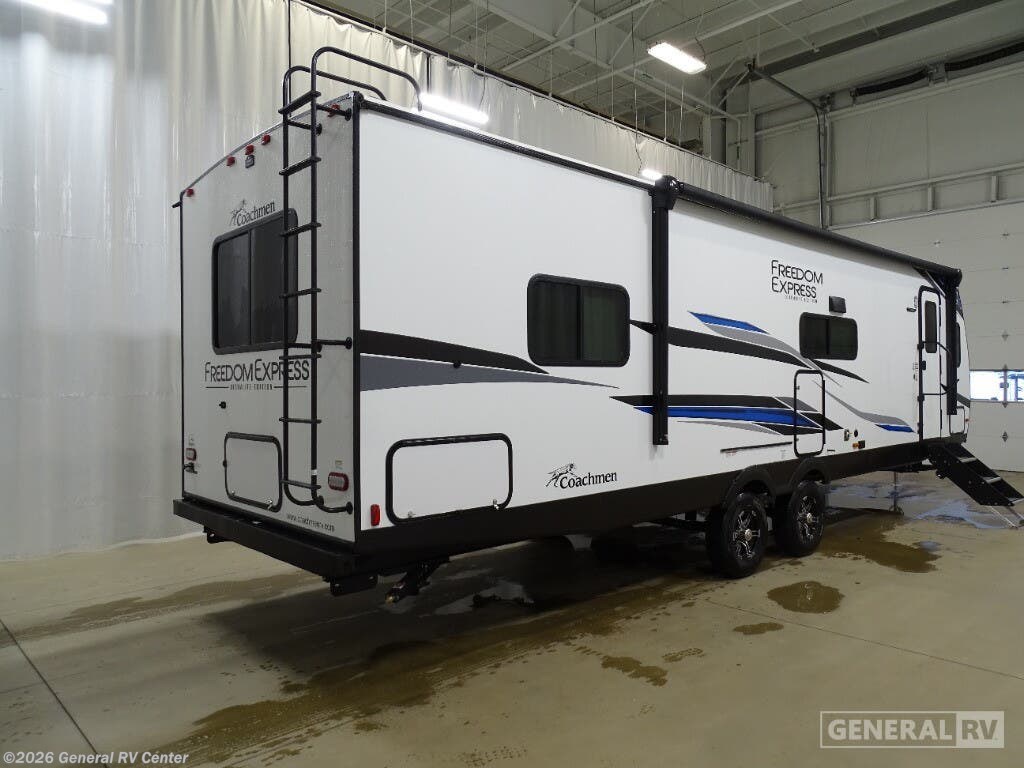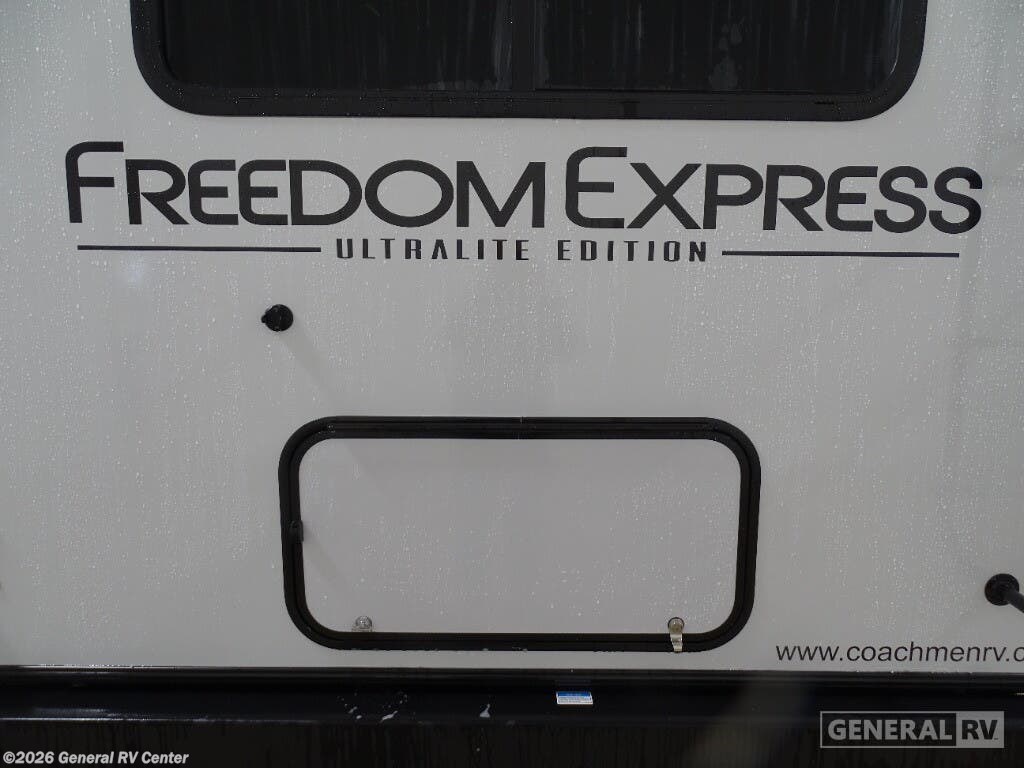 Looking for plenty of storage space in a towable? This Freedom Express Ultra Lite offers you a plenty of it, both inside and out. You will appreciate the spacious combined kitchen and living area featuring a large slide opposite the entry door. Here is where you will enjoy theater seating and your refrigerator and storage. The very front houses a huge 8' U-dinette for meals and game time, and can also serve as extra sleeping space once converted. Opposite the slide above the huge counter with plenty of storage beneath, a flat screen Smart TV. Beyond the kitchen area a spacious walk-through bath that offers space just like at home. There is even a wardrobe that has been prepped for a washer and dryer if you choose to add. A sliding door leads into the rear private master bedroom featuring a queen bed with dual bedside wardrobes and inset bedside shelves, vaulted underbed storage for your things. With any Freedom Express Ultra Lite travel trailer by Coachmen you will appreciate quality construction materials, such as vacuum bonded walls with Azdel composite, a 3/4 gel coated fiberglass cap with an automotive glass windshield, and a heated enclosed underbelly. Each model also features Tufflex PVC roofing, front rock guard, and E-Z Lube axles for smooth towing. Inside, you'll find kitchen backsplash, hidden hinge cabinetry, and wear-resistant vinyl flooring throughout. The power tongue jack included with the Ultra Lite Express Pack will make set-up a breeze, and each model includes back-up camera prep and they are Freedom solar ready if you plan to go off-grid. Enjoy lightweight camping with a Freedom Express Ultra Lite travel trailer today!