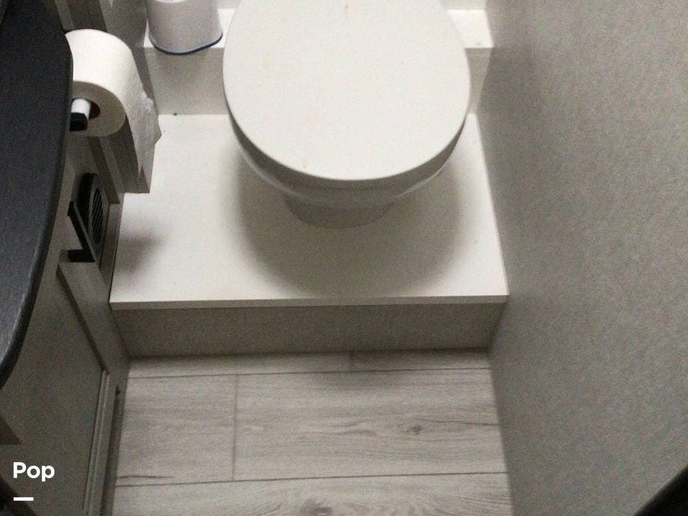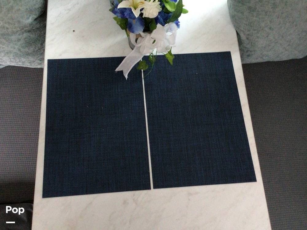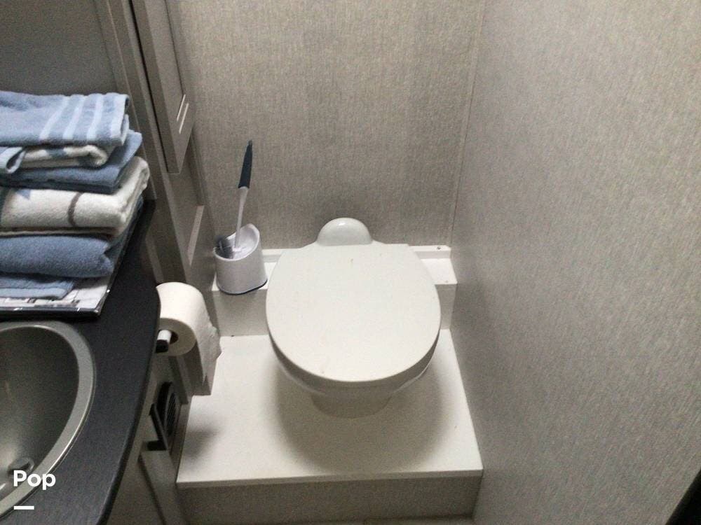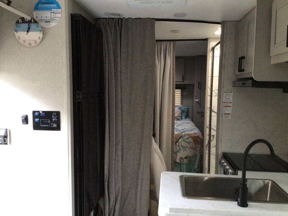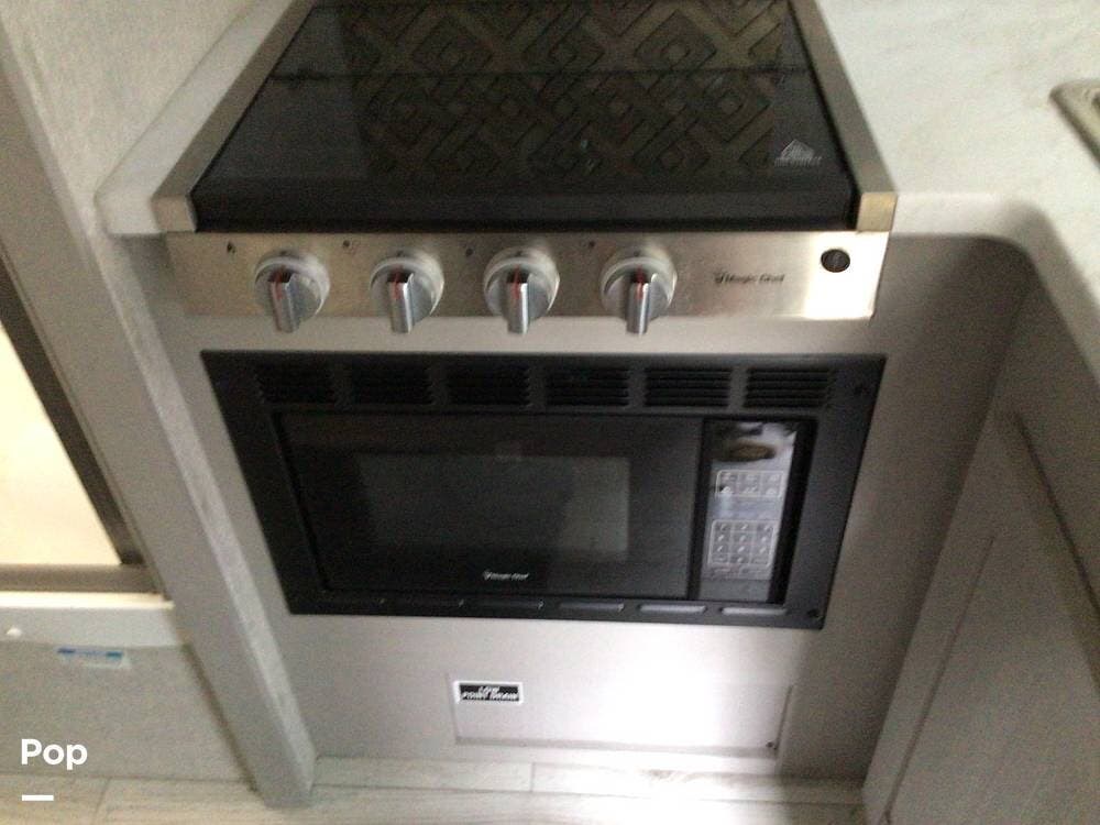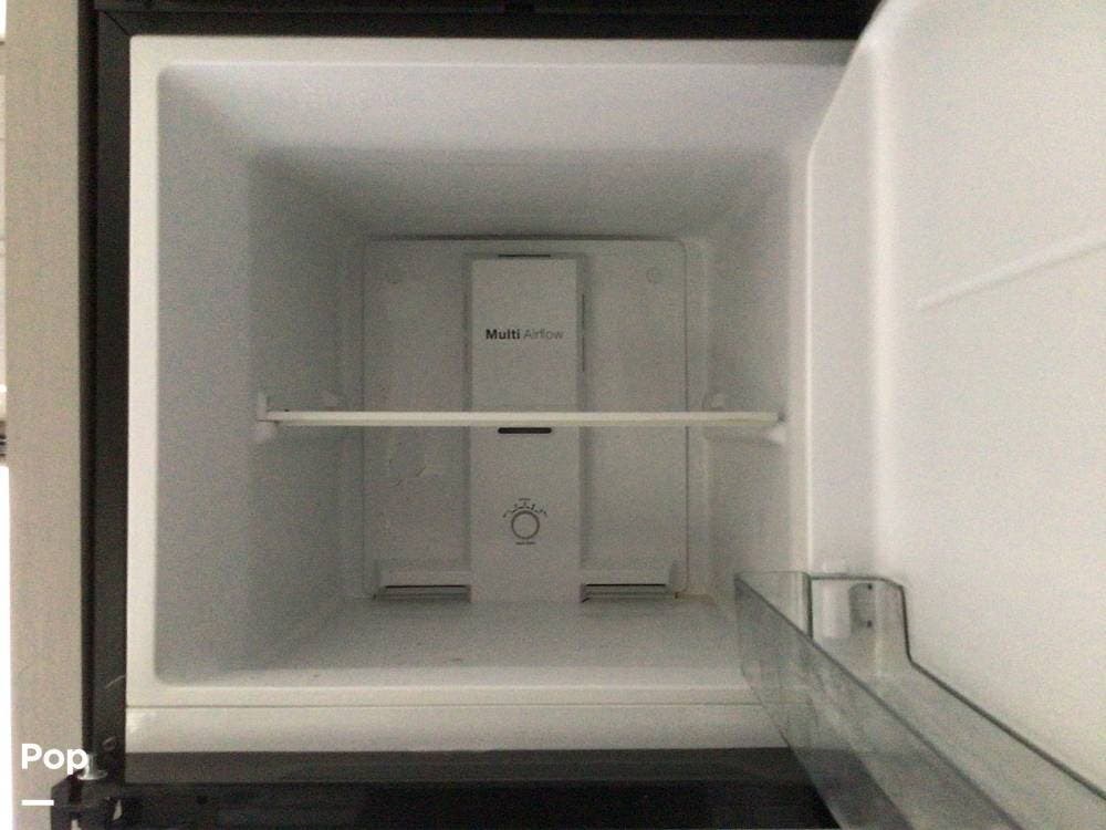 The kitchen has plenty of counter space and ample storage. It has a 10-cubic-foot 12V double-door refrigerator, a 3-burner cooktop, and a microwave oven. This will make the most discerning chef happy!