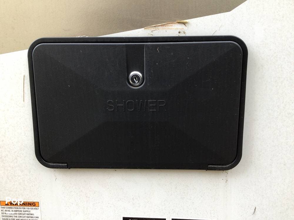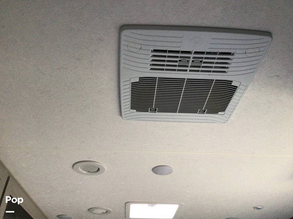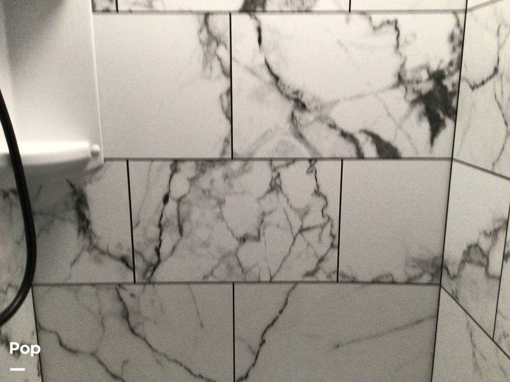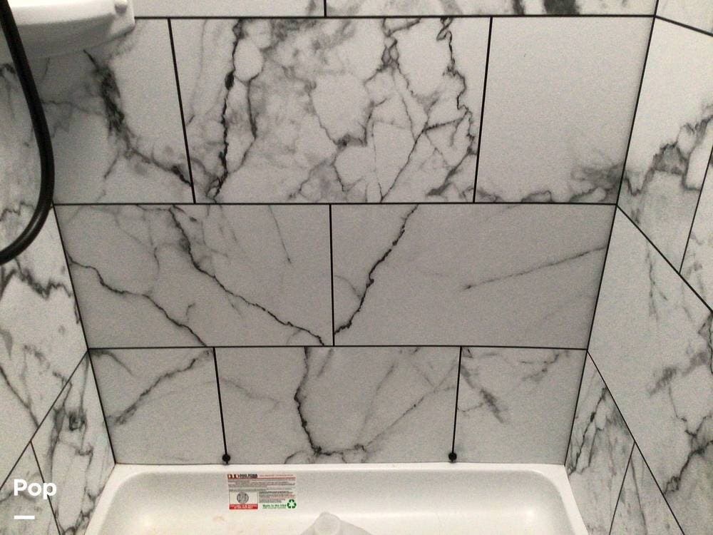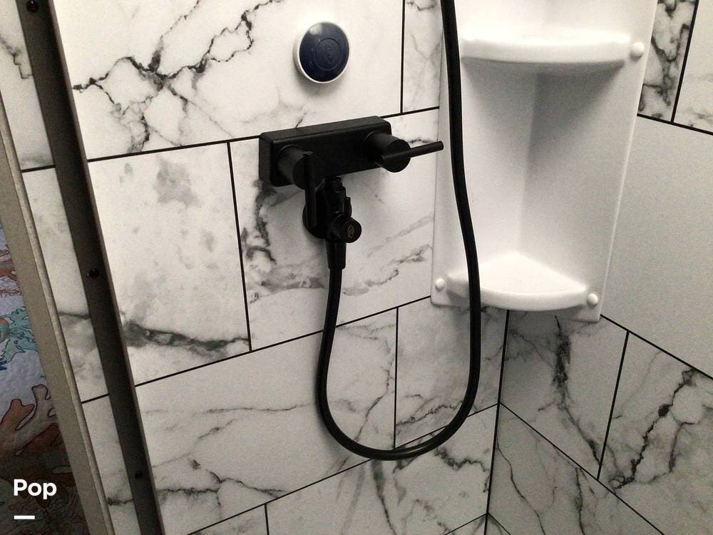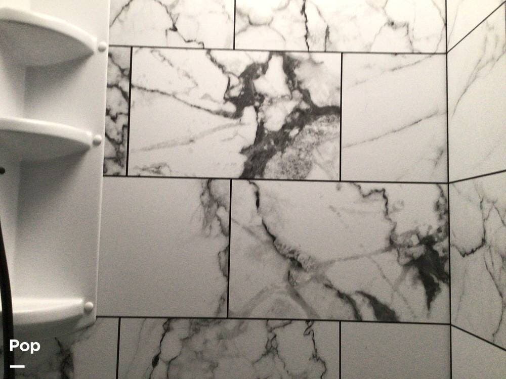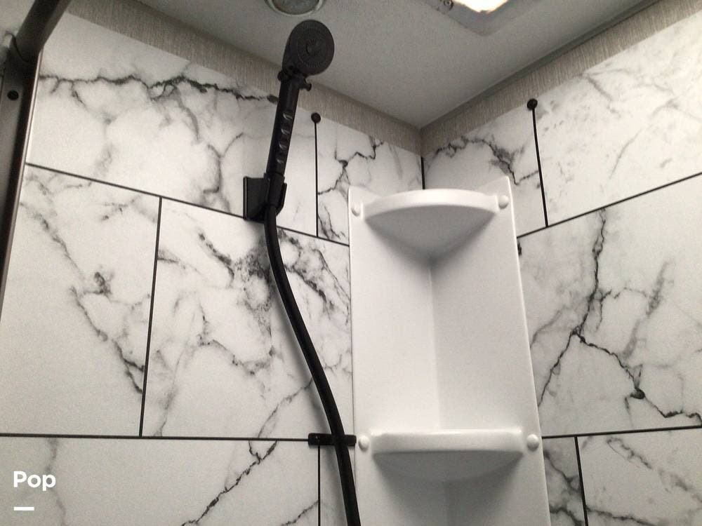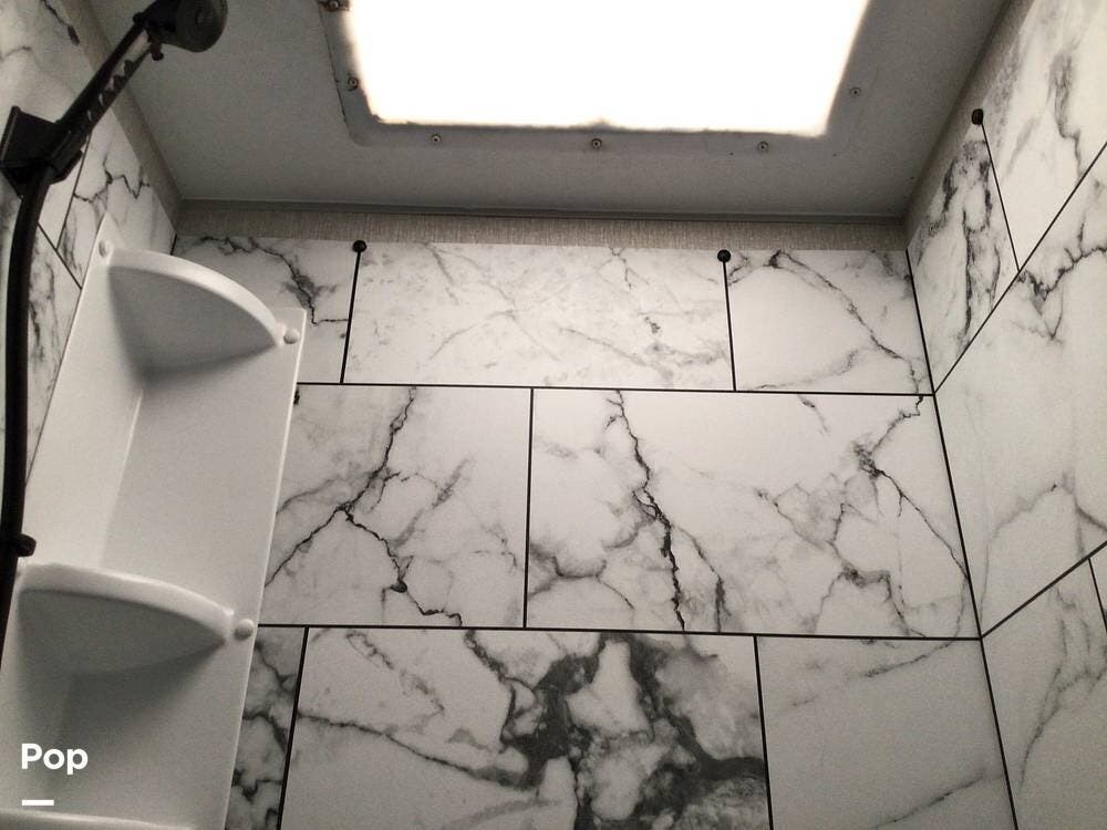 The bathroom has a slit design with the shower on one side and a toilet and sink on the other. It includes a power bath vent and a tankless water heater.