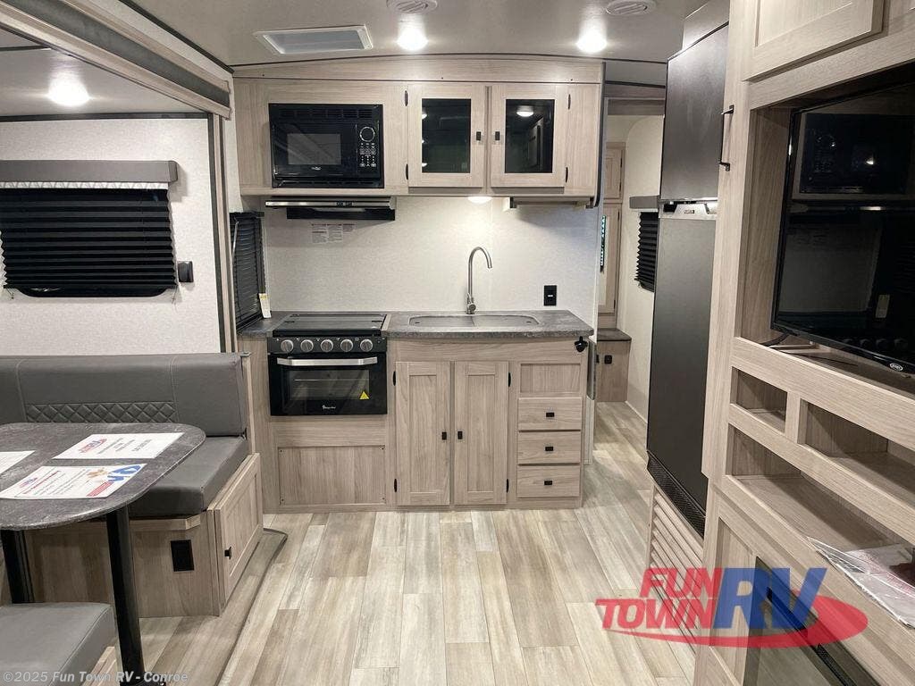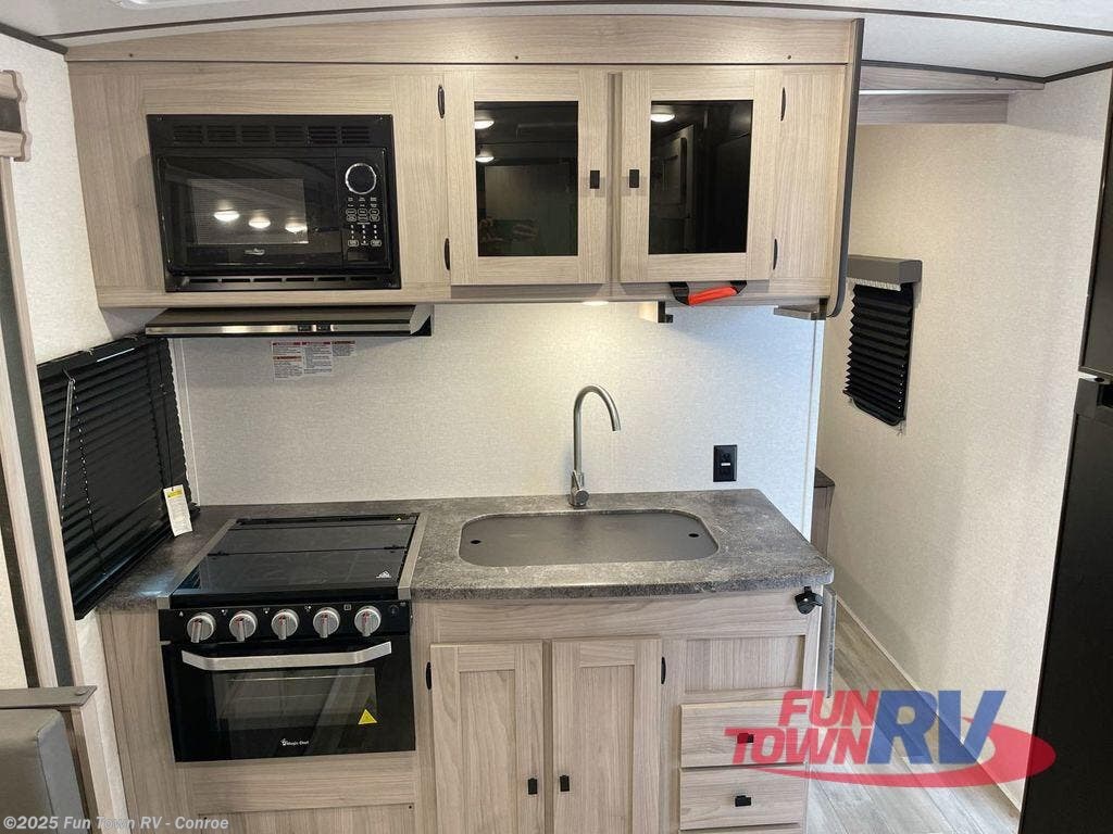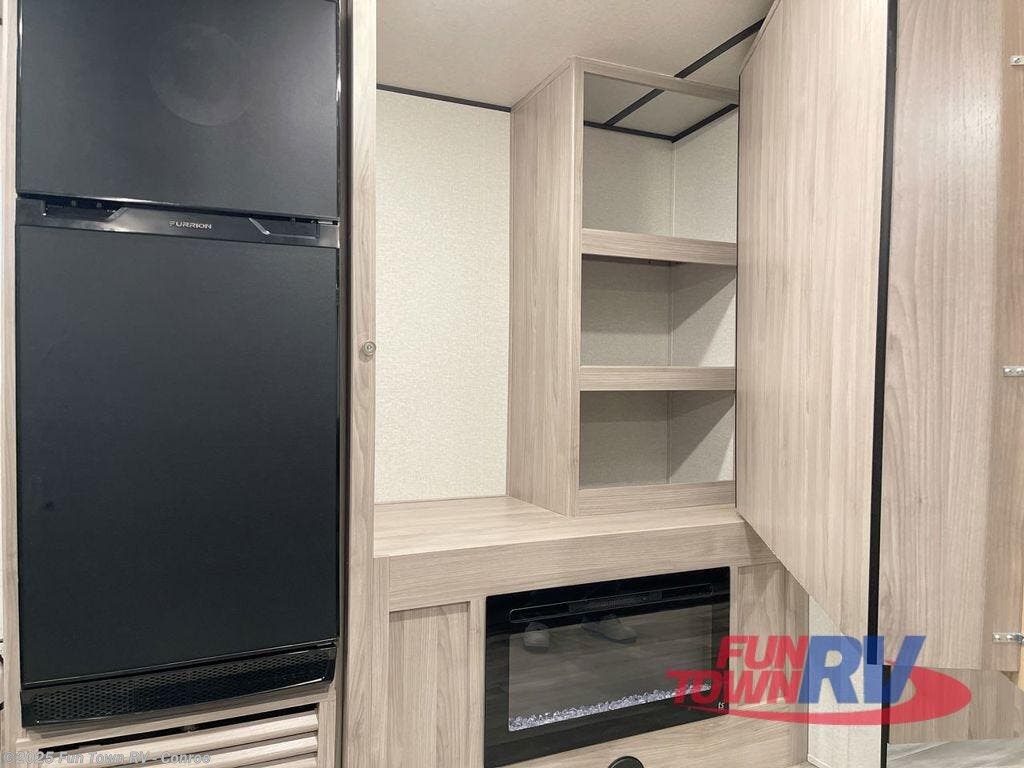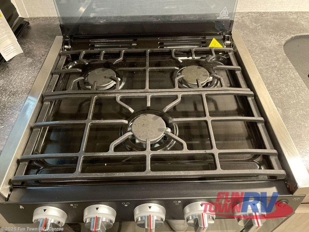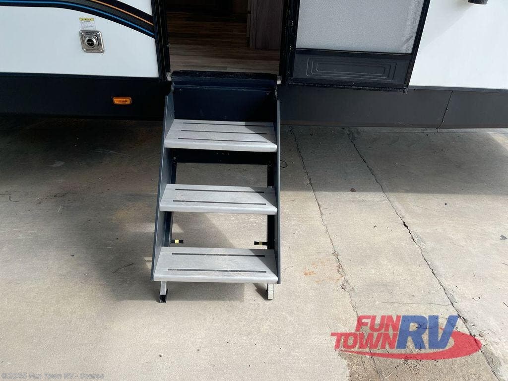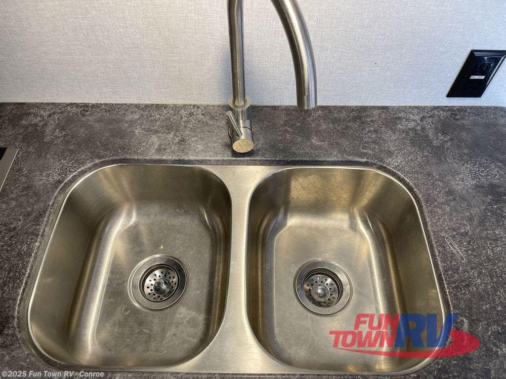 This travel trailer will be perfect to see family and friends in other states or camping for long-periods of time. There is an abundant amount of storage in the living and kitchen area, including behind the entertainment center in the hidden pantry and the second pantry with shelves, plus in the front bedroom under the queen bed with the MAX bed storage system. There is even storage in the rear private bunkhouse cabinet and countertop, plus along the exterior in the pass-through compartment and the Stor-More Cargo in the rear. The side Stor-More cargo door leads you into the bunkhouse to stow items like bikes and totes during travel. You will also love making meals in the kitchen with full amenities including a 10 cu. ft. refrigerator, and outside using the camp kitchen. And having dual entry just makes everything easy especially getting to the full bathroom.