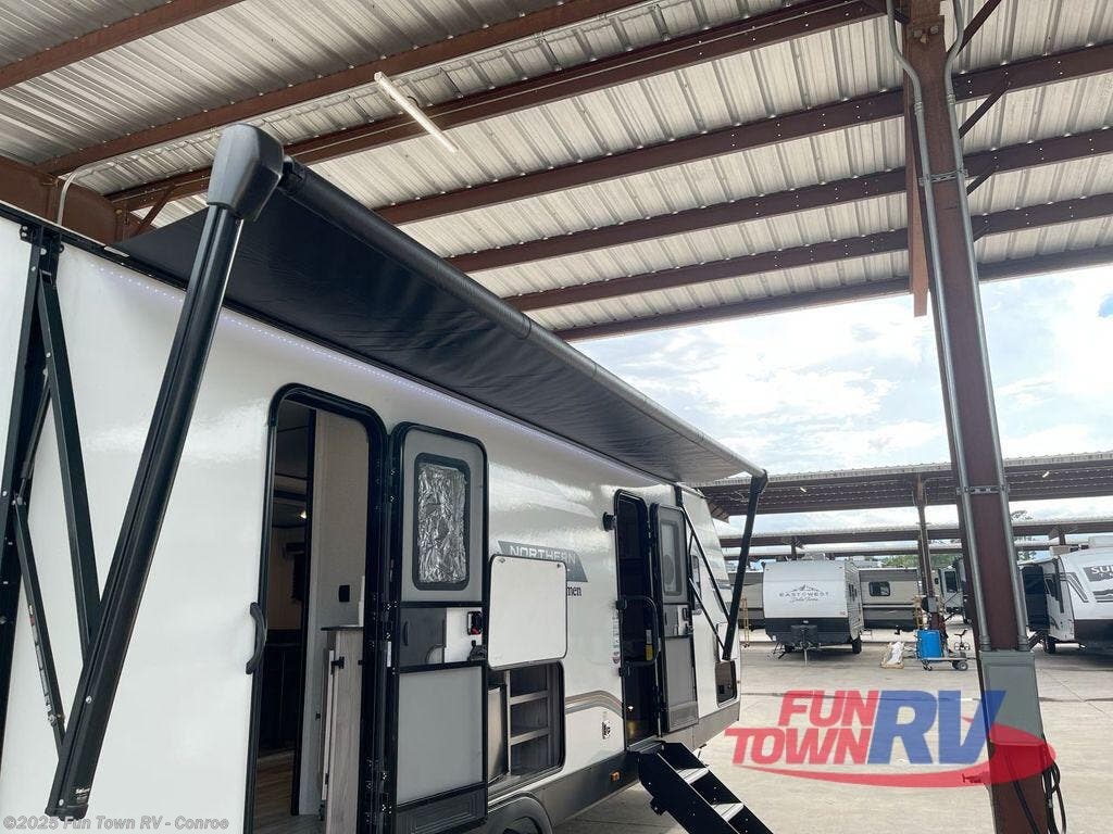 With any Northern Spirit Ultra Lite travel trailer by Coachmen, the "Twice Cool" dual ducted air conditioning system, the motion activated floor lights in the bedroom and bathroom, the lighted USB ports, the digital level, and the motion activated pass-through storage light plus fishing pole storage, will make your camping experience simplified. The heated and enclosed underbelly provides protection on the road and allows you to camp during any season, the 200W solar panel with 30 amp controller provides off-grid camping, and the power tongue jack makes setup easier. Each is built with a 3/4 painted fiberglass front cap with LED strip lights, a laminated, aluminum framed floor, rear wall, and sidewalls, plus 5" trusses with an interior vault. Make your decision today, and camp with everything in its place!