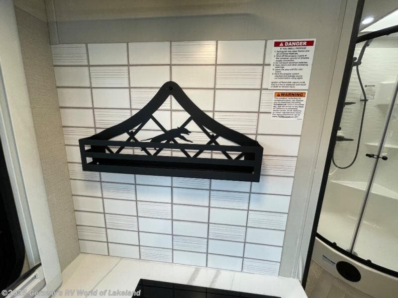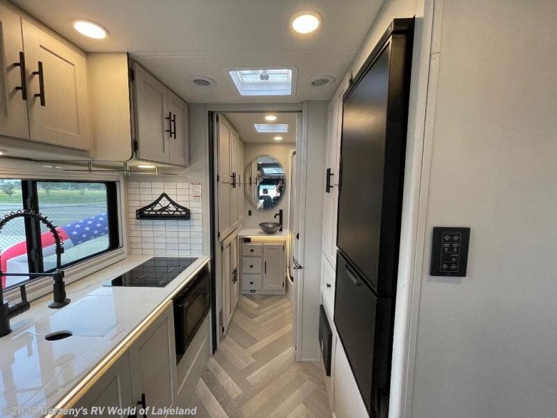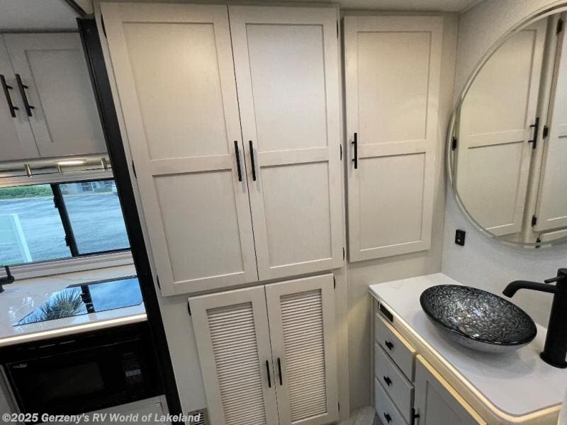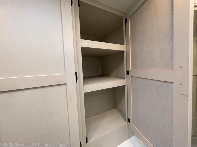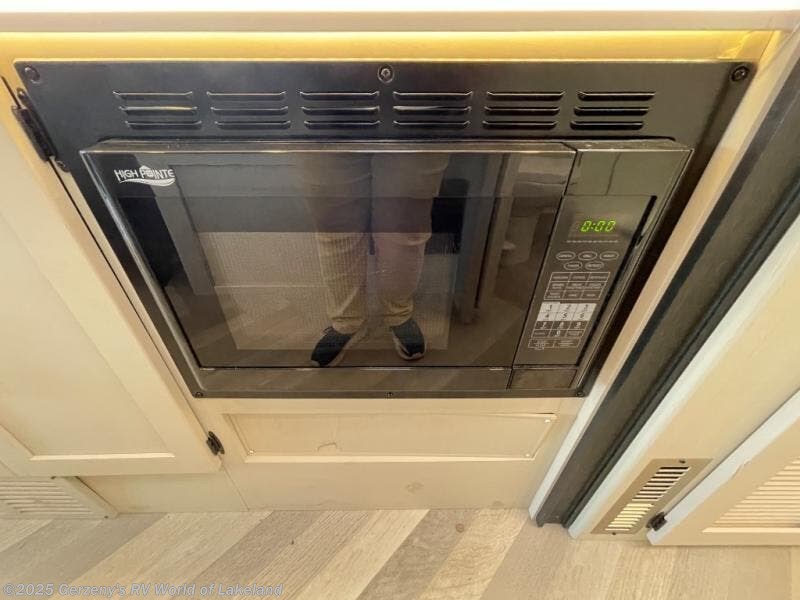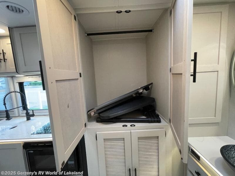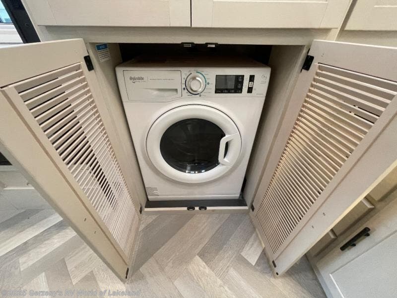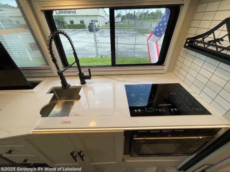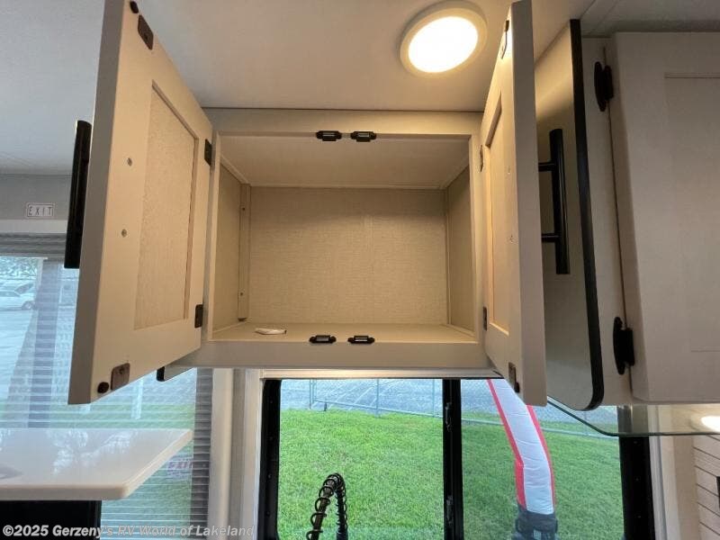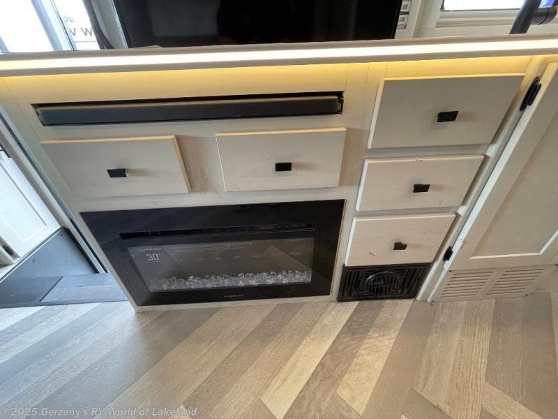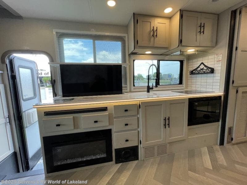 You will enjoy the versatility that this Murphy bed model provides. Depending on whether it is daytime or evening will determine if you have a 60" x 74" bed that slides out or a 62" sofa to enjoy. There is a 45" x 76" cab over bunk that can be used for added sleeping for two more guests, or used as added storage space. The rear full bath is spacious and private and includes a 32" x 32" angled shower, toilet, vanity with sink, plus linen cabinet, and wardrobe. The kitchen features everything needed to create meals while on the go, and a cozy fireplace is included beneath the coach TV for your enjoyment. Outside, you will find a second TV beneath the armless awning so you can enjoy watching your favorite movies and games whenever you like.