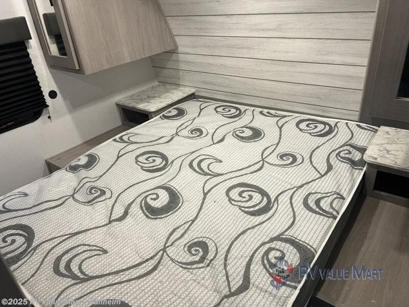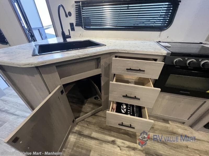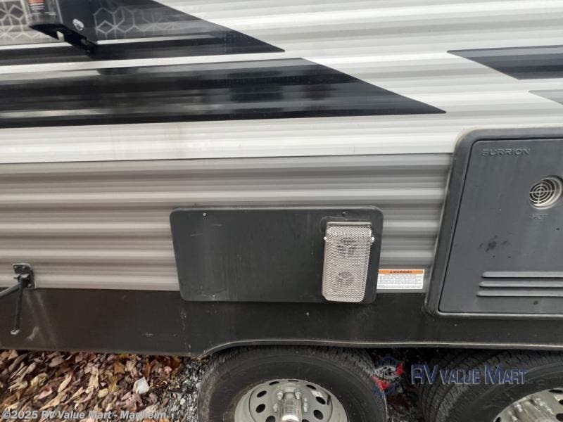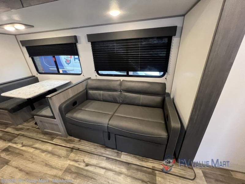 Camp comfortably with your larger group in this trailer that gives you privacy in the front bedroom with a queen bed and dual access, rear double-size bunks next to the full bathroom with the second entry/exit door to the trailer that is super convenient, and a furniture slide that includes a booth dinette and a reclining sofa that some will surely love sleeping on. The main area also includes a fireplace and kitchen appliances including a 10 cu. ft. refrigerator, a farm style sink with high rise faucet, and storage. There is more storage found outside in the pass-through compartment allowing you to take along the larger camping items like camp chairs and tables, charcoal and even fishing poles.
