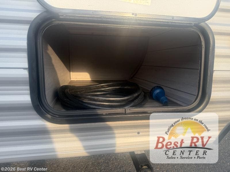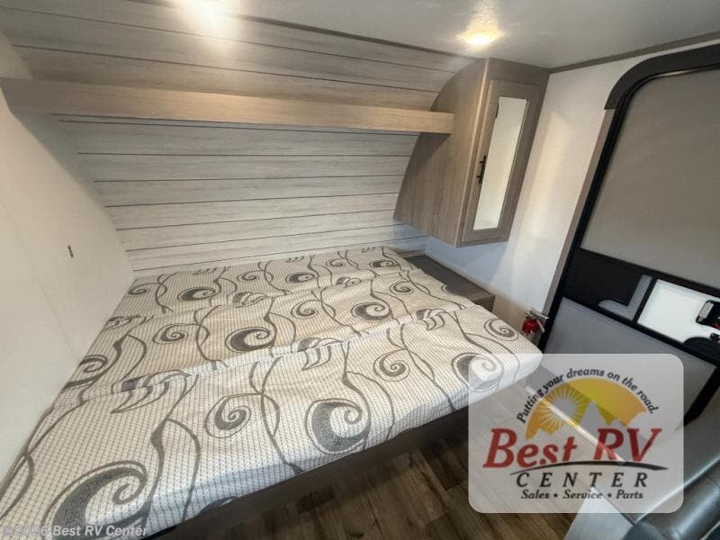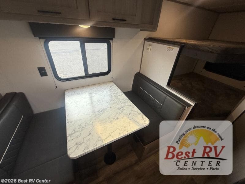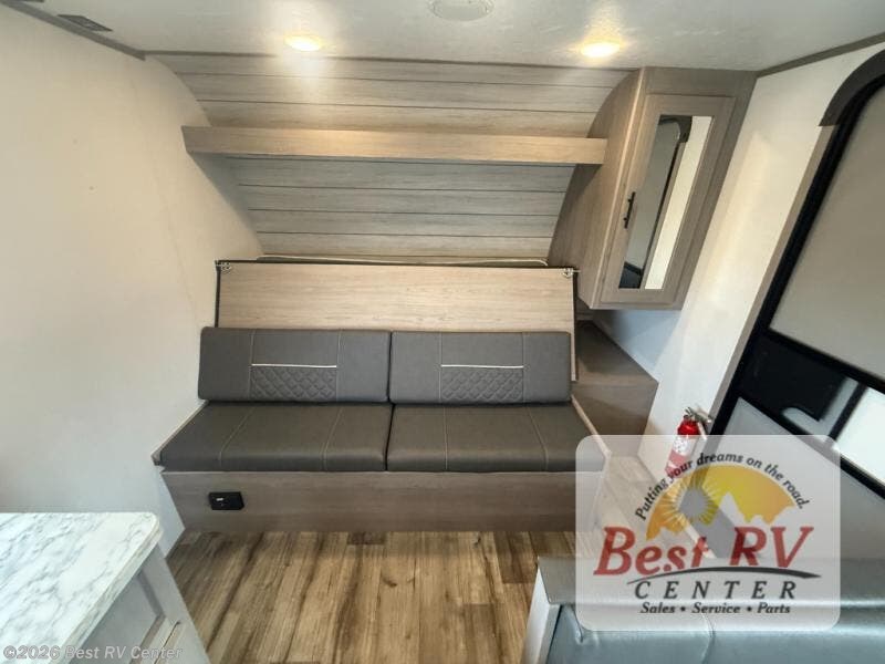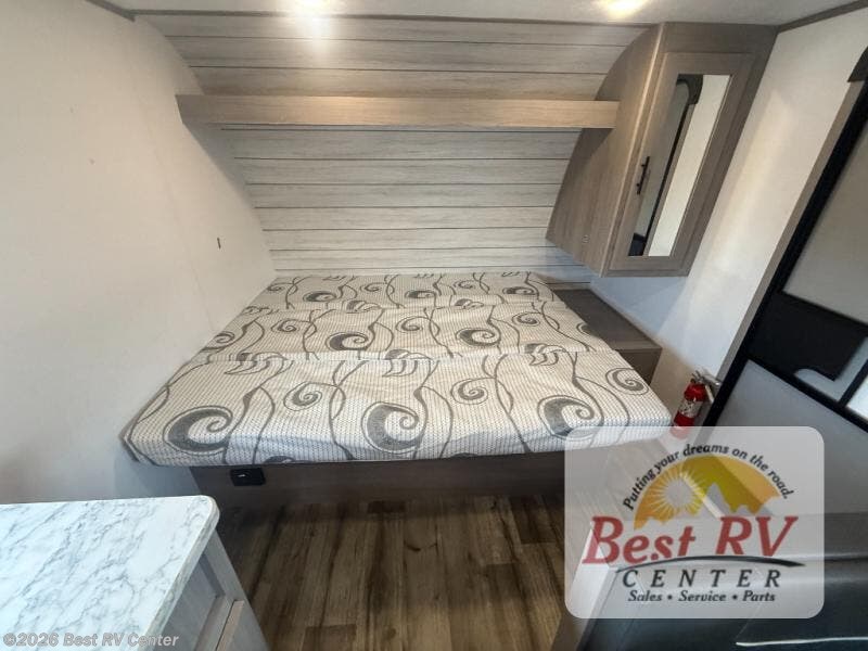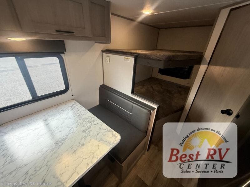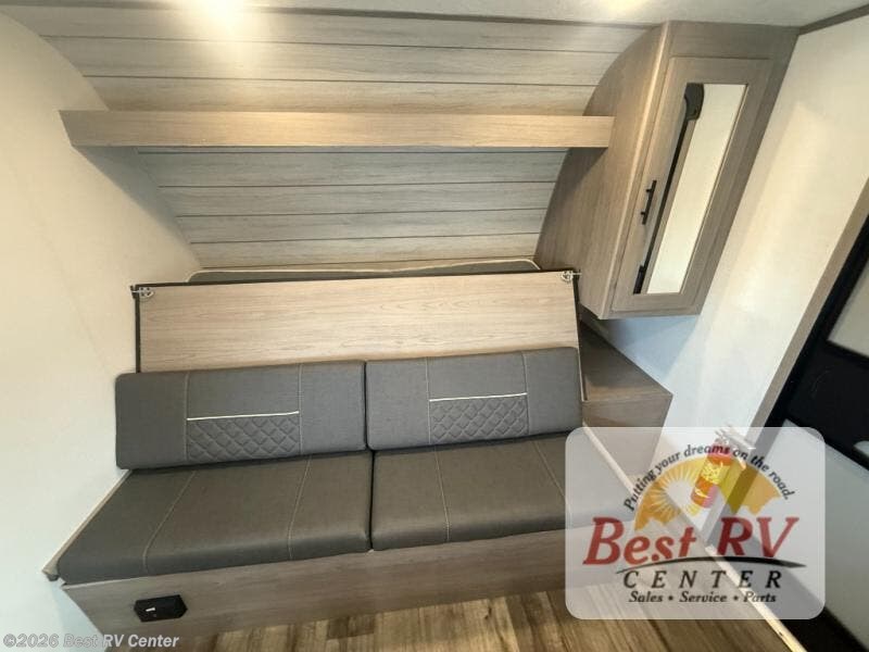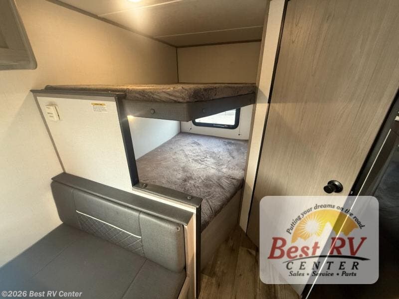 Camping trips to the lake are made cozy in this travel trailer that can sleep six people each night. The Murphy bed up front provides space to sleep at night, and in the morning you can fold it away to relax on the sofa. The kids are sure to love the bunk beds, and there is a booth dinette that can serve as additional sleeping space when it's not being use to dine at. This model also includes a 10' power awning that will provide shade during the day!