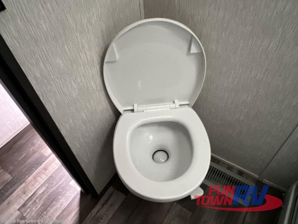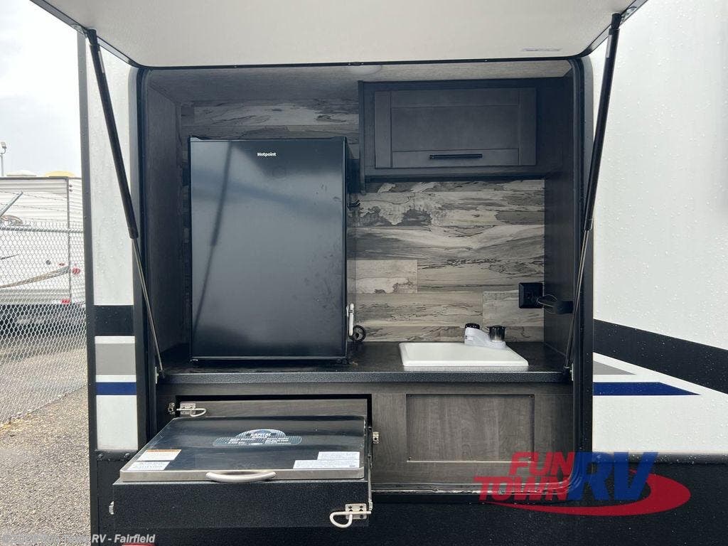 If you've been dreaming of camping with friends and family, take a look at this fifth wheel that can sleep nine people each night. The little ones will spend their time in the private bunkhouse when they're not outside riding their bikes. The half bath includes its own exterior entry door so your guests won't drag dirt through the whole trailer just to use the restroom, and the second entry door conveniently leads into the main living area. Here, you can relax on the booth dinette and tri-fold sofa within the large slide out, and if you're wanting even more comfort, just choose the optional power theatre seats in place of the tri-fold sofa. You will find all the appliances indoors to prepare meals each day, plus there is an exterior kitchen that will be perfect when frying fish or bacon!