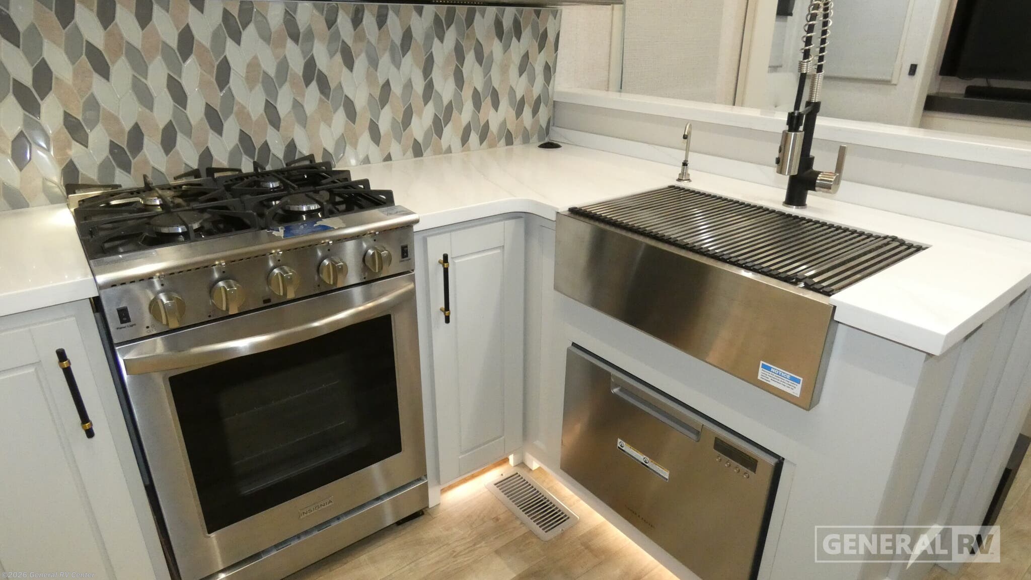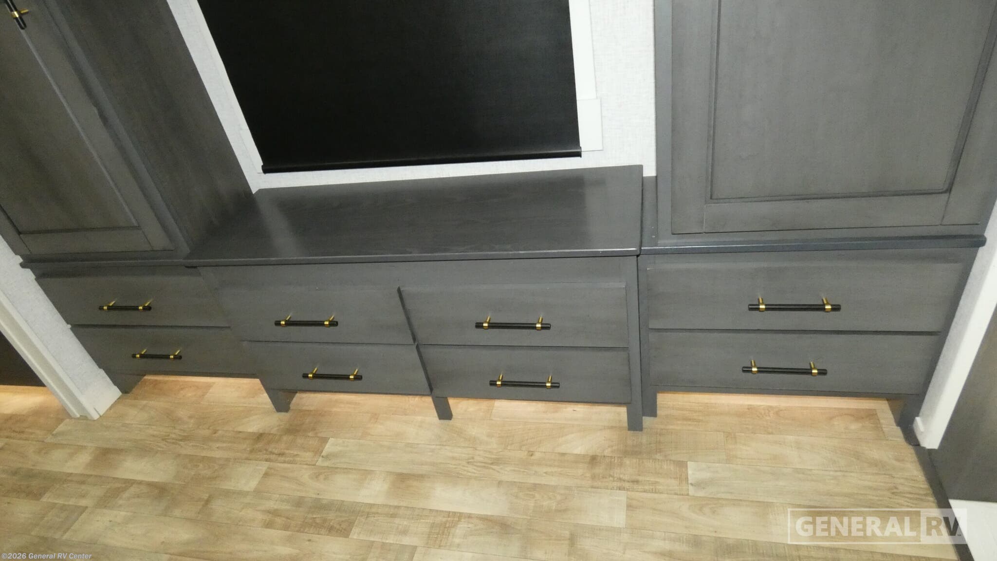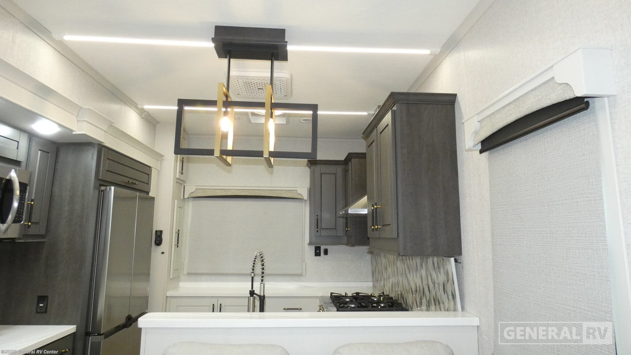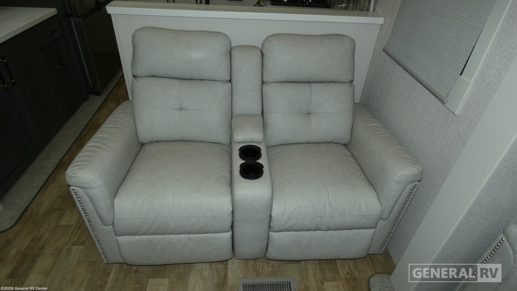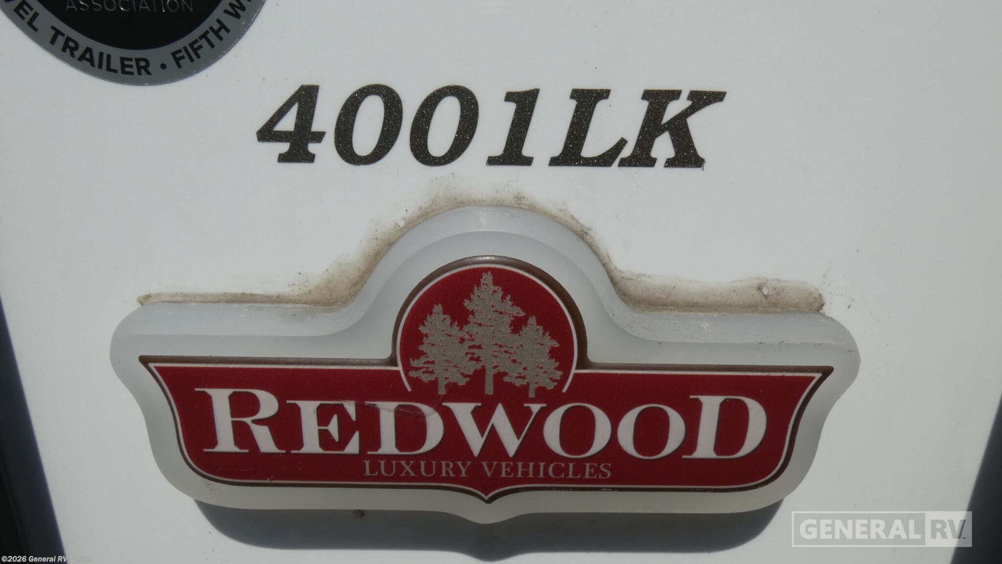 **Redwood RV fifth wheel 4001LK highlights:** - Rear Kitchen - Four Slides - Theater Seats - Bath and a Half - Master Suite - Ceiling Fan One step inside this fifth wheel and you'll see why it's an award-winning most-popular unit! You'll love the rear kitchen that includes ample countertop for food prep and a slide including the refrigerator, pantry and microwave for added moving around space. Head to the main living area where you can enjoy some family time on the theater seats, and the dinette with chairs will be the perfect place for a game of cards. The half bath is right off of this room for convenience, and your guests or kids can convert the tri-fold sofa into a bed for sleeping space at night. You will love the master bedroom with a king bed slide out, a dresser with a flip-up lid, plus a 39" TV. The front full bath is super spacious, and it includes a large walk-in wardrobe where you can even add a washer and dryer if you choose! You are going to wish you found the Redwood fifth wheels sooner! With all of the residential comfort and modern luxury, you will be impressed. The Williamsburg Furniture Collection includes two premium dinette chairs, a buffet-style adjustable dinette with leaf extension, a residential-style sofa, and powered theater seating. The luxury further extends to the bedroom where you will find a gel-foam king bed with tilt and C-PAP shelves on both sides of the bed. The straight roof line gives a luxury profile, and there are preparations for a wireless backup camera as well as solar power. The seamless residential insulated heat ducts will efficiently heat your unit, and there is an exterior radio in the fully finished and heated pass-through with slat board storage.