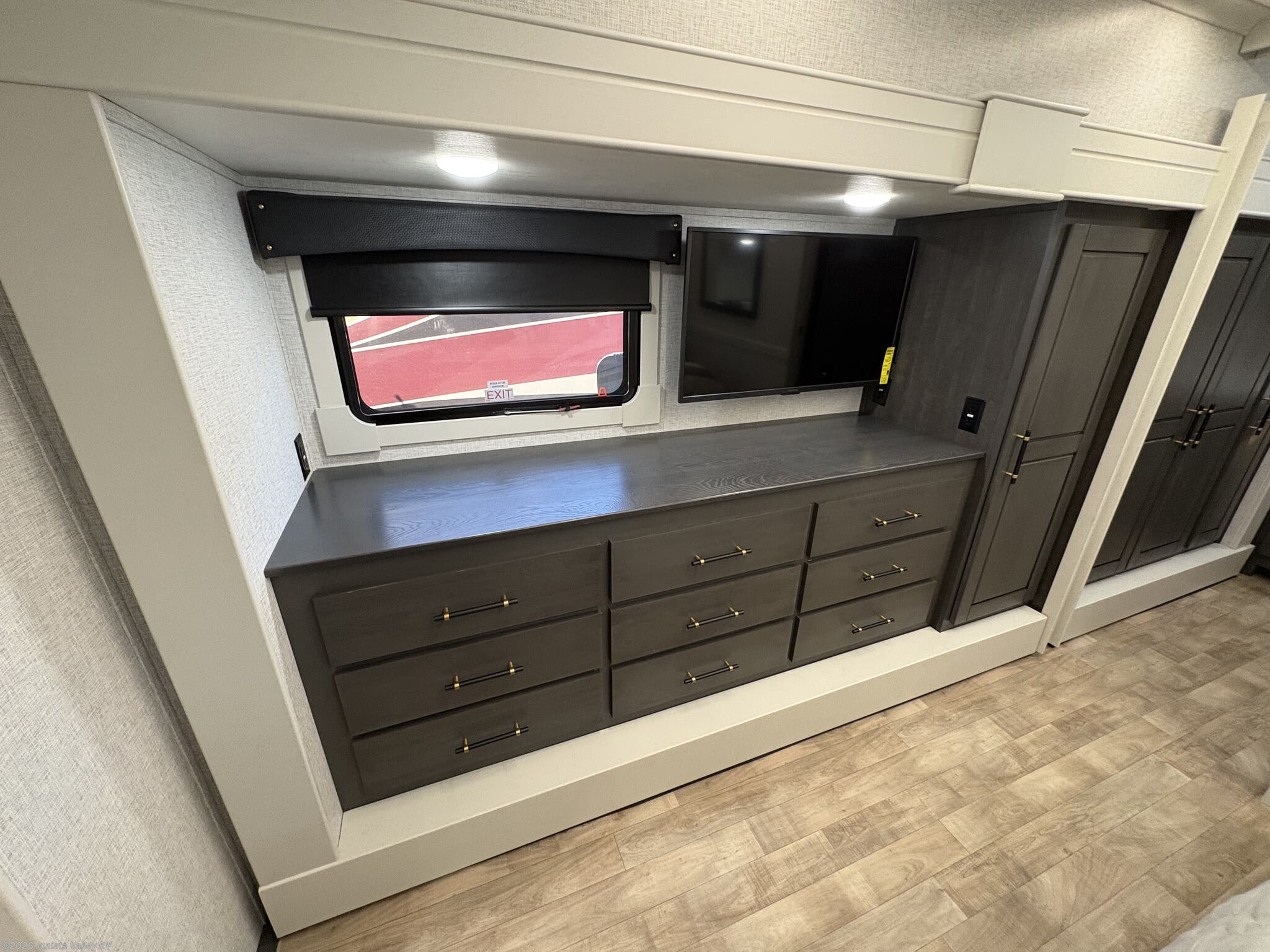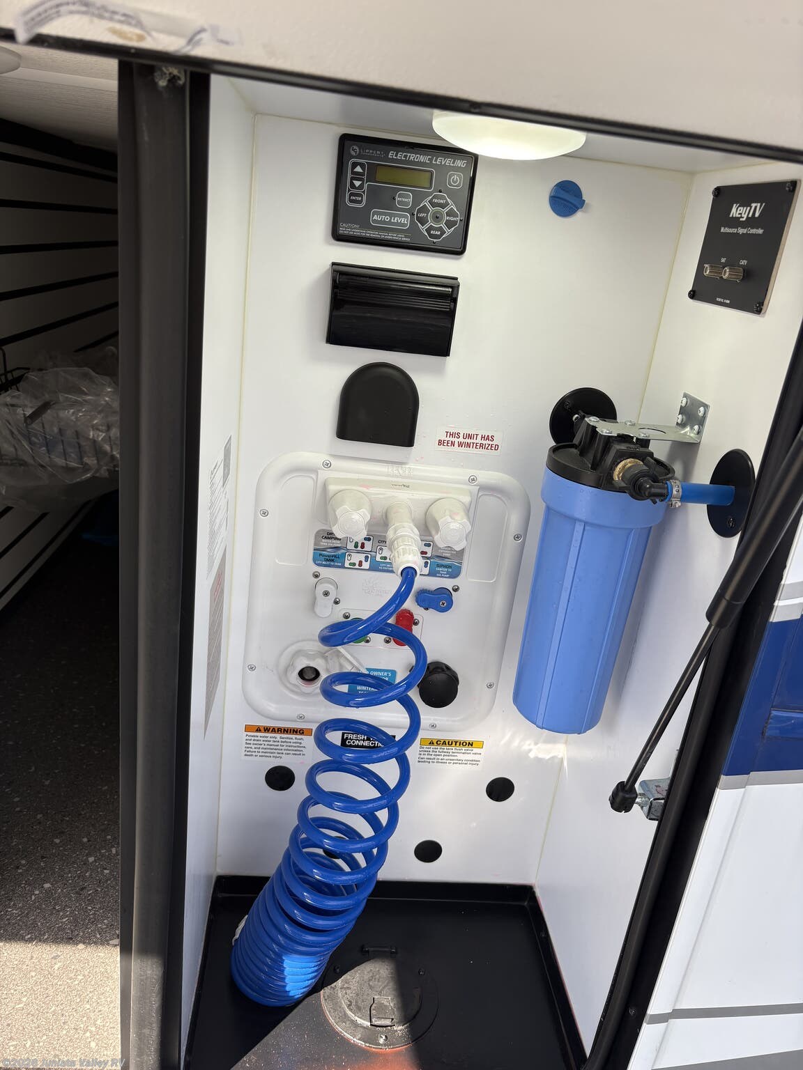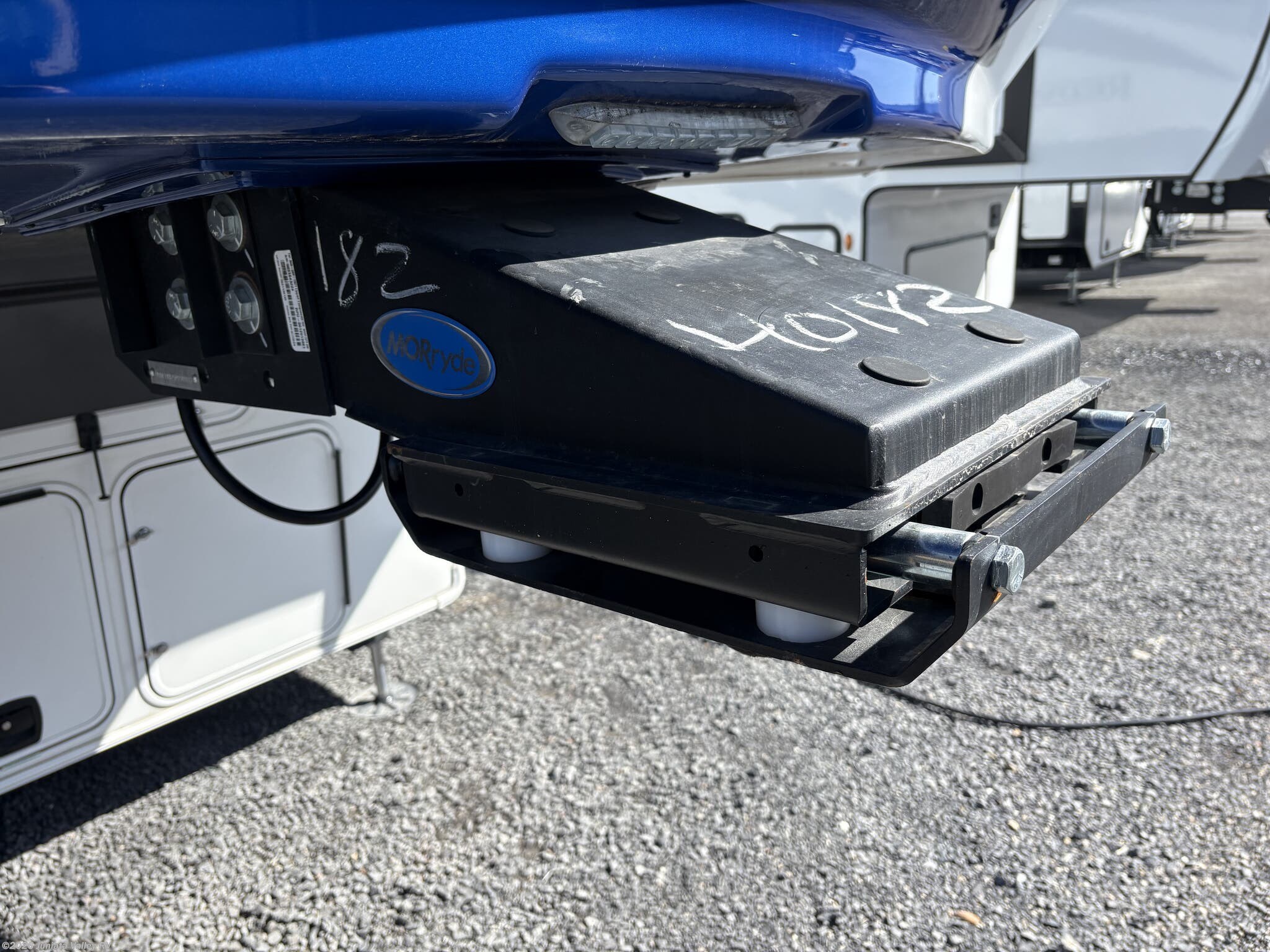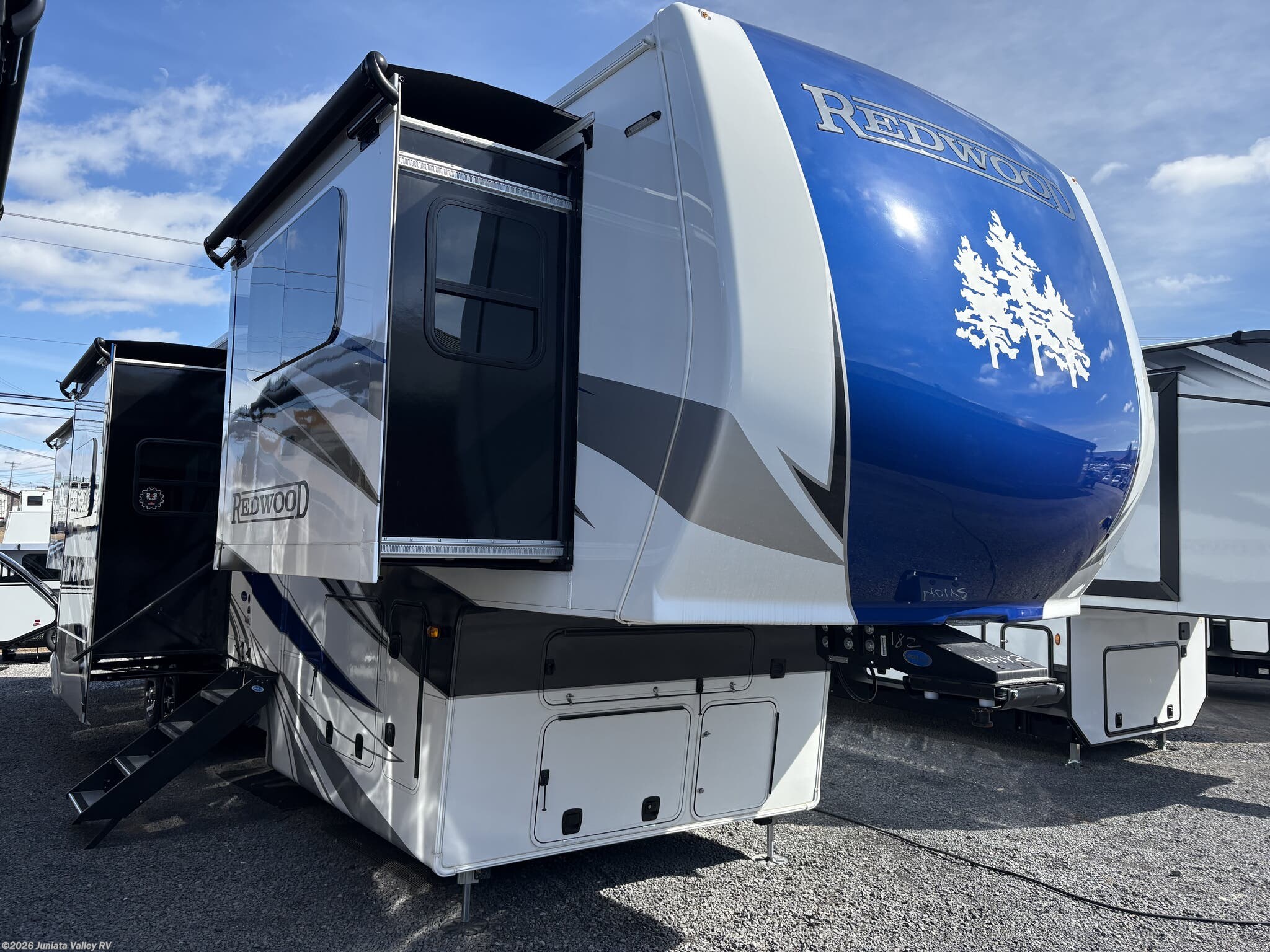 Just in from the factory, Redwood 4200 FL. This beautiful, luxury 5th wheel is very well equipped. Some of the options are; custom full body paint in Topaz blue, Redwood Full-time living package, tankless water heater, generator prepped, washer & dryer prepped, residential refridgerator, 3rd 15,000 BTU A/C, 6 point hydraulic auto leveling, 8,000LB axels with H range tires, rear 2" receiver, Dual pane frameless windows, Firefly smart automation system, slide awnings and dishwasher.