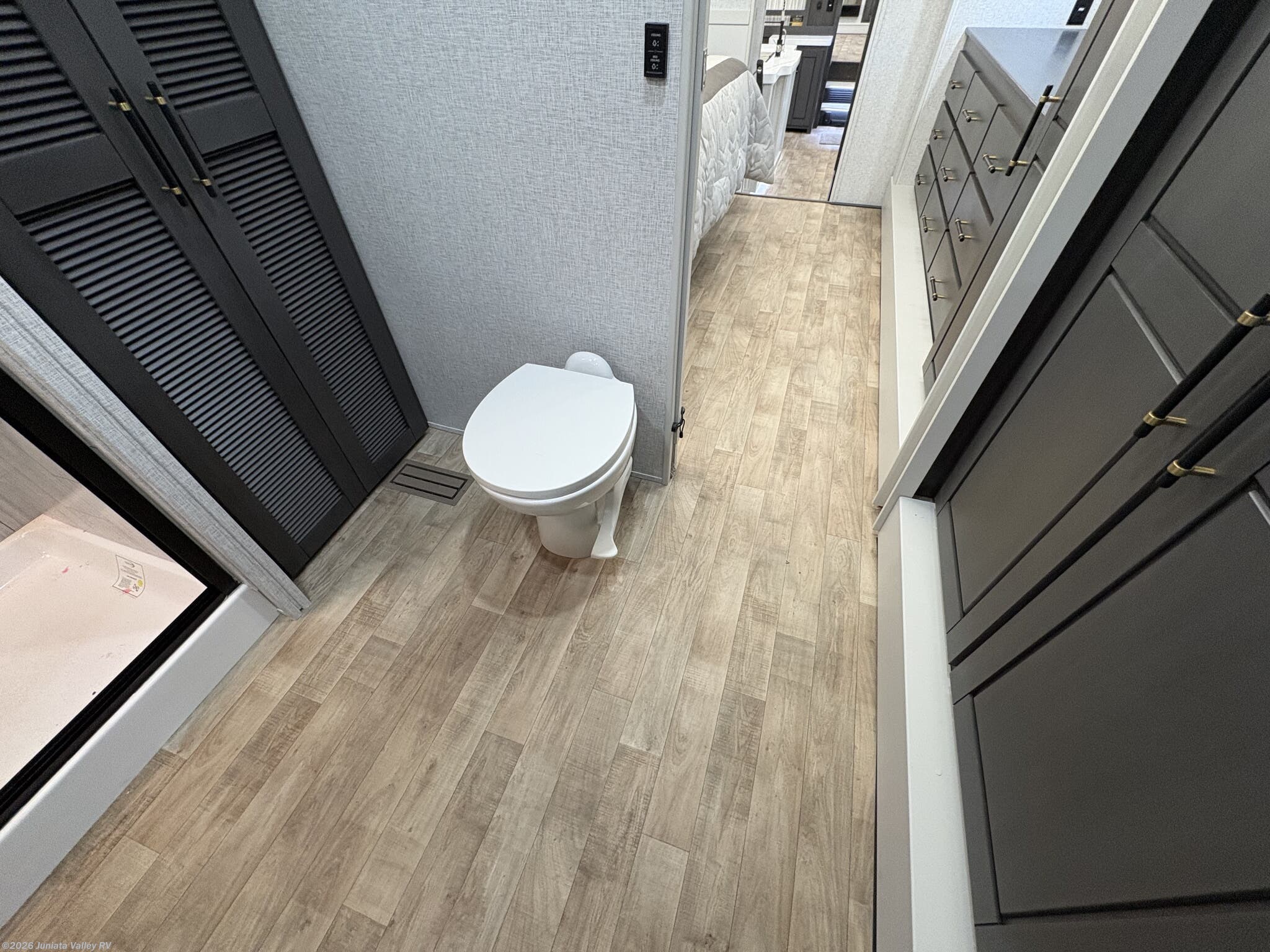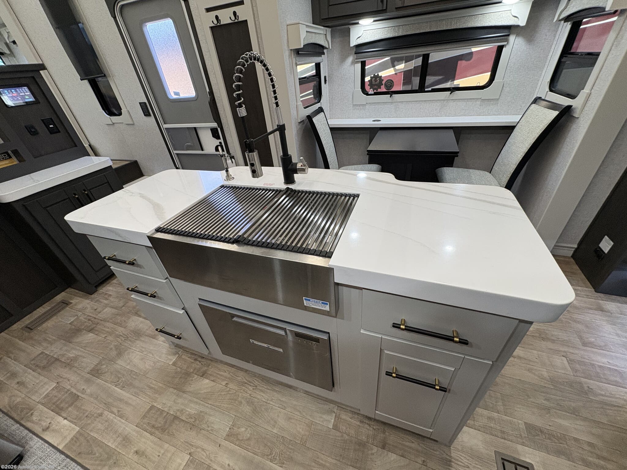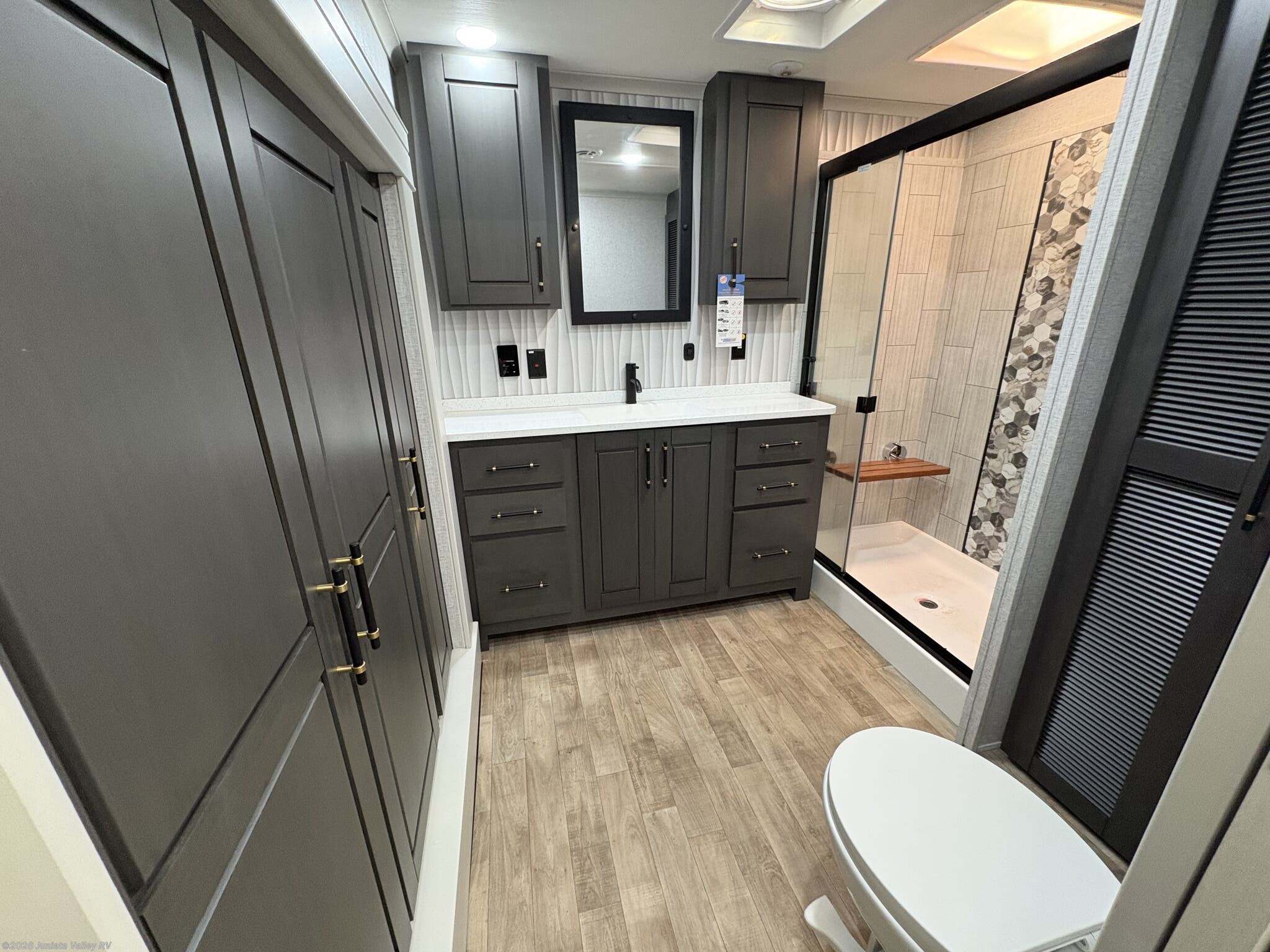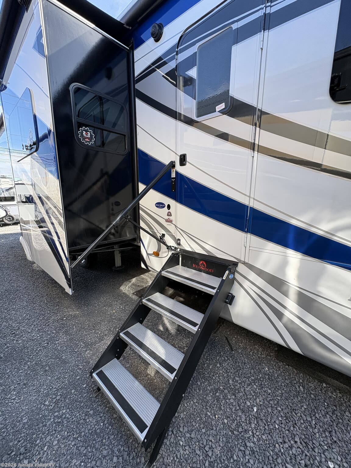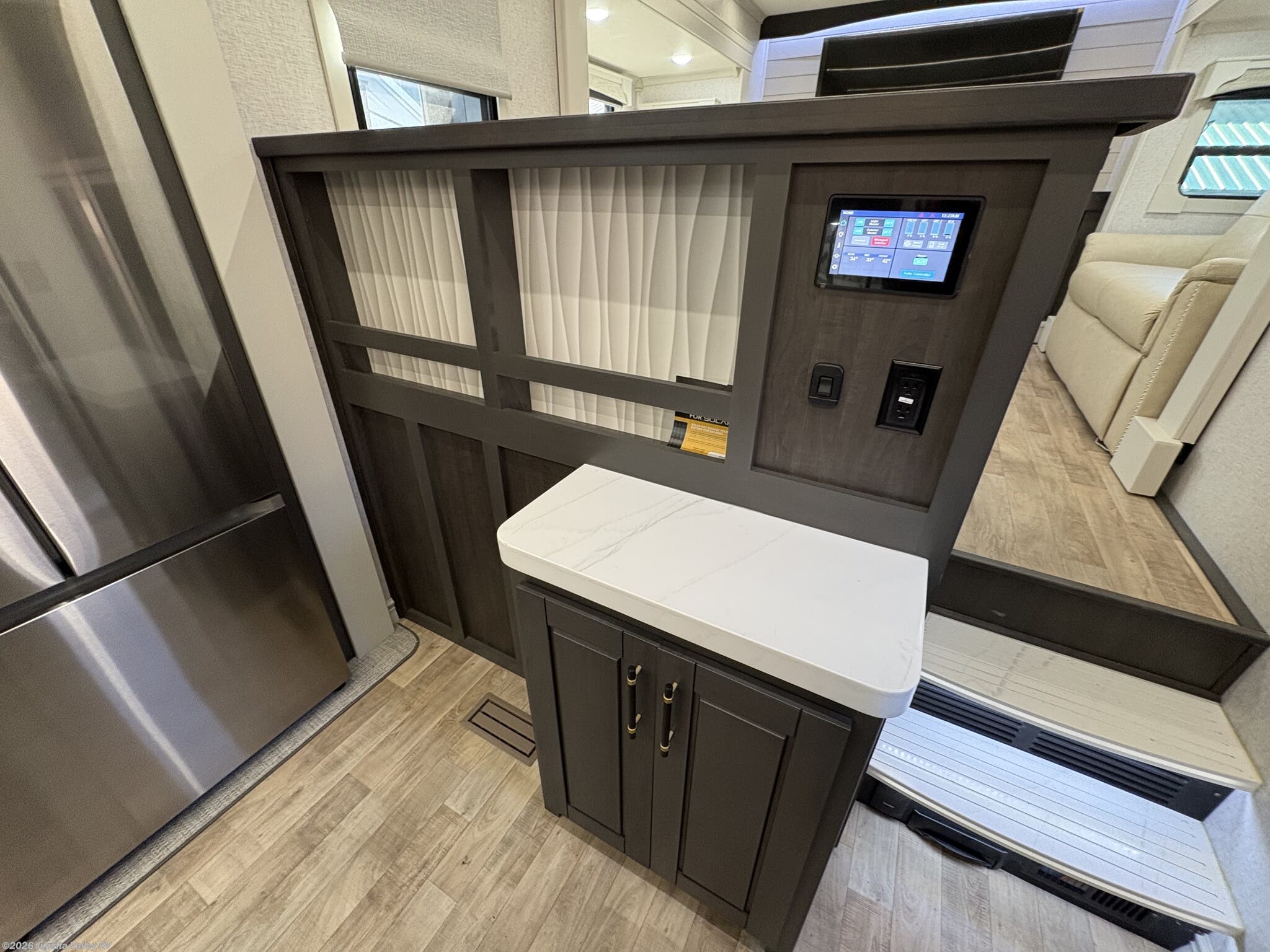 Just in from the factory, Redwood 4200 FL. This beautiful, luxury 5th wheel is very well equipped. Some of the options are; custom full body paint in Topaz blue, Redwood Full-time living package, tankless water heater, generator prepped, washer & dryer prepped, residential refridgerator, 3rd 15,000 BTU A/C, 6 point hydraulic auto leveling, 8,000LB axels with H range tires, rear 2" receiver, Dual pane frameless windows, Firefly smart automation system, slide awnings and dishwasher.