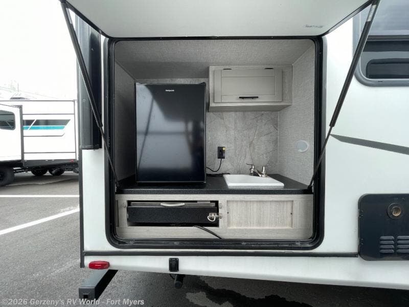 You will love the added interior space you have in this travel trailer thanks to the large slide out in the main living area. Here, you'll enjoy playing cards at the XL booth dinette and relaxing on the tri-fold sofa. Make home-cooked meals on the glass top range or use the exterior camp kitchen. There is even an exterior refrigerator for cold drinks, and the power awning will shade you from the hot summer sun. This model features a full rear bath for added privacy, and the shower skylight will allow natural light in. The front private bedroom includes a king bed, dual wardrobes, plus a shoe storage and pet station for your convenience!