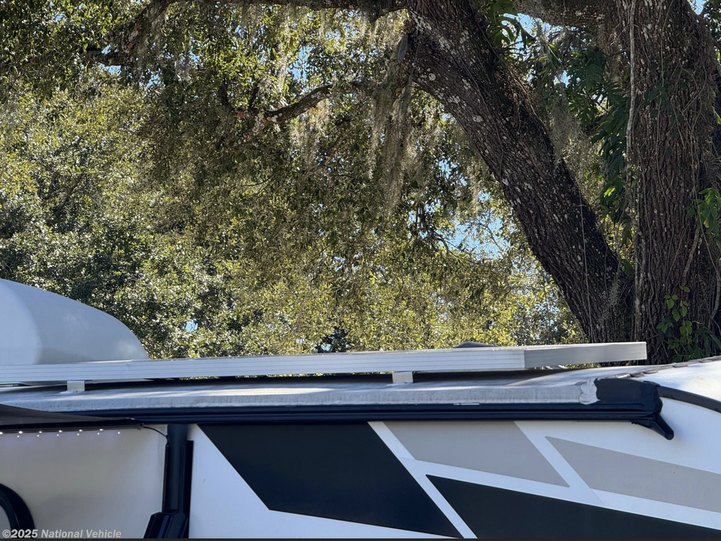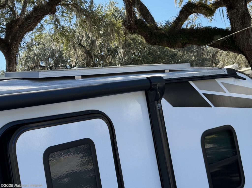 Power awning with LED lighting, outdoor kitchen, solid-step entry, Bluetooth speakers, aluminum wheels, and pass-through storage for all your gear.