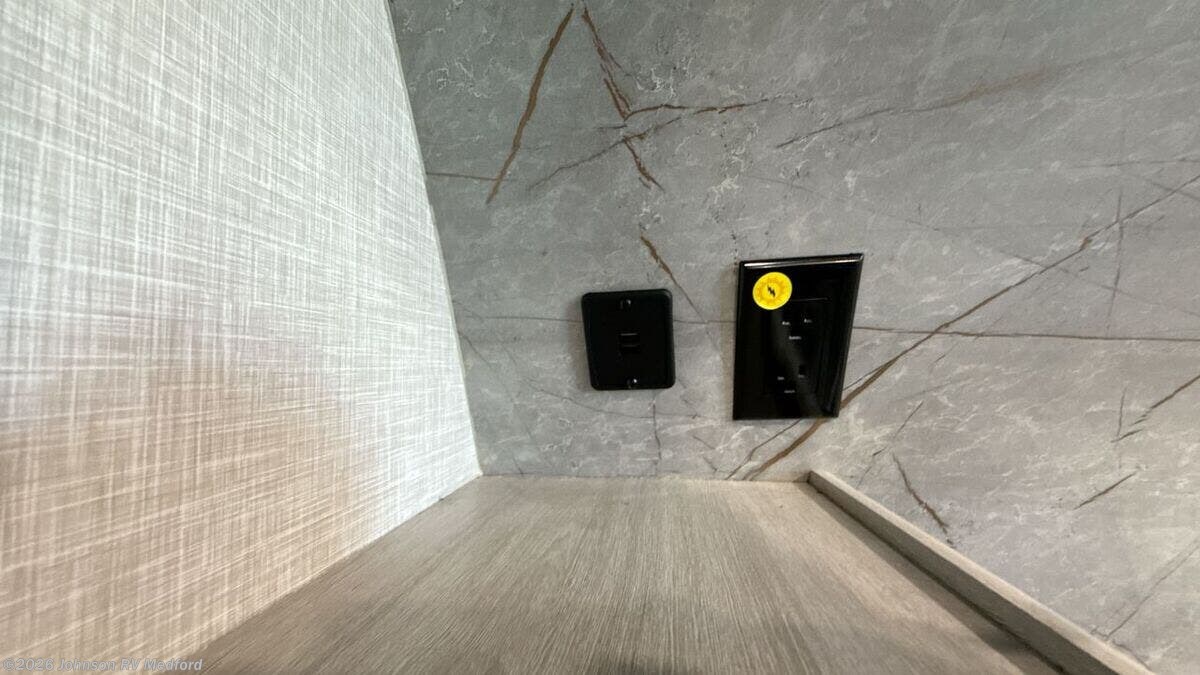 Features Include: Barreled Ceiling, Command Panel, Tinted Safety Glass, Privacy Shades, Fireplace Dining, Booth Dinette, Solid Wood Drawers, Sink Cover, Glass Top Range, Gas Oven, Systems Center, KeyTV, Outdoor Speaker LEDs, Solid Bedroom Door, King Mattress, Decorative Bedspread, Bed Base Pet Station, Medicine Cabinet, Glass Shower Door, Foot Flush Toilet, Mechanicals, Solar Prep, 13.5k AC, EZ Lube Hubs, Aluminum Wheels, Laminated Sidewalls, Walk On Roof Deck, Roof Ladder, Black Tank Flush