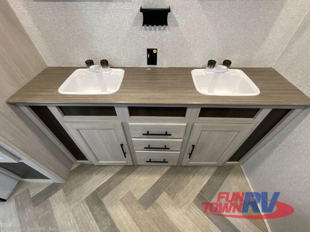 You need this award-winning travel trailer for your next weekend getaway! The full rear bathroom is decked out in features you're going to love like the dual-sink vanity for two to get ready at once, the linen closet next to the 30" x 36" shower and the second linen closet across from the closet that is prepped for the optional washer and dryer to be added. After a fun-filled day outdoors, you can head inside and relax on either the 60" jackknife sofa and enjoy the entertainment center with a fireplace or grab a snack from the 10-cu. ft. refrigerator and play a few card games at the 42" x 80" U-shaped dinette. The front private bedroom features a 60" x 74" RV queen bed with shirt closets on either side of it to keep your clothes looking nice!