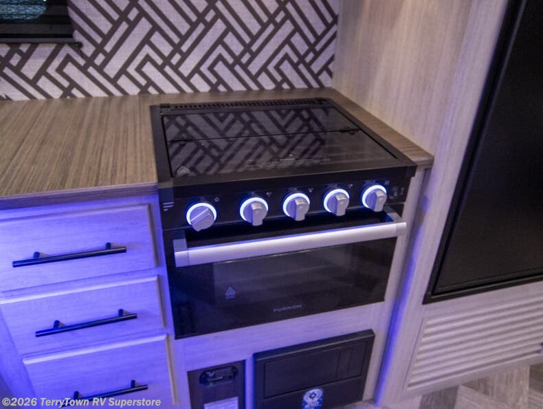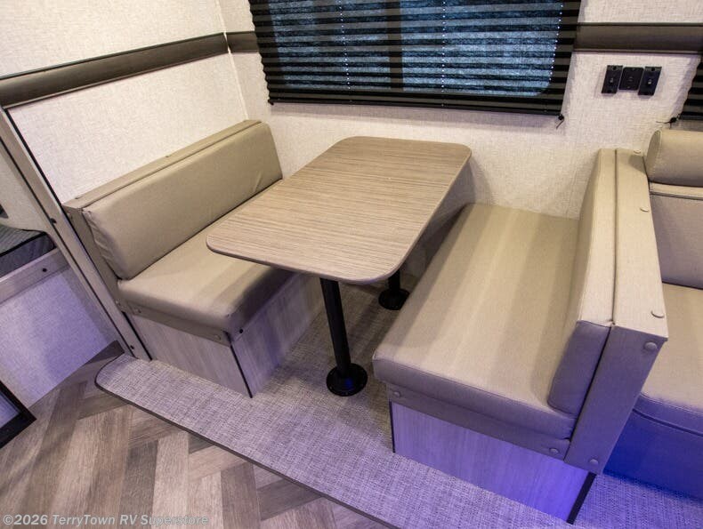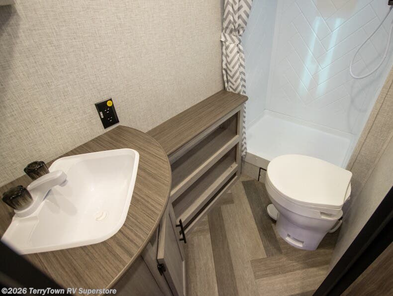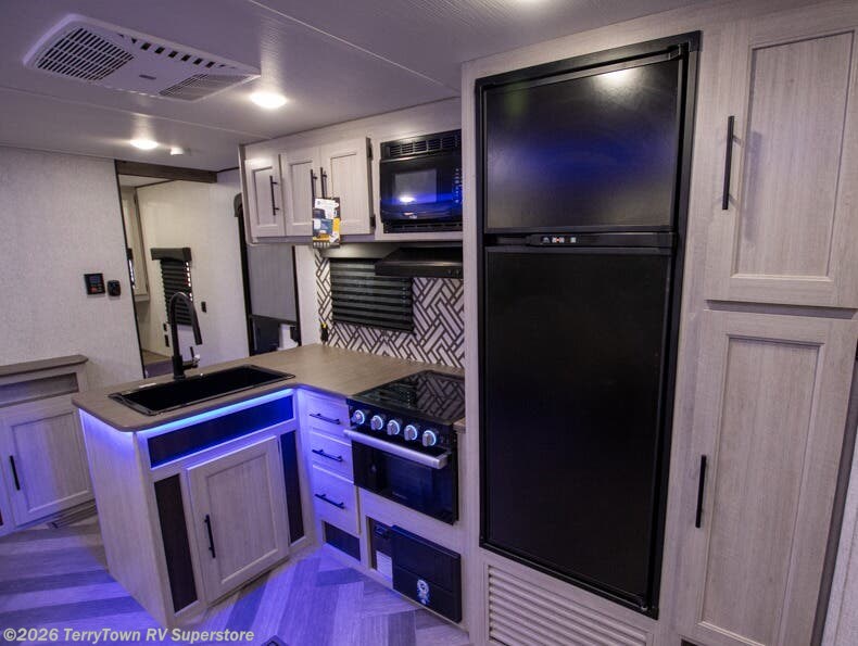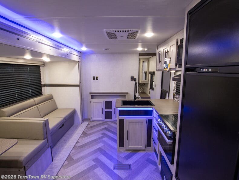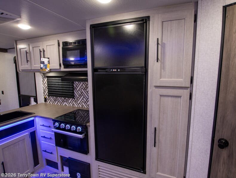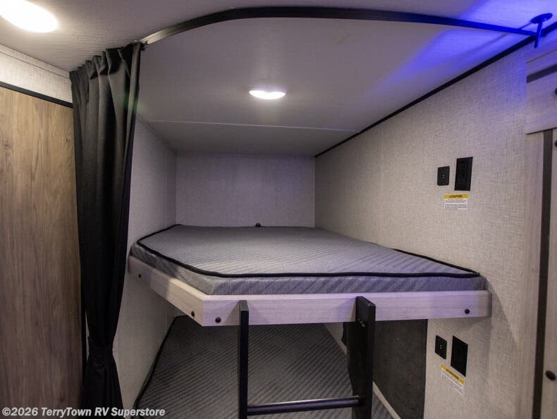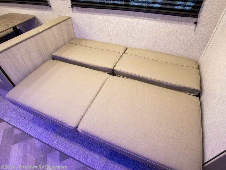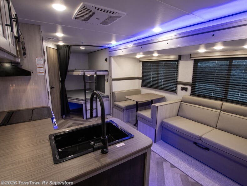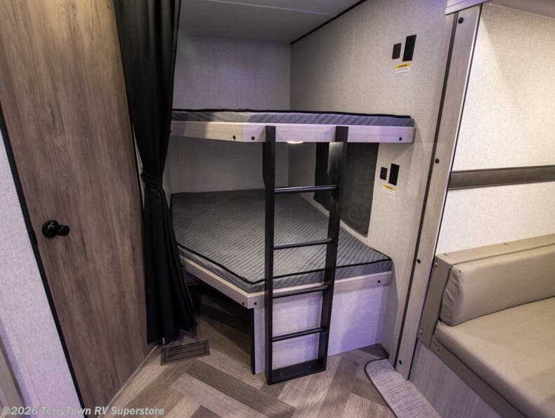 If you've been searching for a travel trailer that can sleep more campers and give you more interior space, this is the one! There are double-size bunks with a ladder for the little ones, an RV queen bed in the front bedroom, plus a jackknife sofa and booth dinette that will double as seating and sleeping space. You will be able to make home cooked meals for your crew since there is a three burner range with a glass top and LED lit knobs, and the 10 cu. ft. 12V refrigerator can keep your food fresh. This model also includes a full bath with a 30" x 36" shower, a foot flush toilet, and a medicine cabinet to keep items organized.