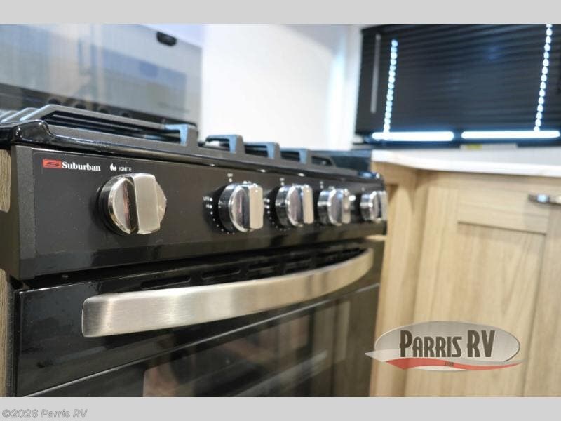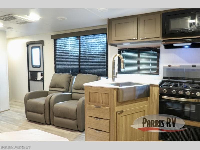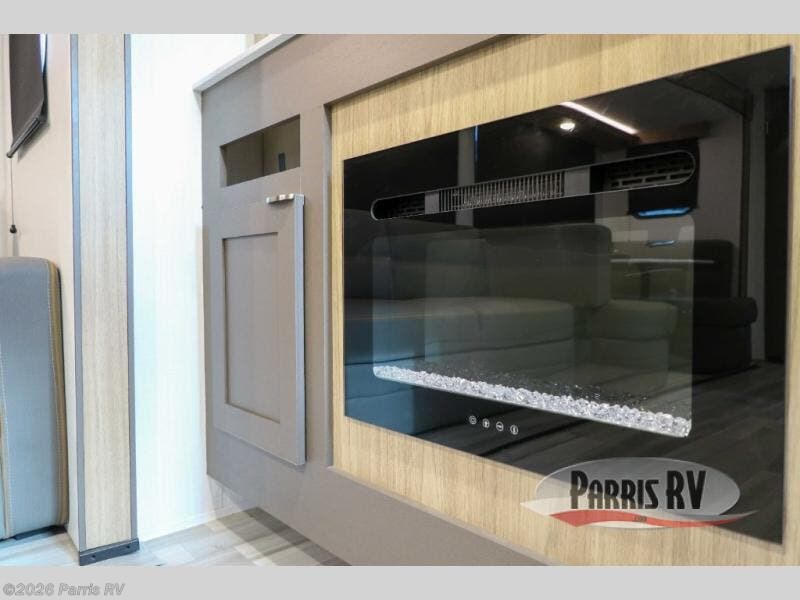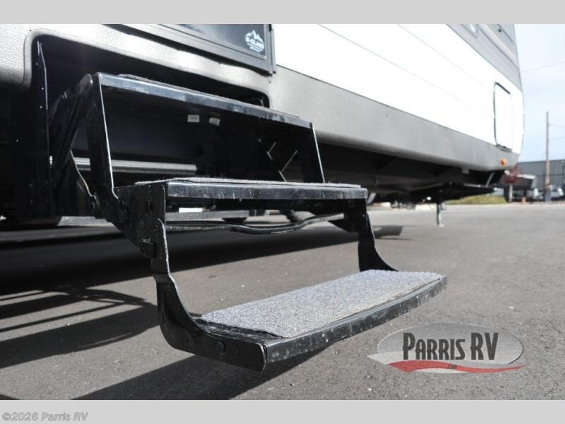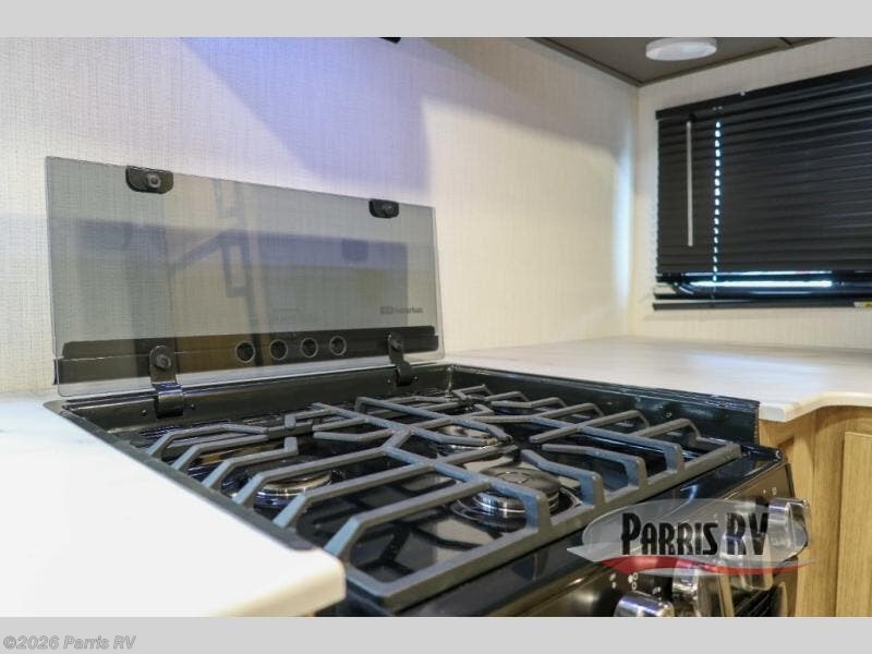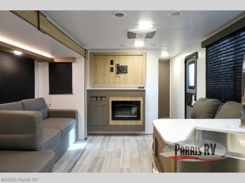 Start a new journey in this cozy travel trailer for five to six. The rear kitchen includes ample counter space to prep meals, a three burner cooktop, plus a spacious pantry where you can keep dry goods and snacks. There are two lounge chairs to relax on, along with a Lux Lounge, and a booth dinette. The fireplace is sure to make your space feel a little more like home, as well as the front private bedroom with a queen bed. The spacious full bath is close by the bedroom for convenience, and there is a bedroom wardrobe so you're not living out of a suitcase all weekend! You can unload your camping chairs from the full pass-through storage, grab a cold drink from the exterior refrigerator, and relax under the 18' patio awning!