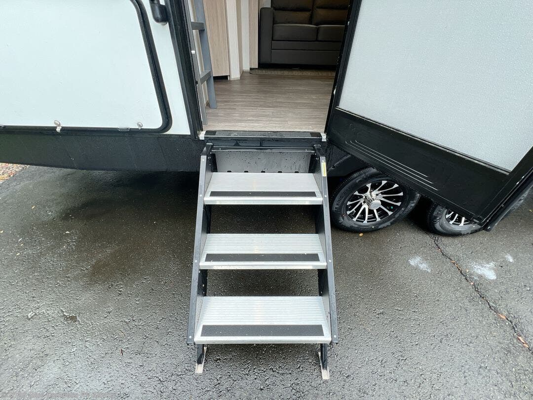 Everyone will have a comfortable place to lay their head at night in this travel trailer! There is a set of double size bunk beds next to the rear corner bathroom, and a queen bed in the front private bedroom which even has one of the dual entry doors to the unit. You could even transform the sofa and booth dinette slide into extra sleeping spaces after eating a meal and socializing together. The kitchen has a three burner cooktop to cook your meals and a walk-in pantry to store your favorite snacks. You can also cook at the outside kitchen and stay protected by the 20' electric awning!