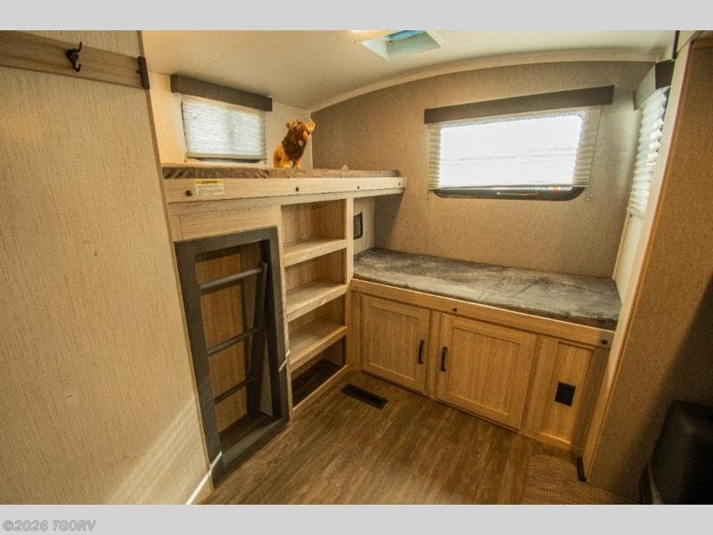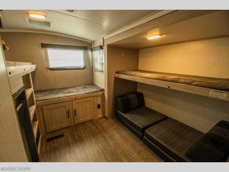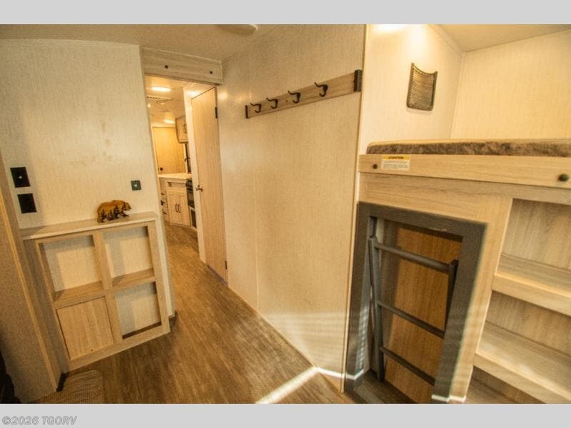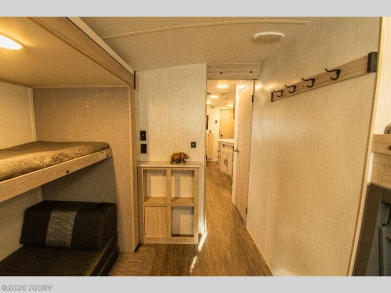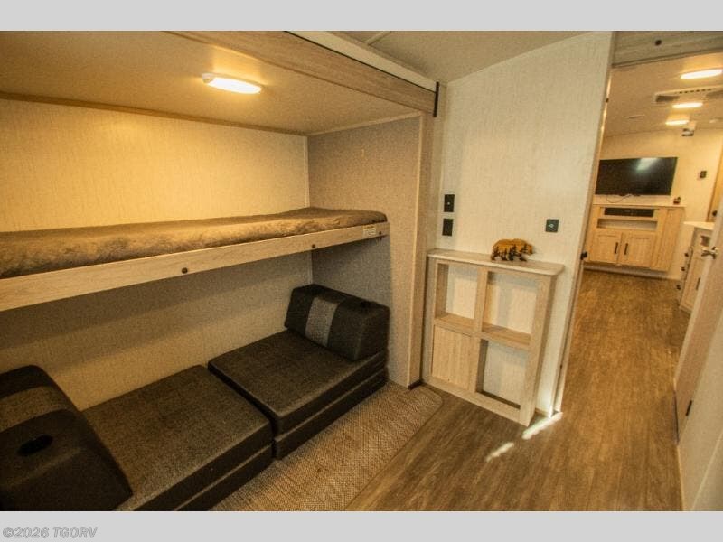 The rear bunkhouse blends sleeping and lounge space with a smart mix of elevated beds and a folding futon, giving everyone room without closing things in. Up front, the private queen bedroom stays tucked away and quiet, offering a comfortable place to reset at the end of the day.