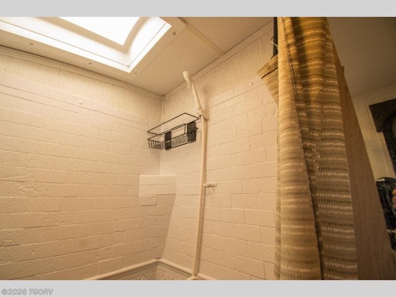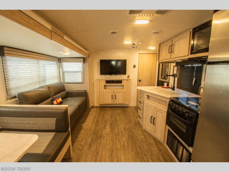 A sofa and booth dinette slide opens up the living space, while meals are simple to prepare inside on the three-burner cooktop or outside at the exterior kitchen. The full bathroom includes a walk-in shower and its own exterior door—one of those details that quickly proves its value.