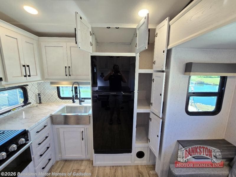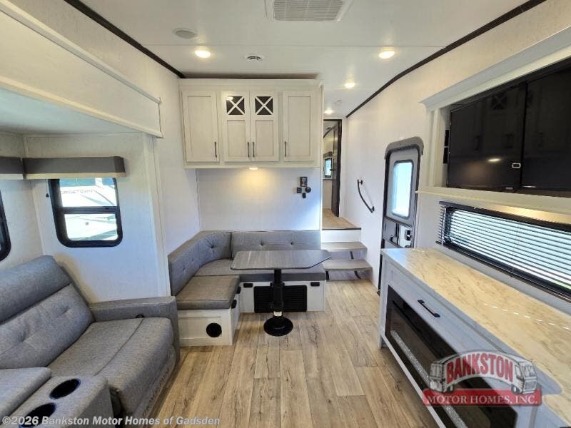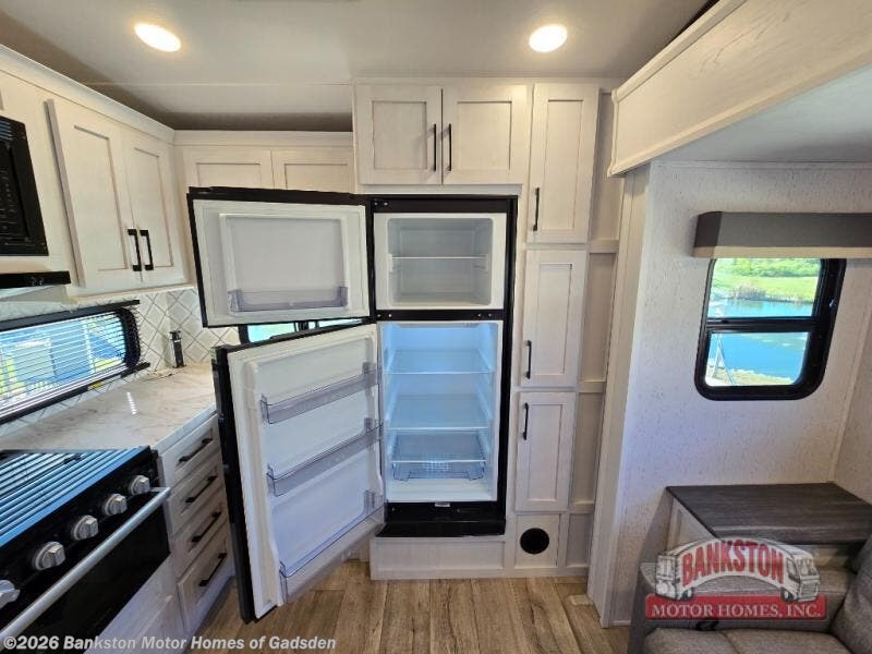 Plan to say awhile in this rear kitchen fifth wheel! You will fall in love with the front bedroom with a king bed slide out, large front closet, a dresser, plus a mounted TV for movies in bed. The rear kitchen includes plenty of space to prep meals, a farm style sink, plus a 10 cu. ft. 12V refrigerator and a pantry for food storage! You can get cozy on the theater seating slide out or at the cafe dinette, and the LED TV will ensure you'll never go bored on rainy days!
