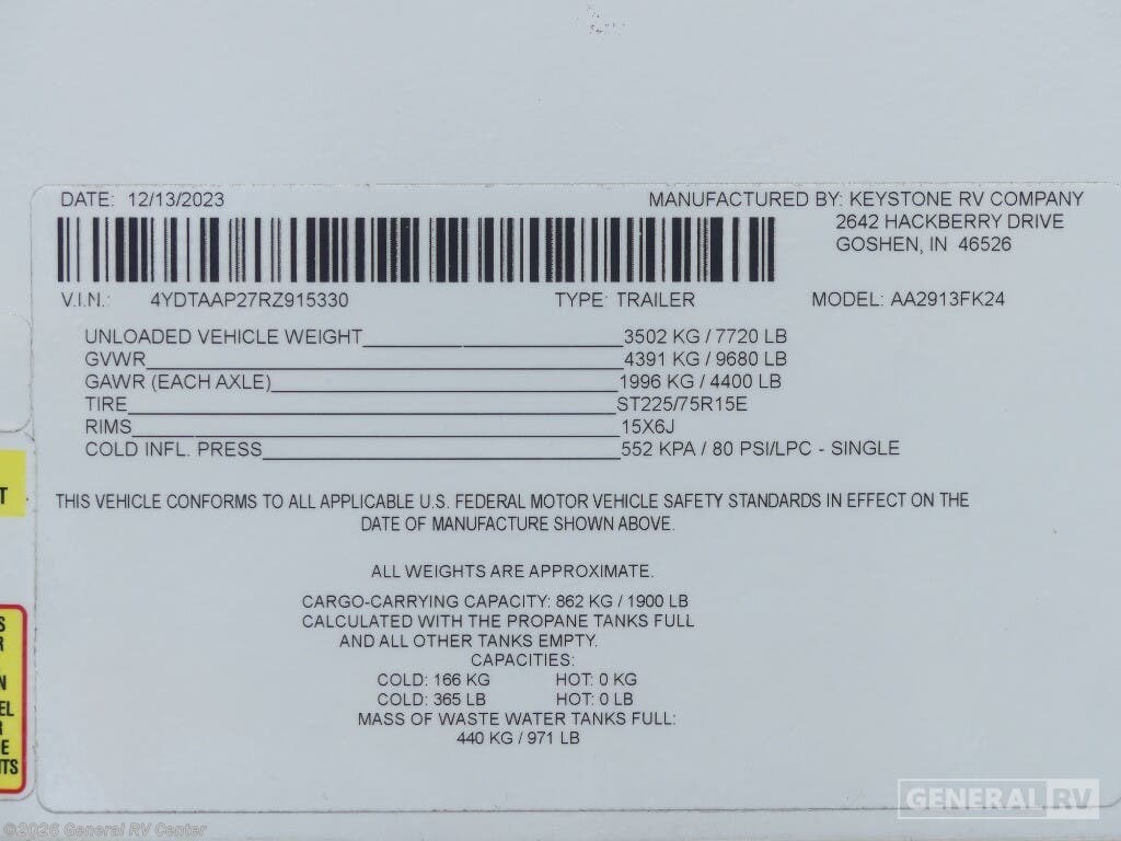 Discover the 2024 Dutchmen Astoria 2913FK, where innovation meets comfort in a beautifully designed travel trailer. This model invites you to unwind with its cleverly arranged front kitchen, featuring a full-size electric refrigerator, a sleek farm-style sink, and a convenient pull-out trash system. The three-burner cooktop ensures you have all the culinary capabilities you need, while the ample pantry space keeps your essentials neatly organized. Picture yourself enjoying meals at the convertible U-shaped dinette, which seamlessly transitions into additional sleeping space when needed. The Astoria 2913FK doesn't just stop at a luxurious kitchen; it extends its comfort to a spacious center living area equipped with a tri-fold sofa, perfect for relaxing or entertaining guests. The rear bedroom offers a king-sized bed, ensuring restful nights under the stars. With the convenience of washer/dryer prep, staying fresh on the road is a breeze. An 18-foot powered retractable awning provides the perfect outdoor retreat, complete with an outdoor refrigerator for easy access to refreshments. With its automatic heater system and generous water capacities, this RV is designed to keep you comfortable on every adventure. Ready to explore the Astoria 2913FK in person? Visit your nearest General RV dealership to experience the charm and functionality of this exceptional RV firsthand.