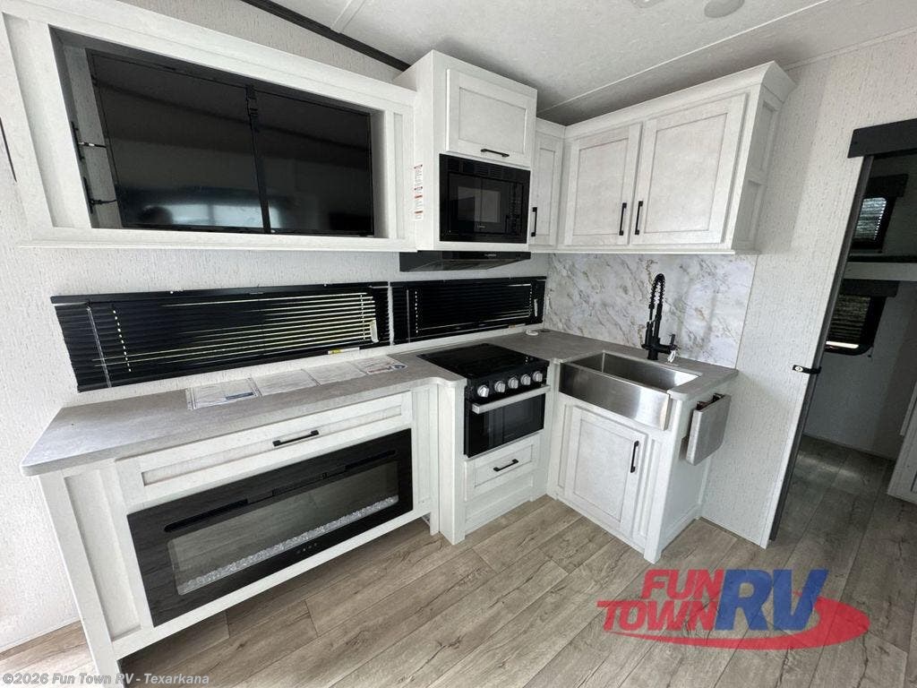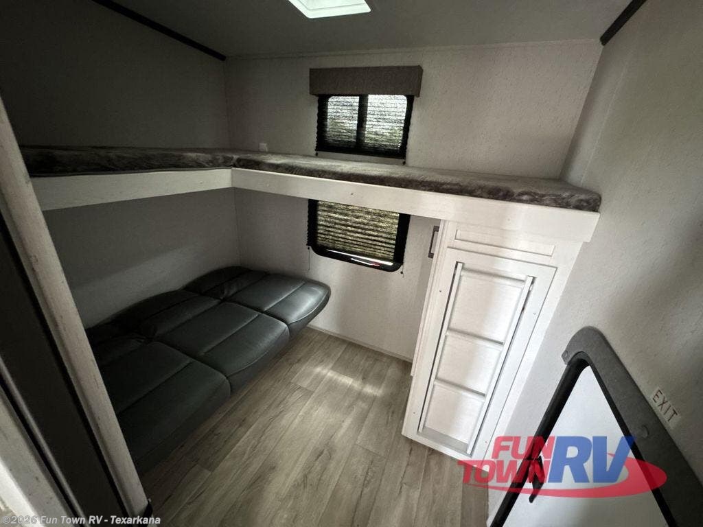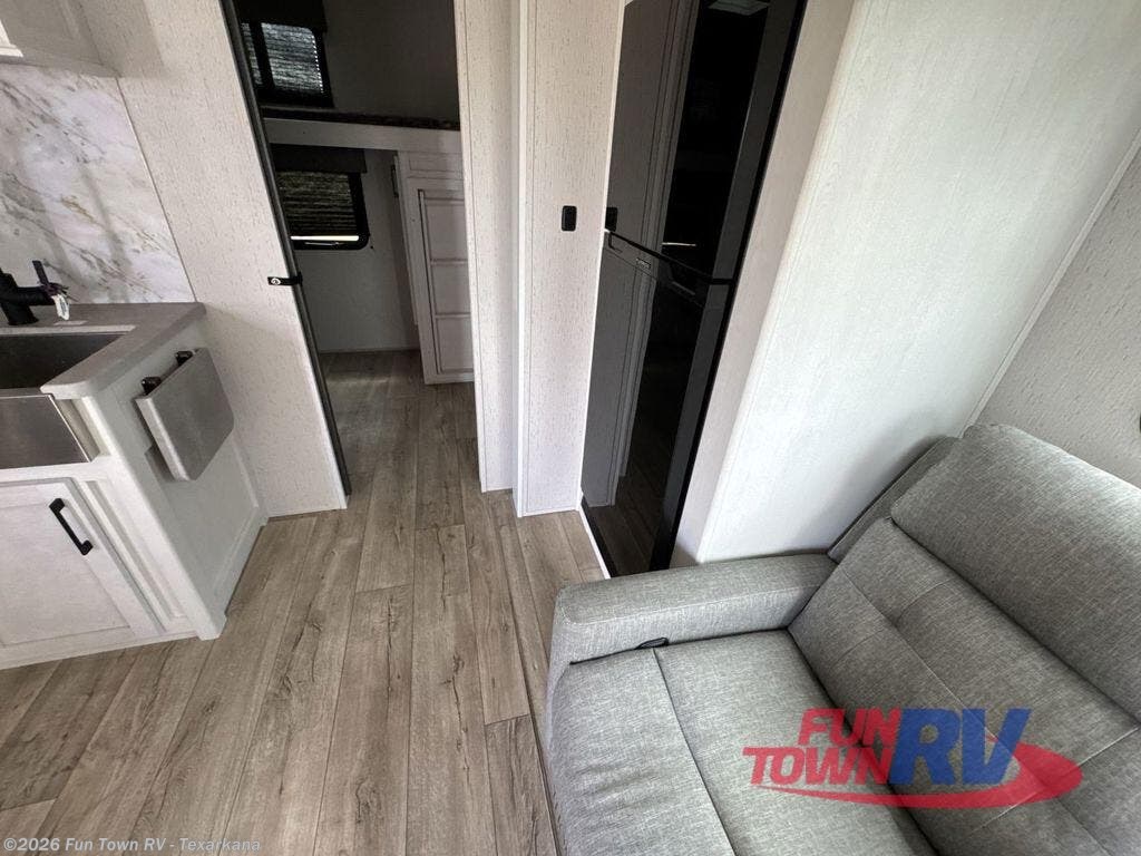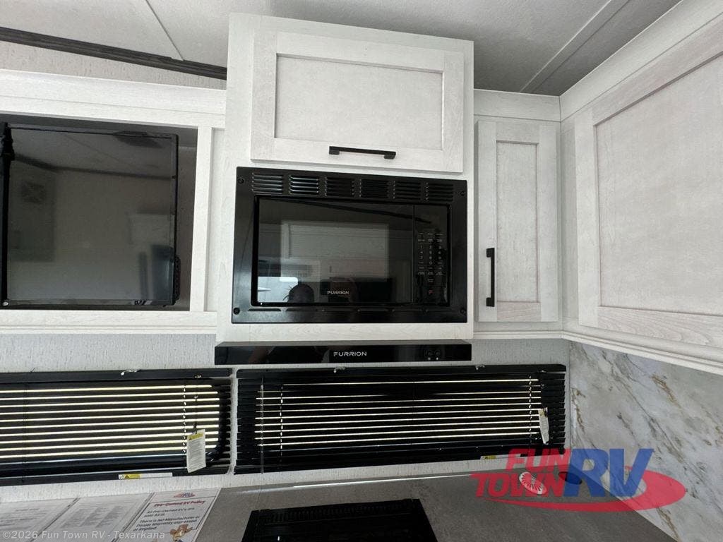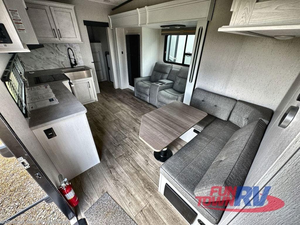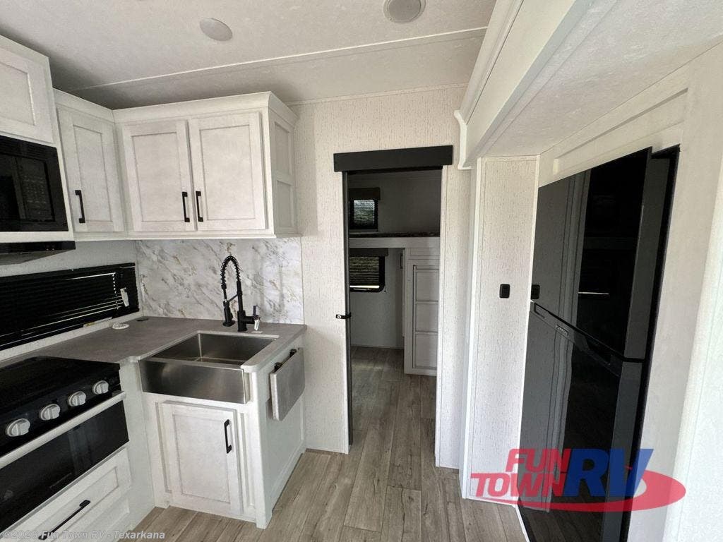 You'll enjoy every minute in this cozy fifth wheel. There is a front private bedroom with a queen bed, dual closets, and a closet with washer and dryer prep that will make your space feel just like home. Your guests will love having the rear private bunkhouse to themselves with three bunks, and there is a full bath on board so everyone can stay clean throughout your trip. The theater seating slide out in the living area/kitchen will provide more space to move about, plus there is a cafe dinette for more seating and dining space. An extra guest or two could even sleep on these areas! The chef of your group will find a full kitchen with a farm style sink, 10 cu. ft. double door refrigerator, and three burner range with a 21" oven.