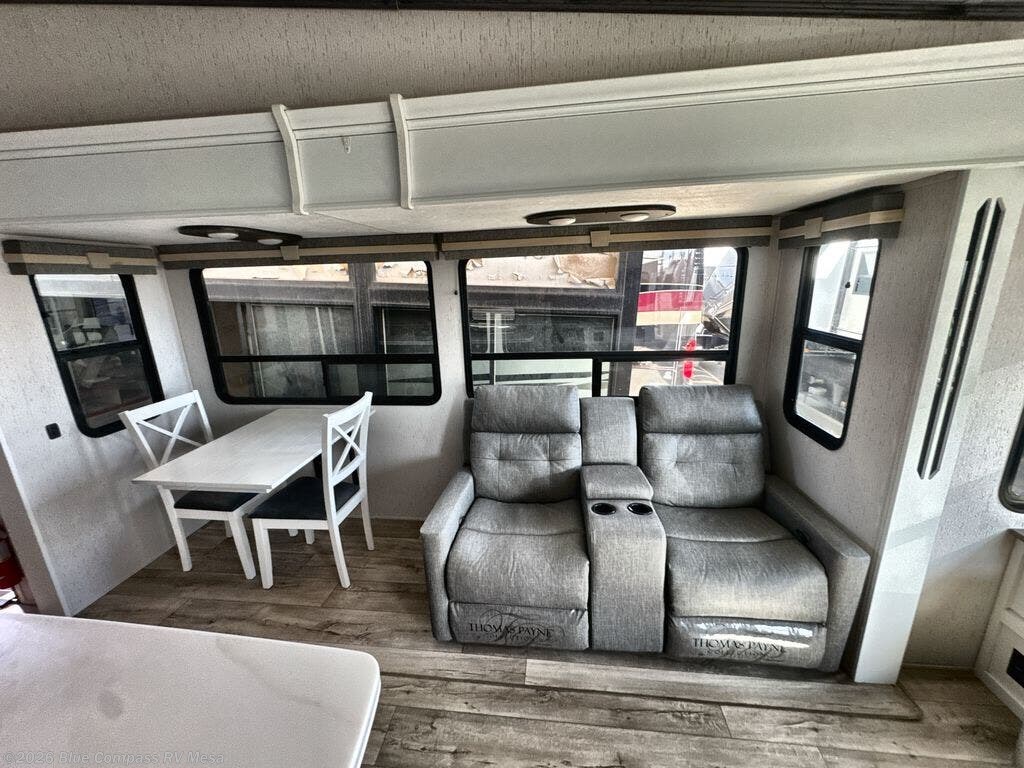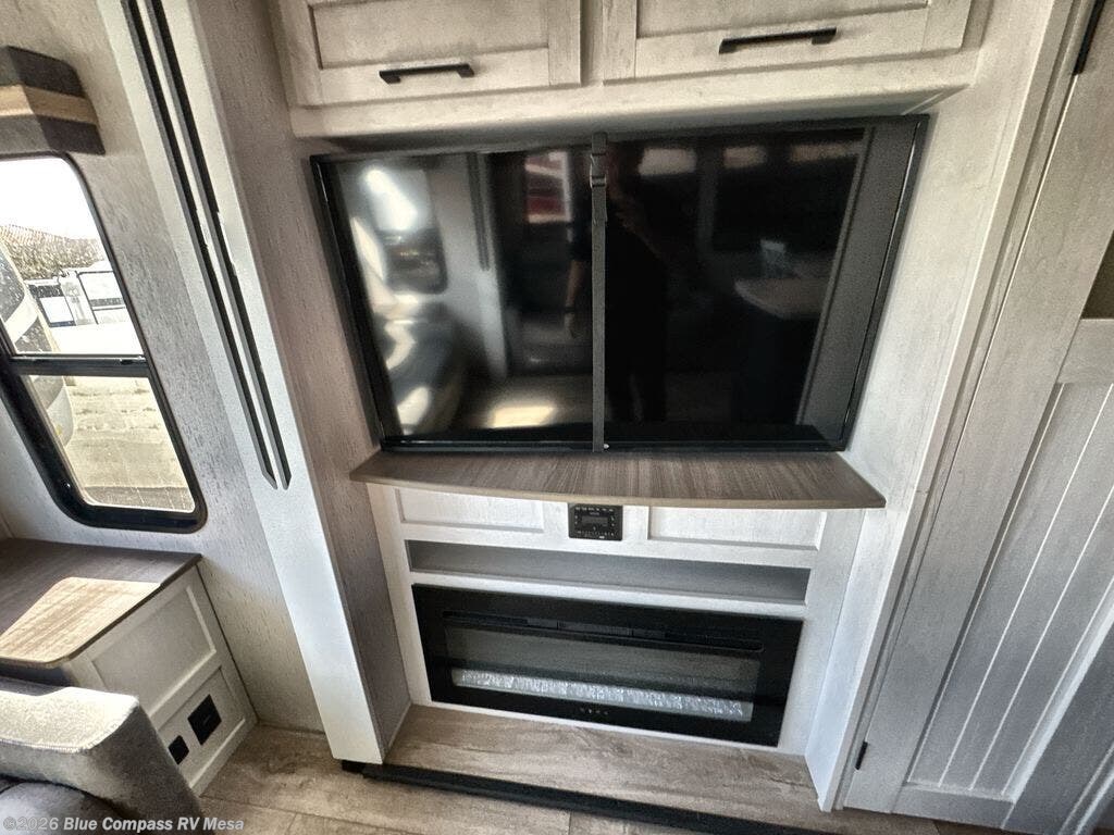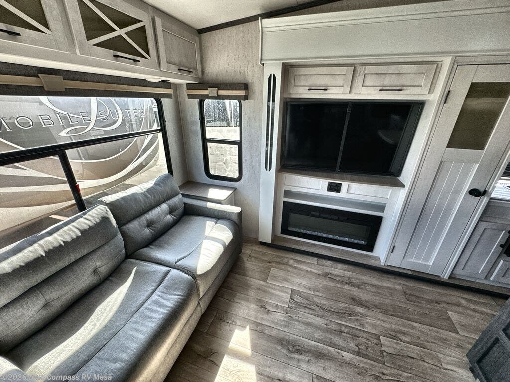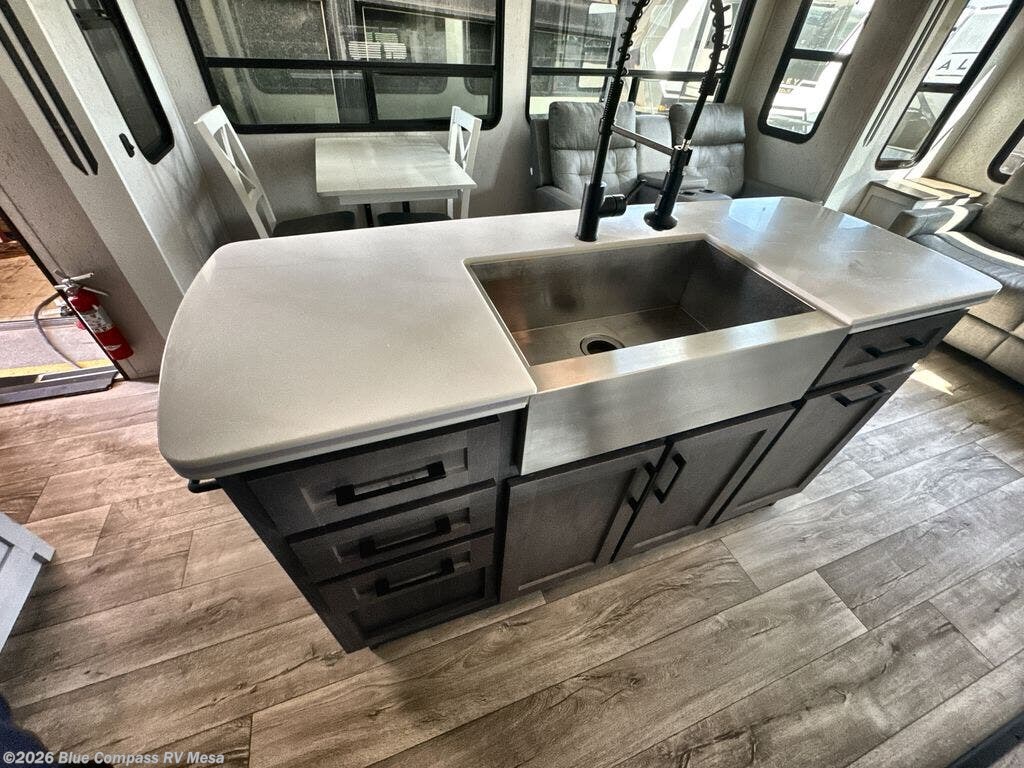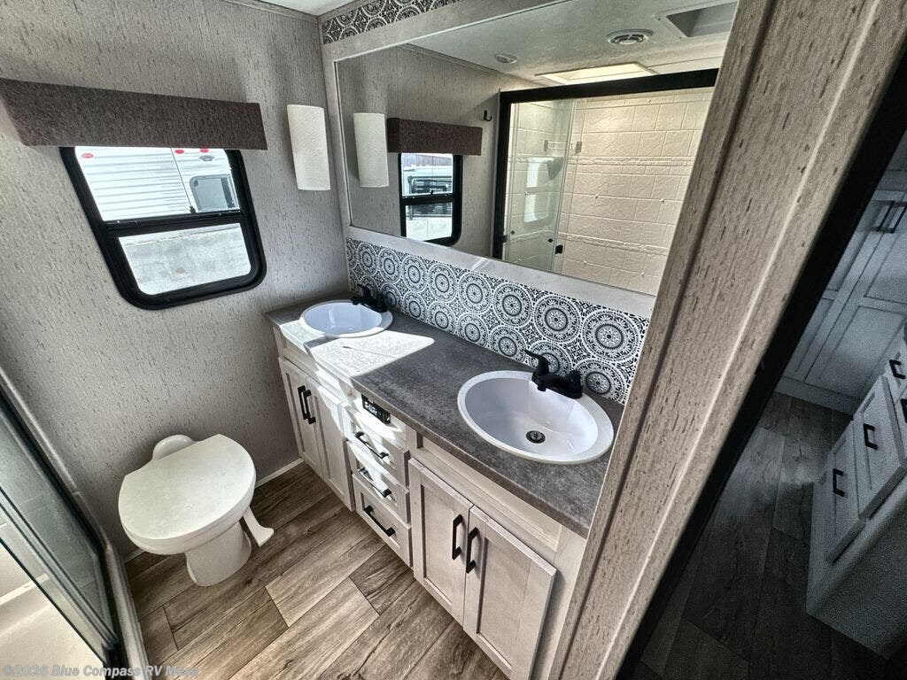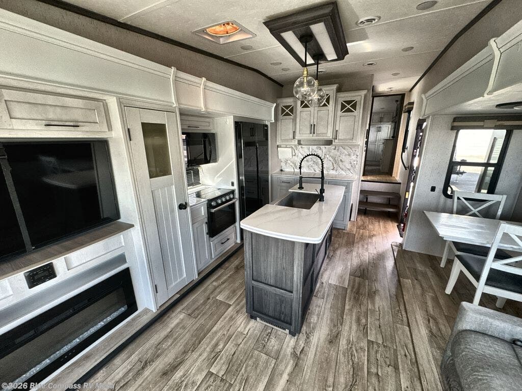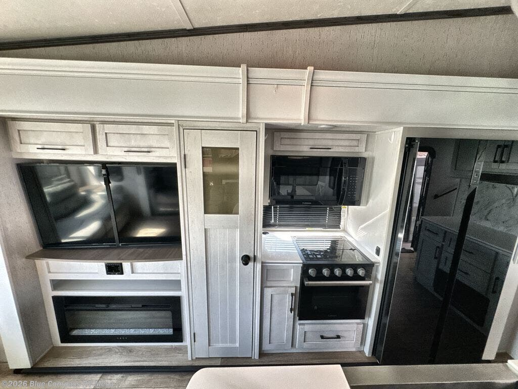 Two can get ready at once with a dual sink vanity in the full bathroom of this fifth wheel! Enjoy a good night's rest and interior space with the king bed slide in the front private bedroom which also has a front wardrobe to keep your clothes looking their best, and a closet with washer/dryer prep. The chef will have an easy time preparing meals in the kitchen with the island, the extra countertop space below the hutch, and the glass top three burner cooktop with 21" oven. The rear living area has a tri-fold sofa and theater seating across from an entertainment center with a fireplace and an HD LED TV!