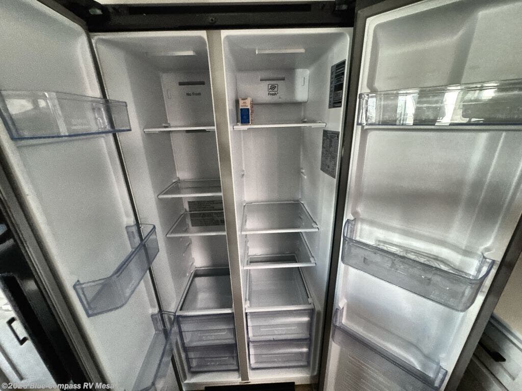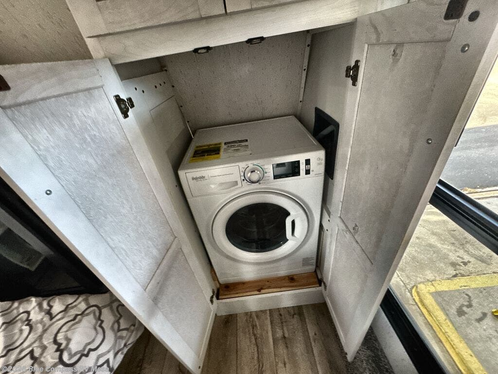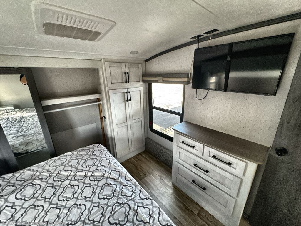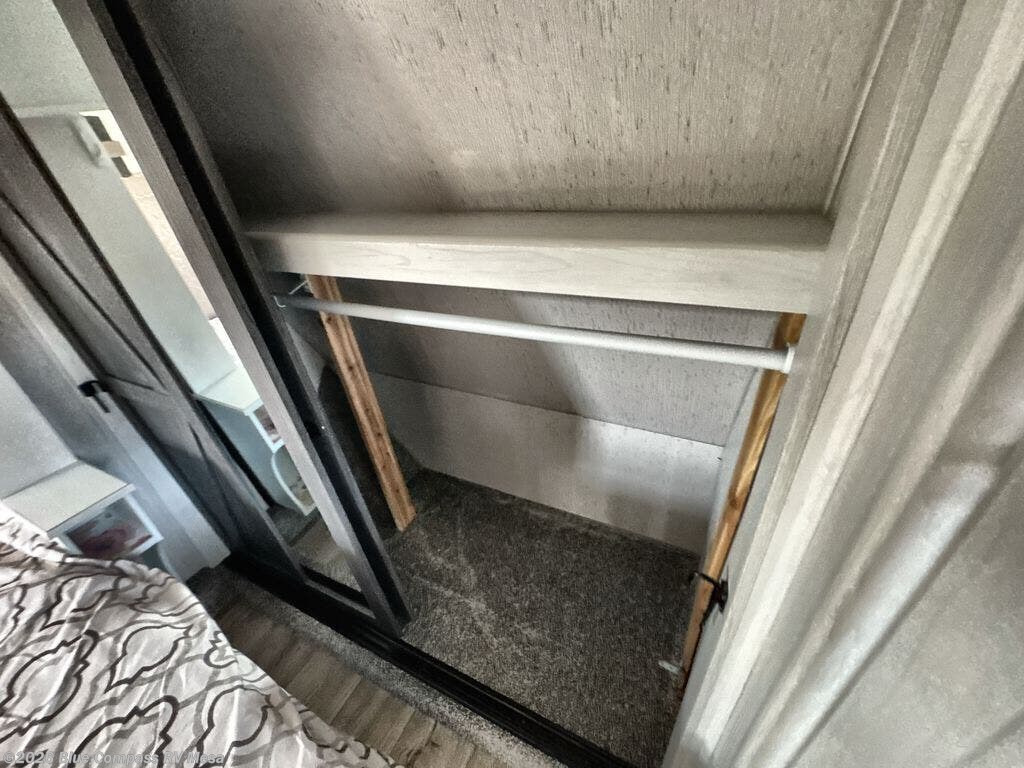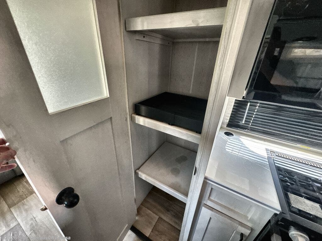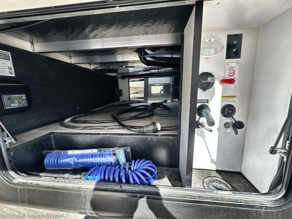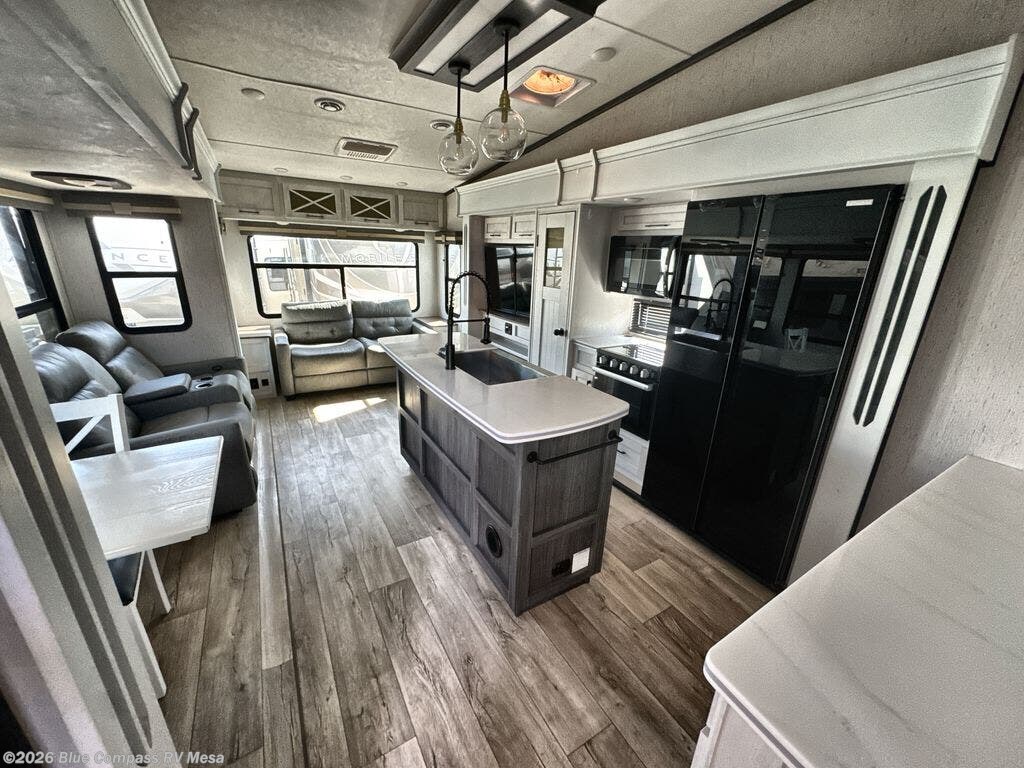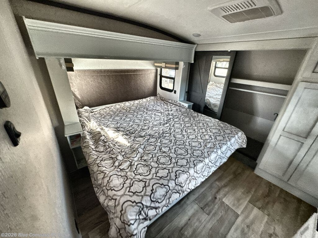 Two can get ready at once with a dual sink vanity in the full bathroom of this fifth wheel! Enjoy a good night's rest and interior space with the king bed slide in the front private bedroom which also has a front wardrobe to keep your clothes looking their best, and a closet with washer/dryer prep. The chef will have an easy time preparing meals in the kitchen with the island, the extra countertop space below the hutch, and the glass top three burner cooktop with 21" oven. The rear living area has a tri-fold sofa and theater seating across from an entertainment center with a fireplace and an HD LED TV!