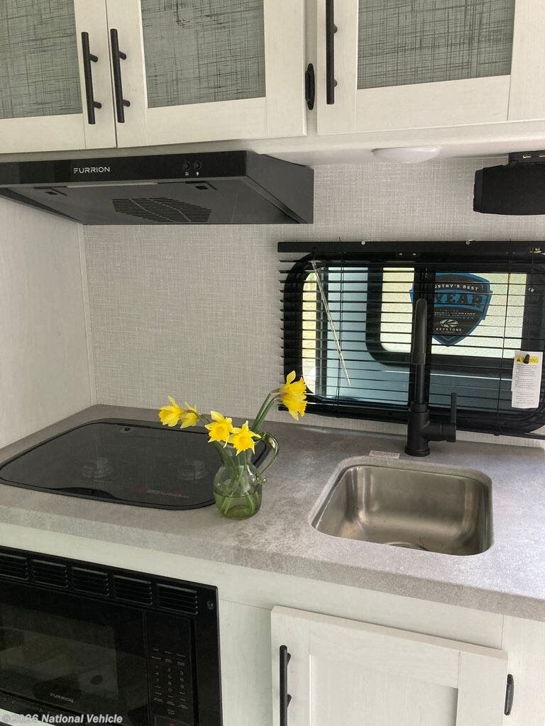 The fully equipped kitchen includes a cooktop, microwave, refrigerator, and stainless-steel sink, allowing you to prepare meals wherever your travels take you. Ample cabinetry and storage compartments ensure you have room for all your camping essentials.